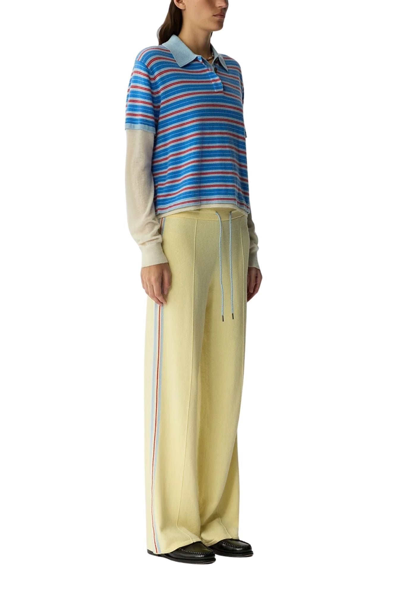 The Layered Stripe Rugby is a women’s light-weight cashmere rugby sweater featuring classic stripe detailing and a double-layer sleeve design. Crafted from 100% cashmere, this striped rugby knit pairs a short-sleeve polo silhouette with featherweight long sleeves for an effortless layered look—easy with denim or styled as a set with the GIR Track Pant.