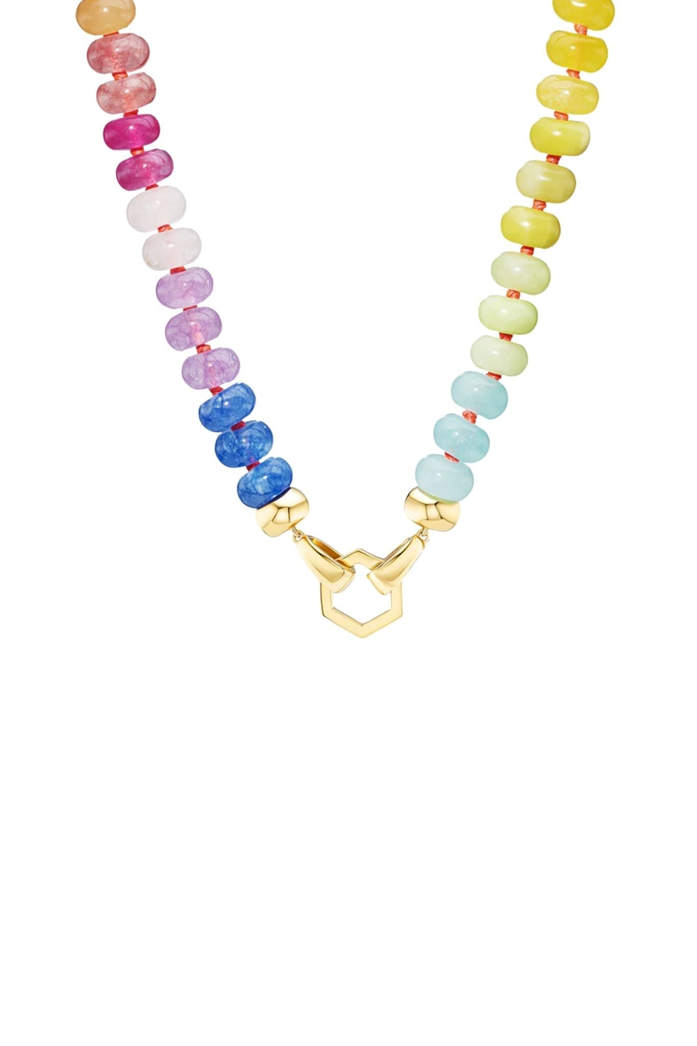 One of our bestsellers, the Rainbow Bead Foundation is made from a variety of individually hand-knotted and hand-chosen gemstone beads on contrasting silk. This necklace can be worn in a multitude of ways: with the Hexagon to the front alone, with the addition of charms, or to the back, allowing the stones to take center stage. Each strand has unique variations due to the use of natural stones and features a solid 18k gold hexagon Foundation jump ring.