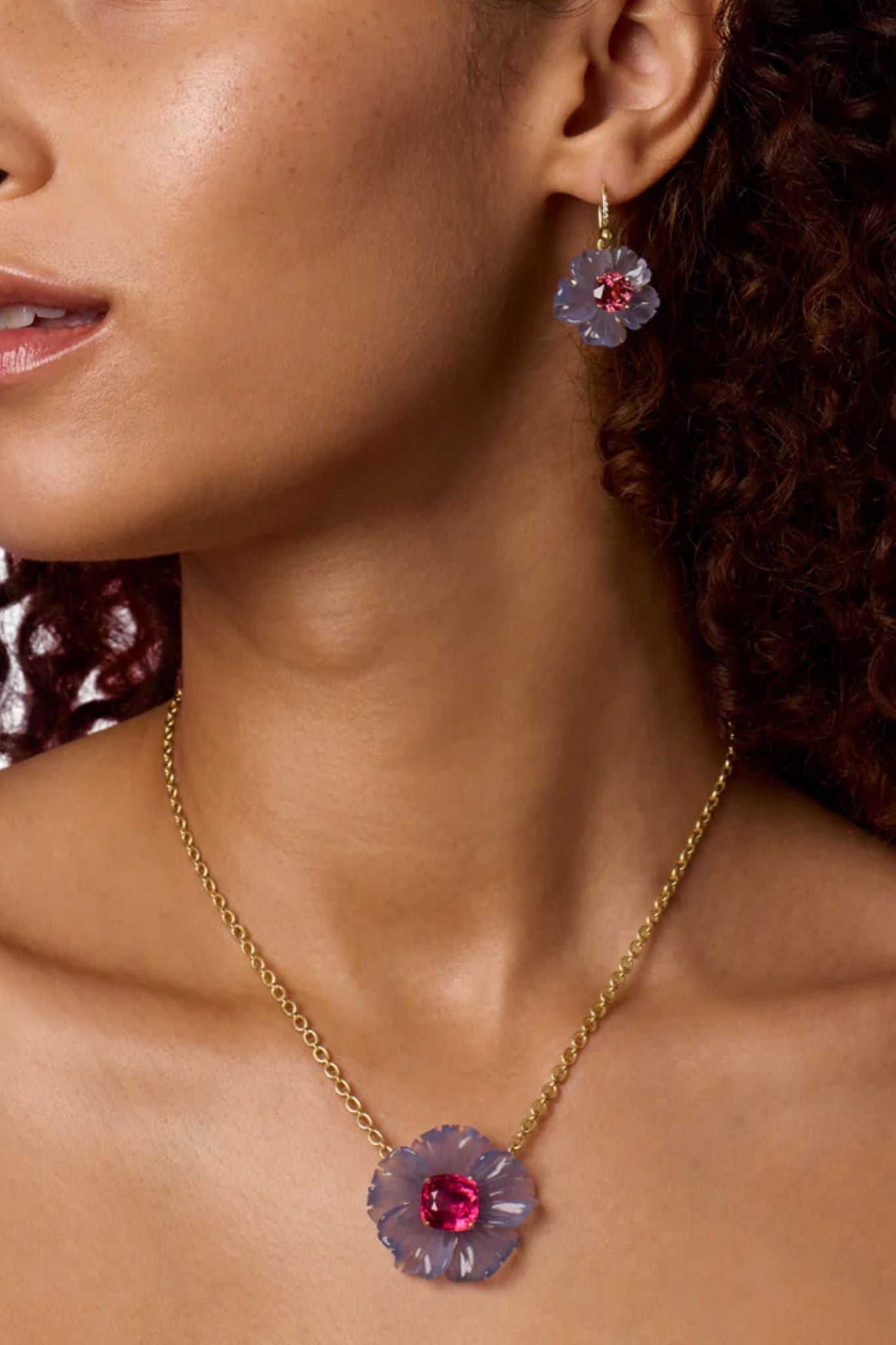 A true one-of-a-kind treasure, the Tropical Flower OOAK Necklace by Irene Neuwirth is crafted in 18k yellow gold and features a hand-carved chalcedony flower centered with a vibrant rubellite stone. The 16-inch length sits beautifully at the collarbone, making it an effortless statement piece. Bold yet romantic, it captures the spirit of natural beauty with an artisanal, heirloom-worthy feel.