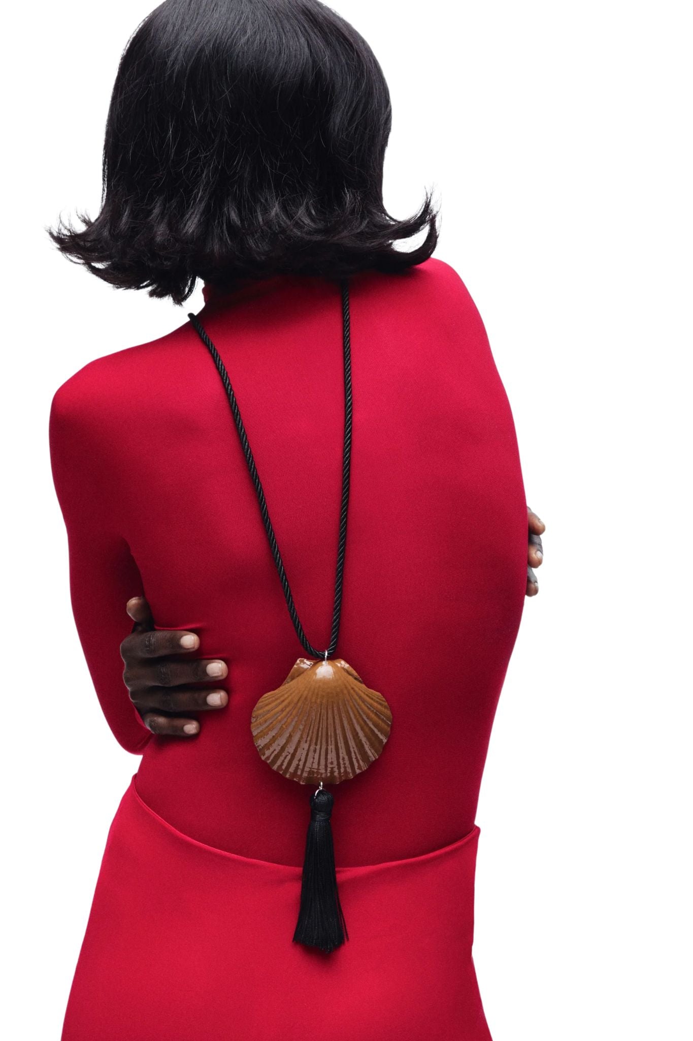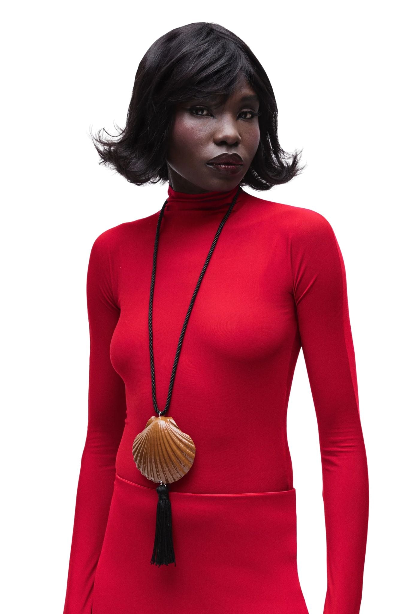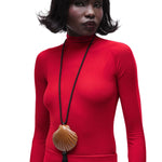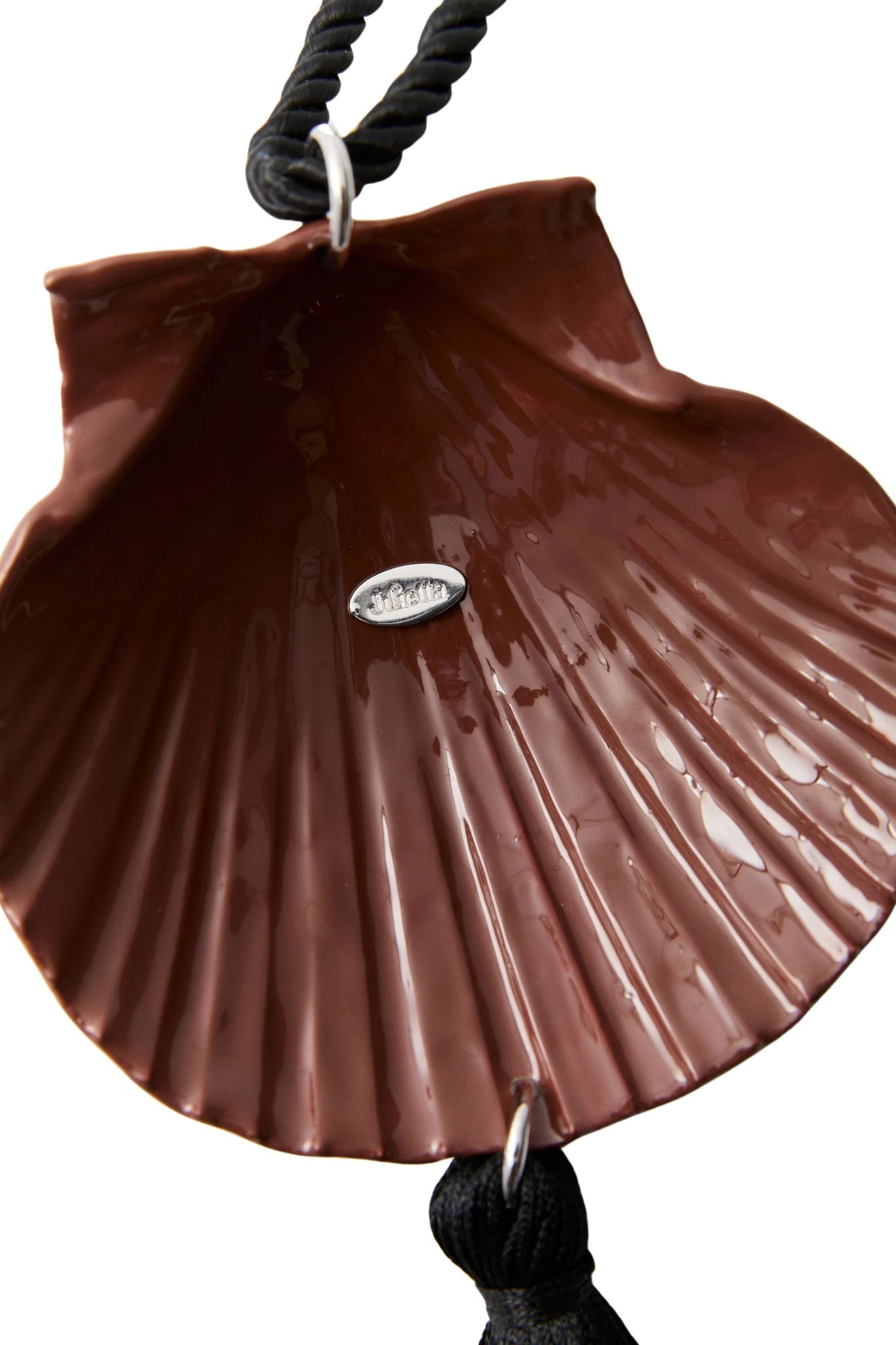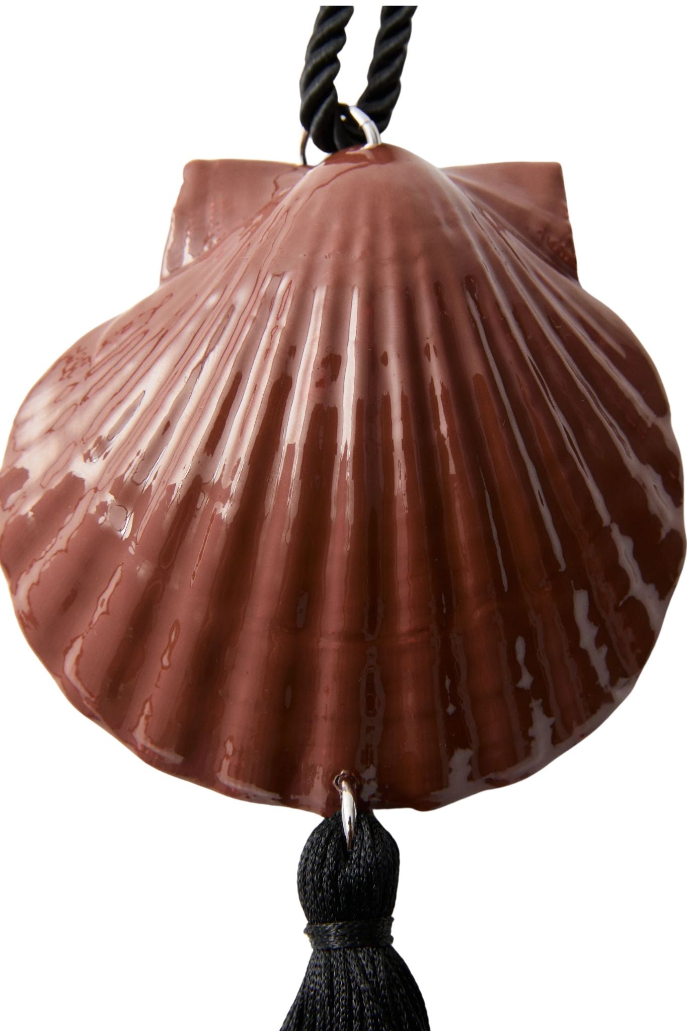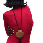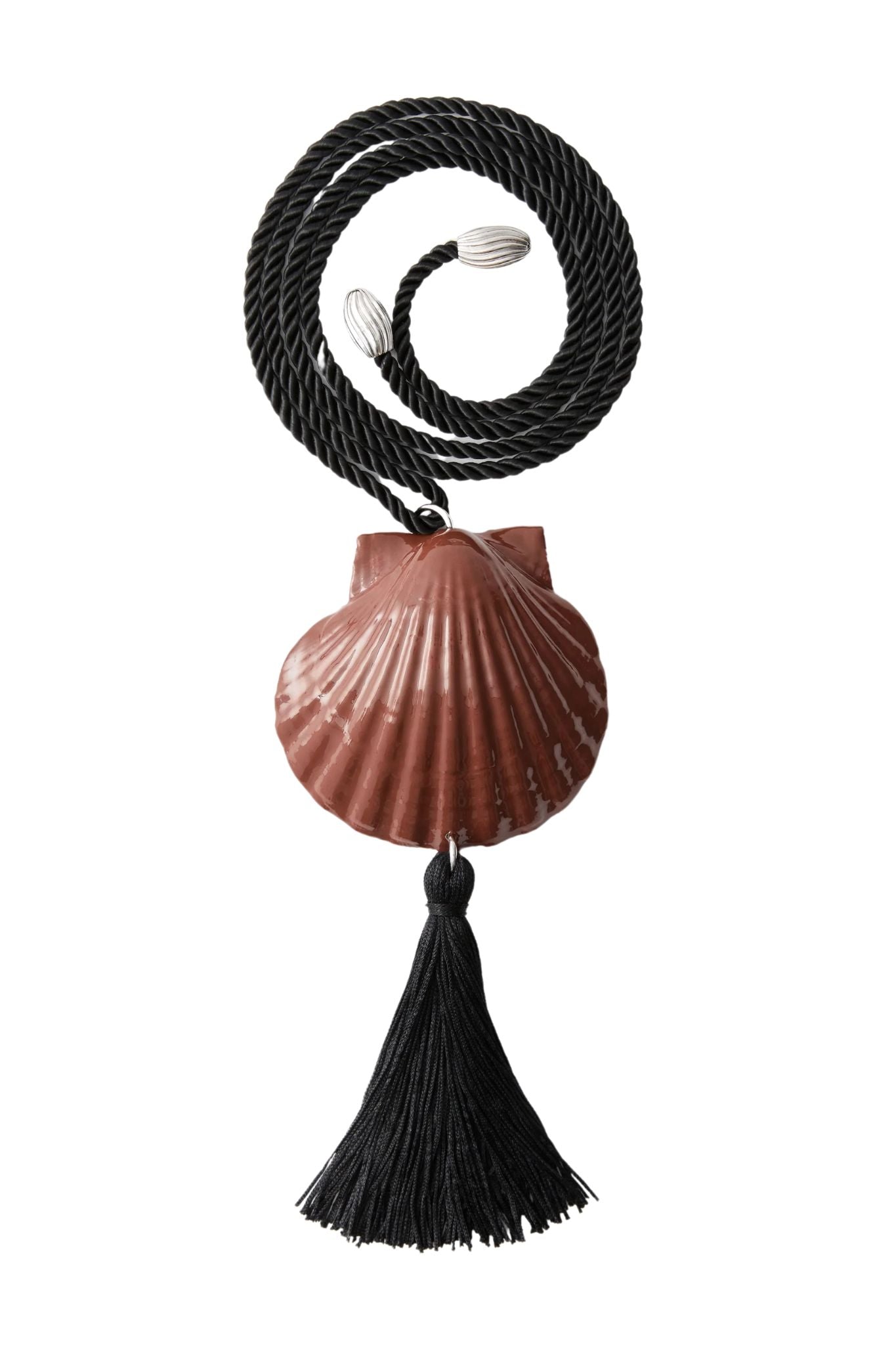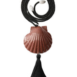 Handmade statement cord necklace featuring an enameled shell and tassel. The cord is adjustable and can be double-wrapped to wear it shorter.
