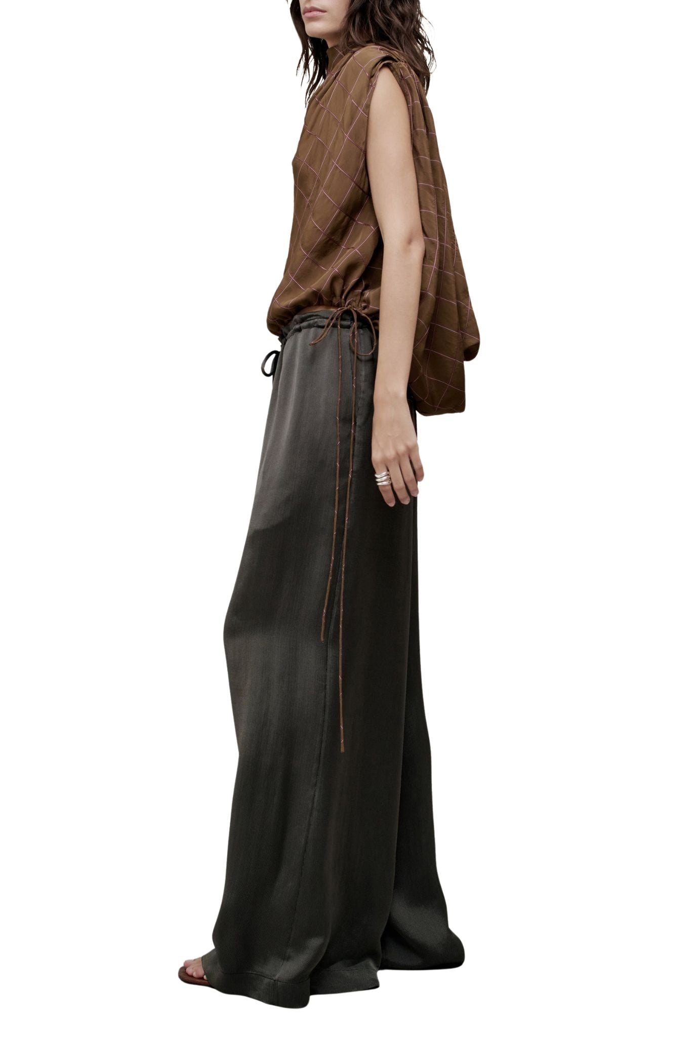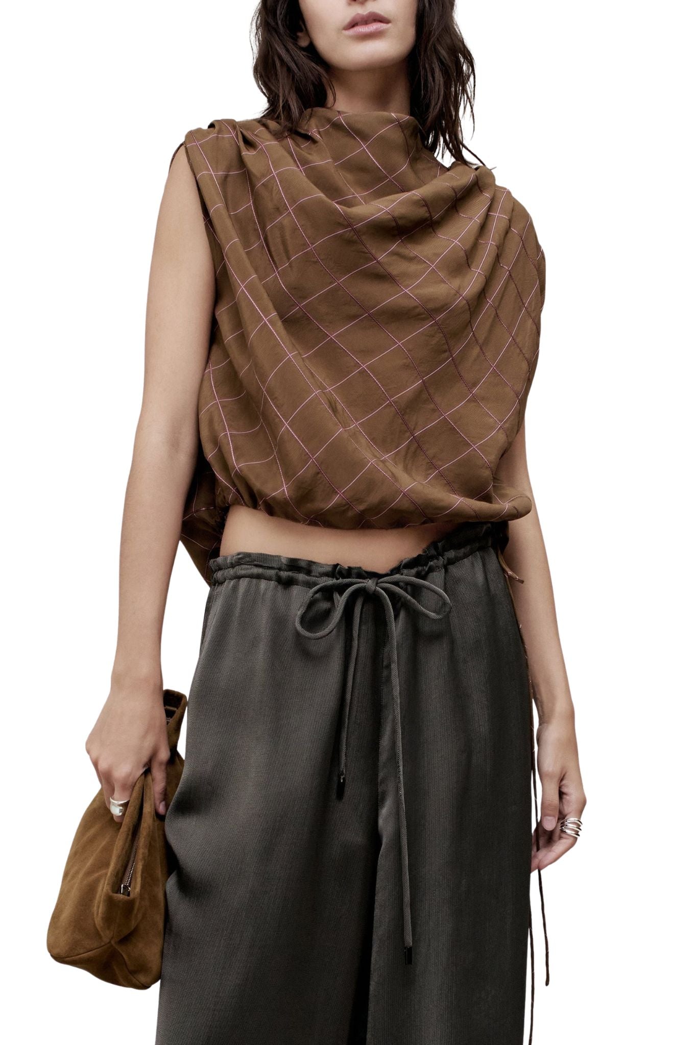 Elegantly designed bubble top featuring voluminous gathers at the shoulders, creating a high cowl neckline at the front and a deep, open cowl back. Includes adjustable spaghetti ties at the back neck and waist, allowing for a customized fit around the midriff. Made in elevated plaid viscose.