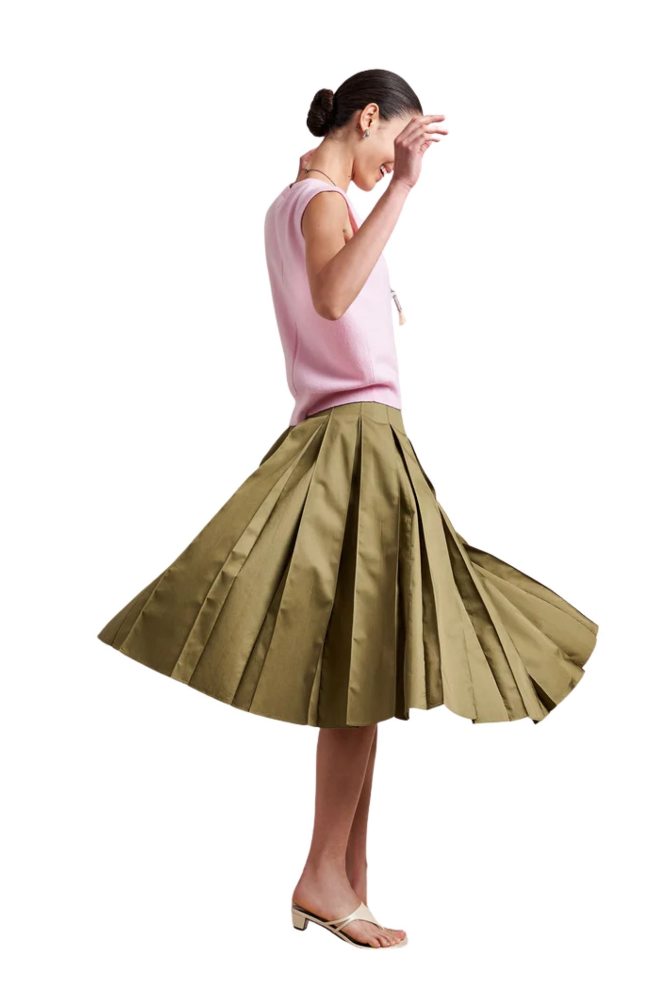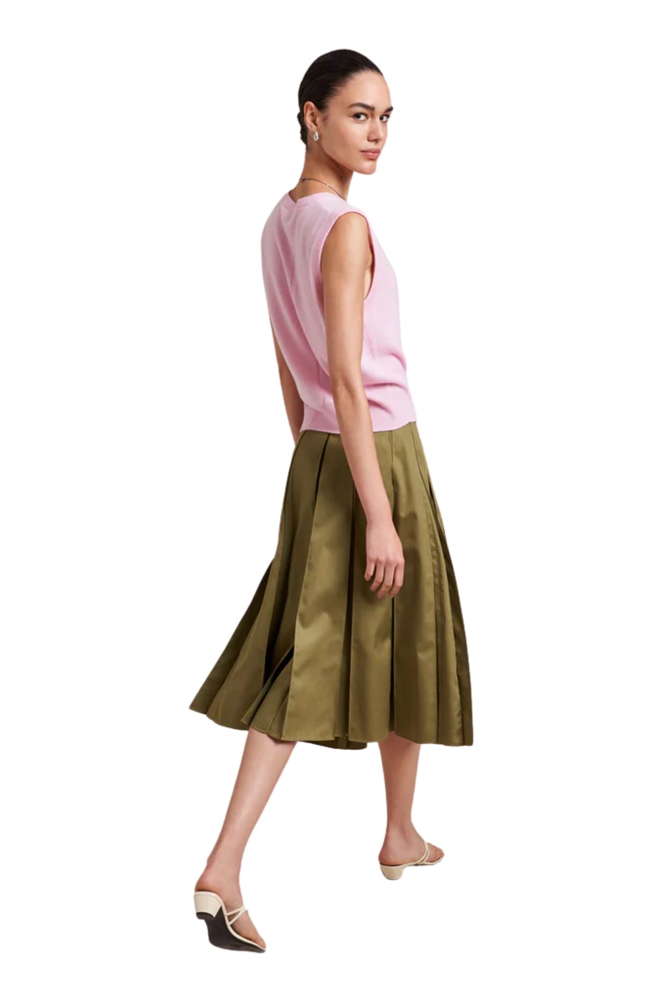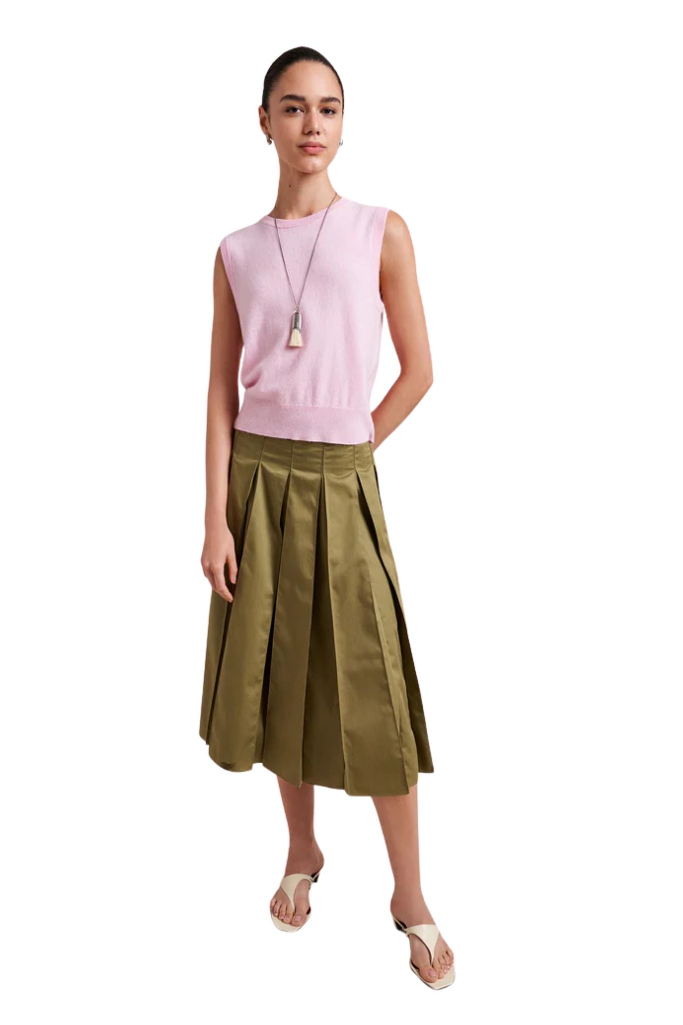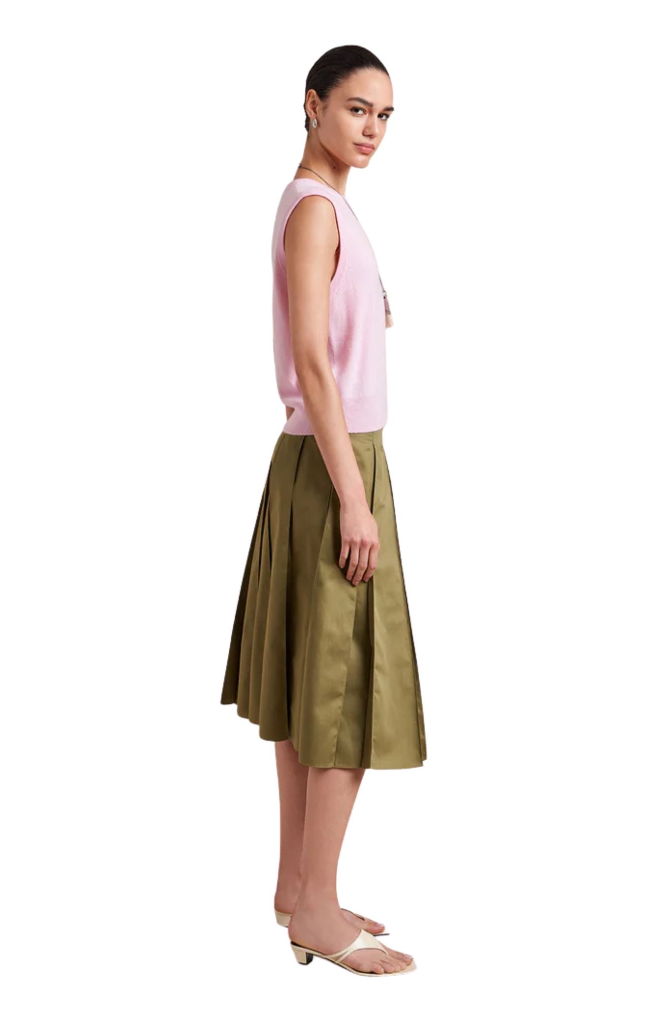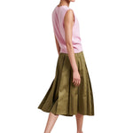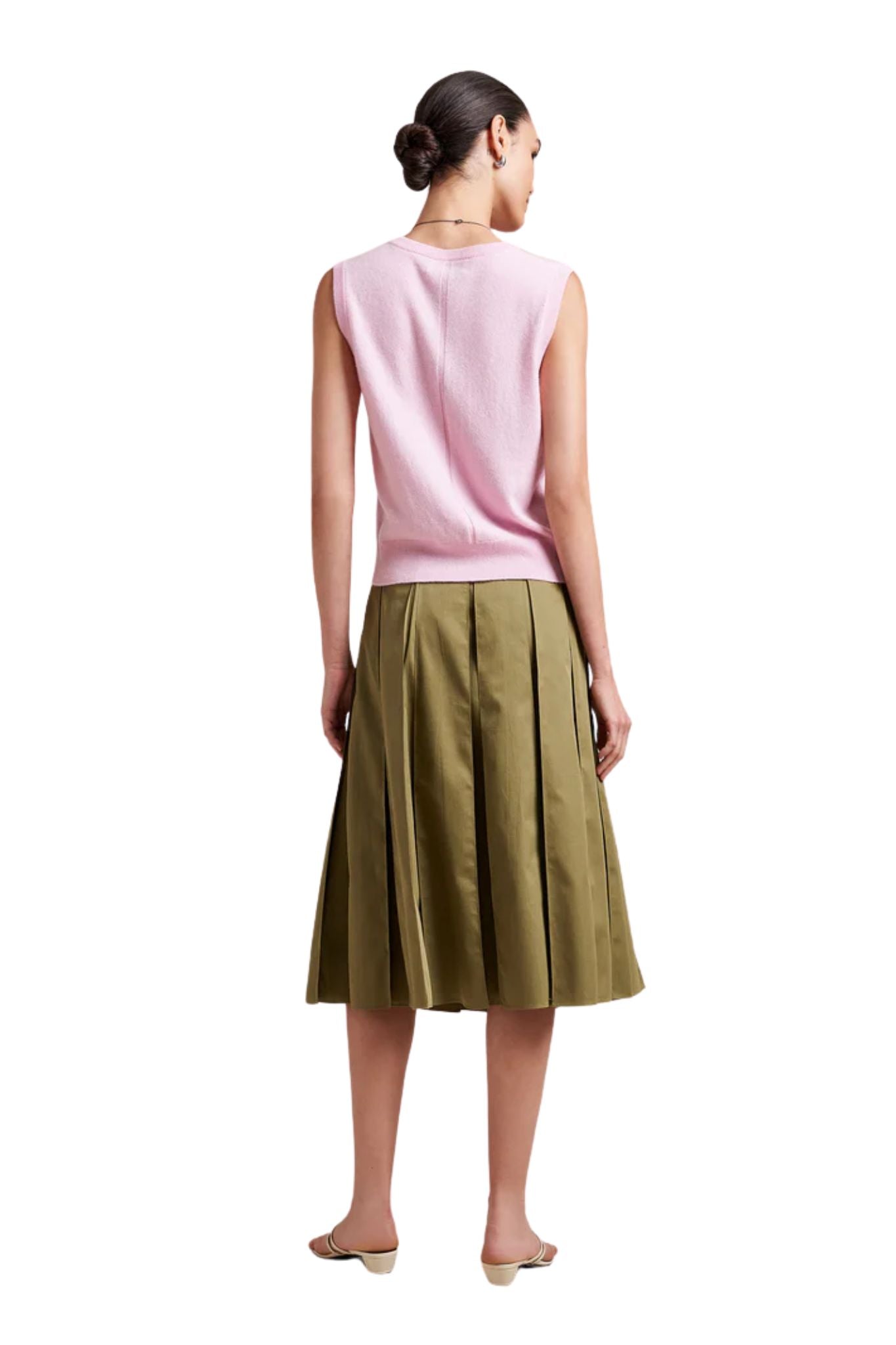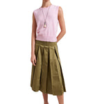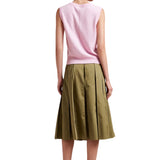 A study in subtle structure, the Cora Skirt is a box-pleated beauty that adds just the right amount of flair. The inverted pleats are stitched at the top and release at the hip for a clean silhouette that still moves with ease. Finished with a grosgrain ribbon inside the waistband and a side zip for a smooth fit, it hits just below the knee, ideal for dressing up or down. Tuck in a tee or cropped sweater for an easy summer ensemble.