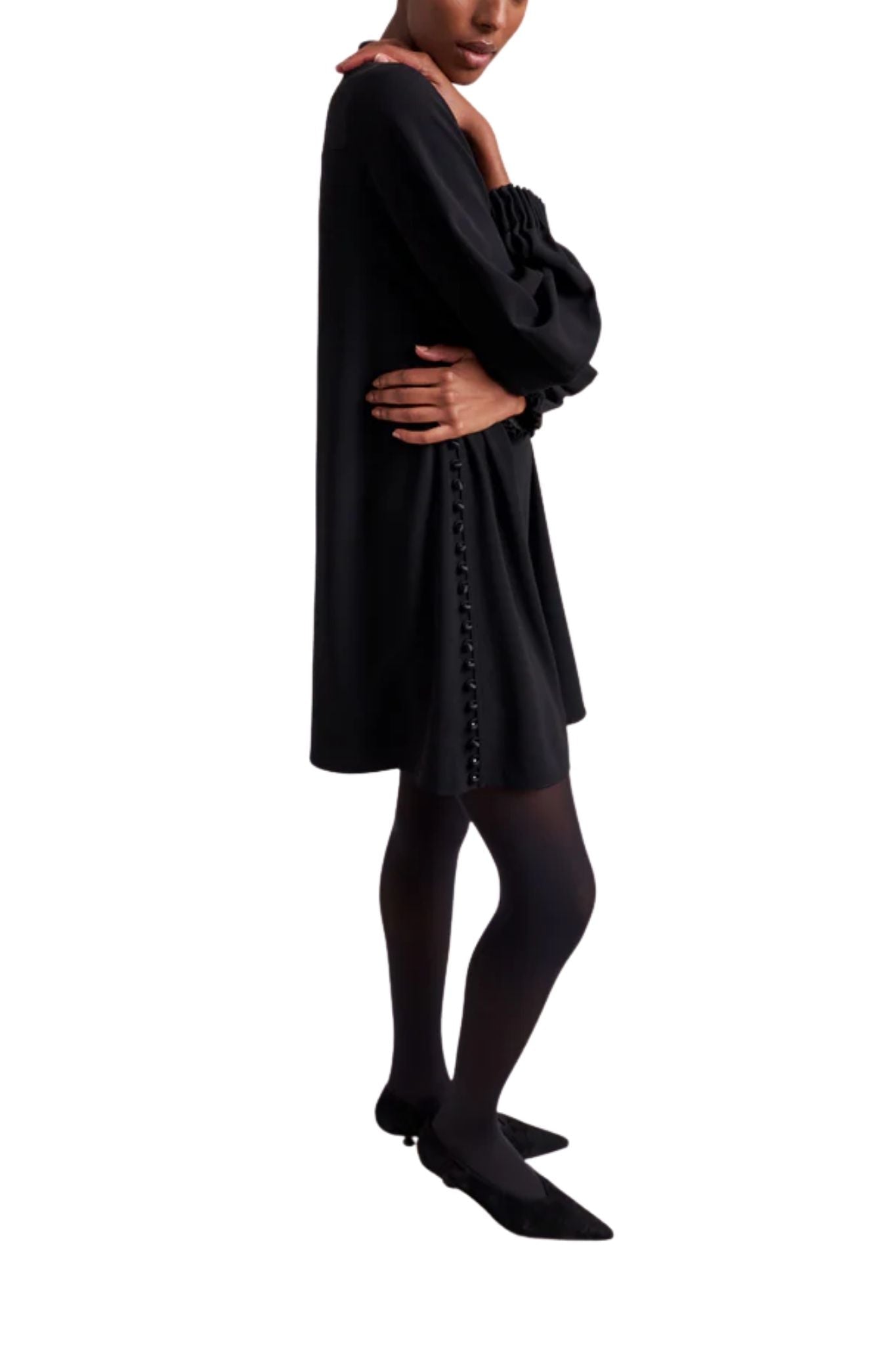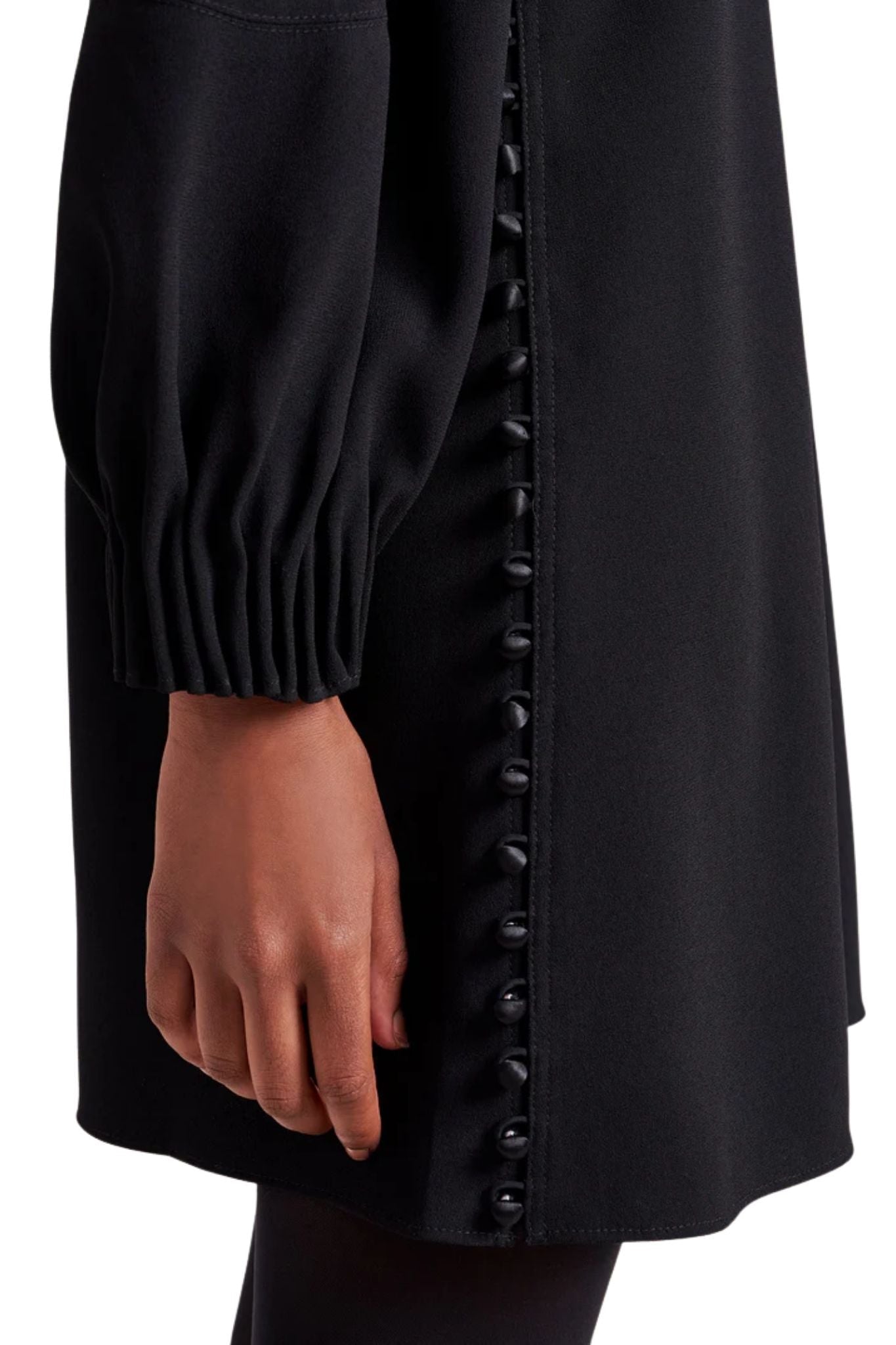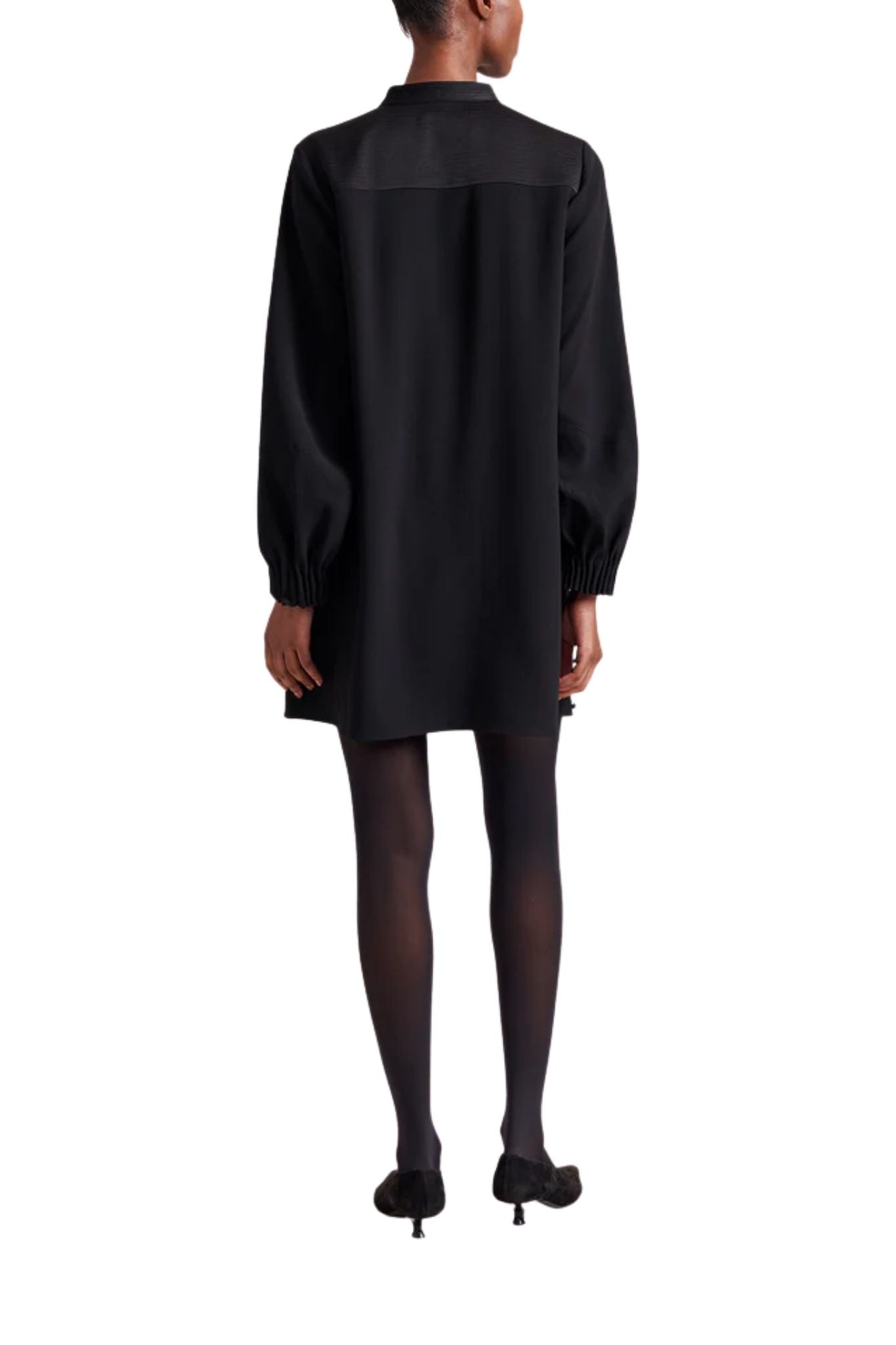 Classic with a twist, our Francine Mini Dress is all about the details, from the U-neckline and trapunto stitching on the stand collar to the pintucks at the cuff and dome buttons on the side seams. This delicate, fluid dress is a mood all its own. Pair back to flats or tall boots, this dress is the ideal day to night transitional piece.