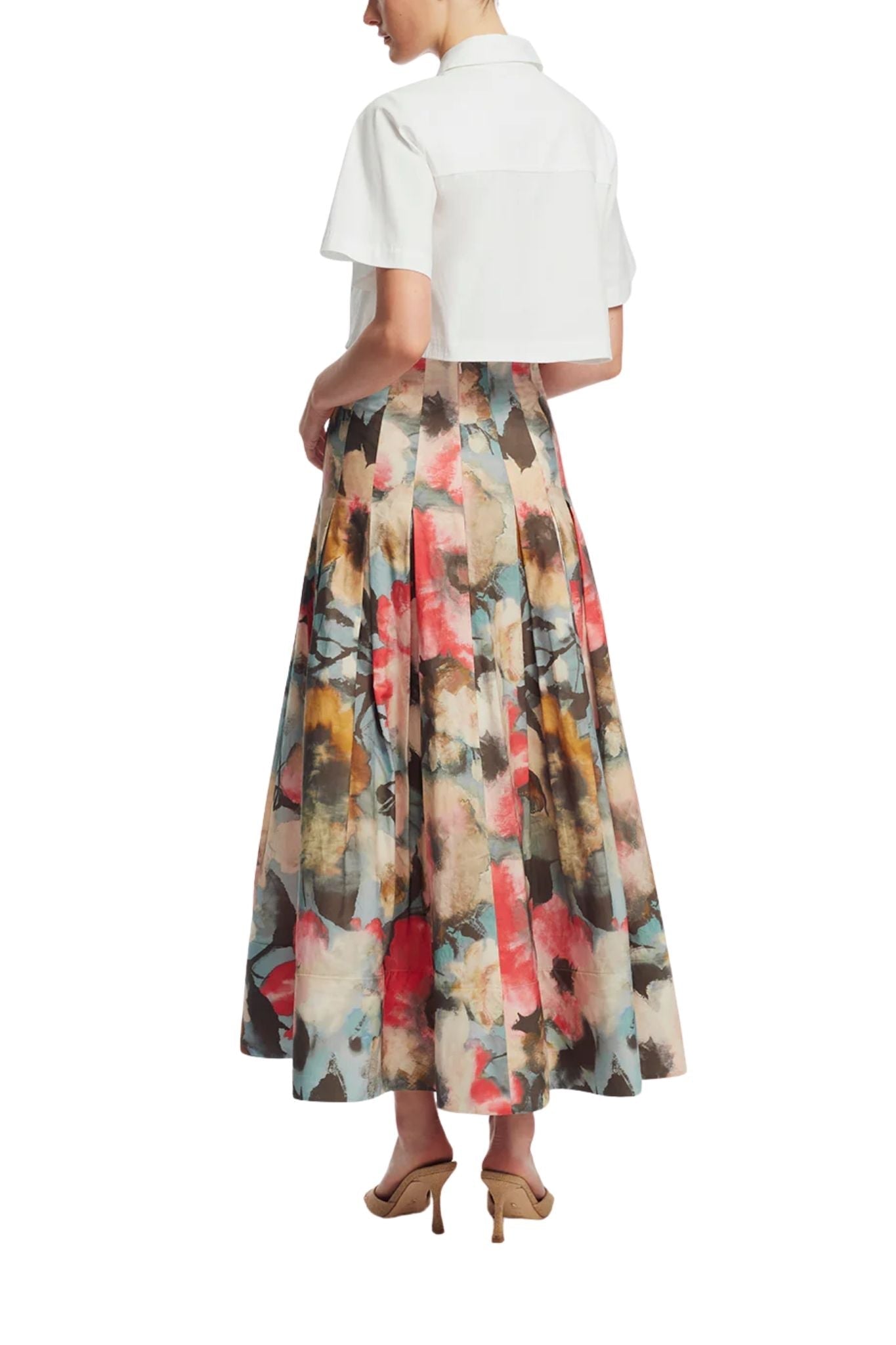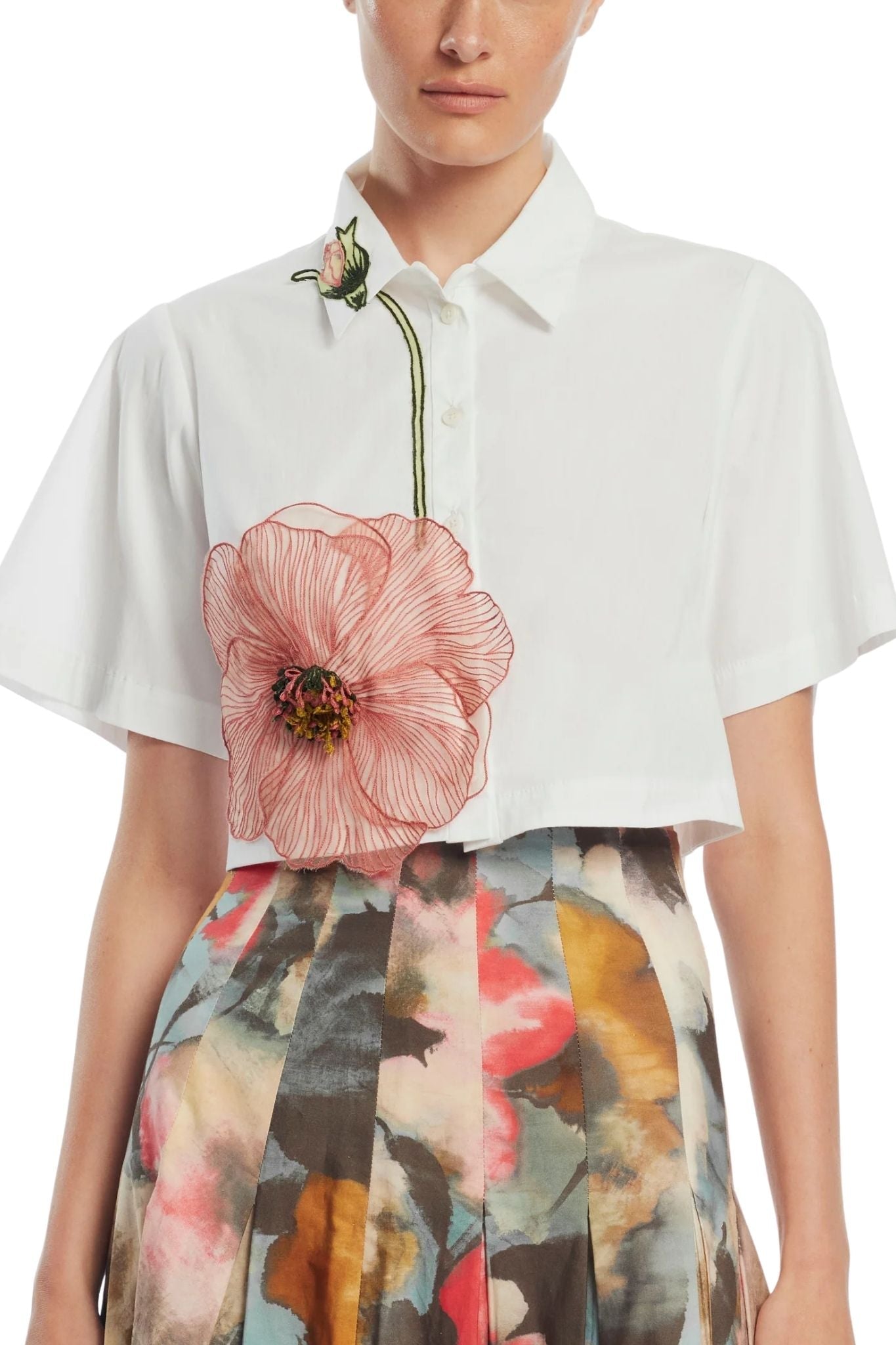 Crafted from crisp cotton poplin with a hint of stretch, this cropped top offers polished structure with feminine detail. Designed with a straight silhouette and classic button-down styling, it is finished with a dimensional embroidered tree peony blossom and bud appliqué. Effortlessly versatile, it pairs beautifully with the season’s full skirts, high-waisted trousers, or tailored separates.