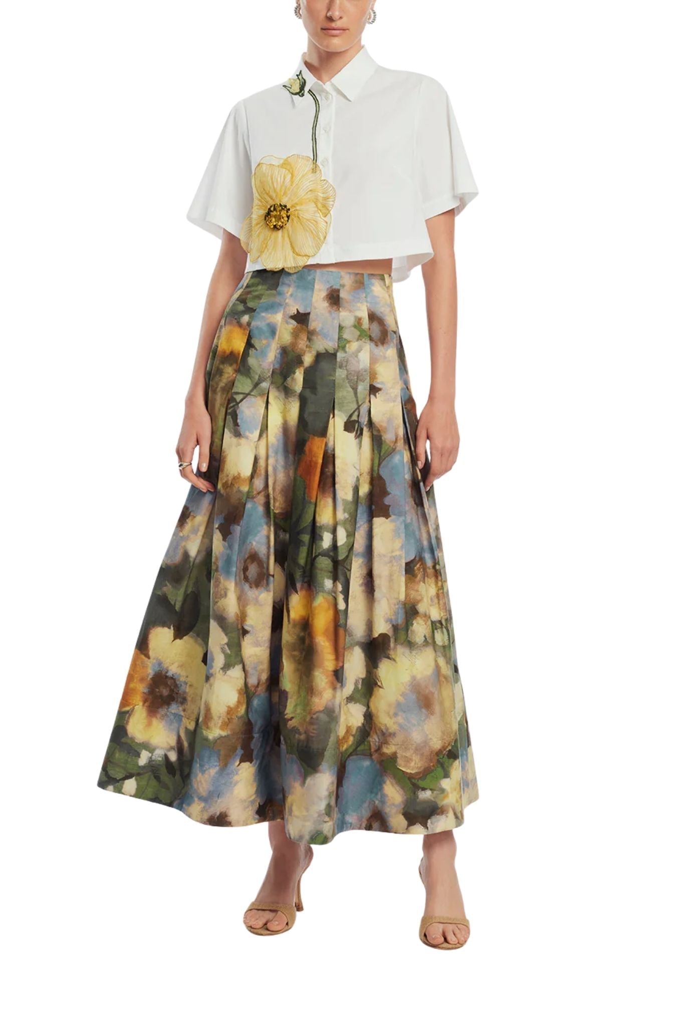 Crafted from crisp cotton poplin with a hint of stretch, this cropped top offers polished structure with feminine detail. Designed with a straight silhouette and classic button-down styling, it is finished with a dimensional embroidered tree peony blossom and bud appliqué. Effortlessly versatile, it pairs beautifully with the season’s full skirts, high-waisted trousers, or tailored separates.