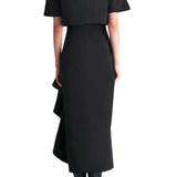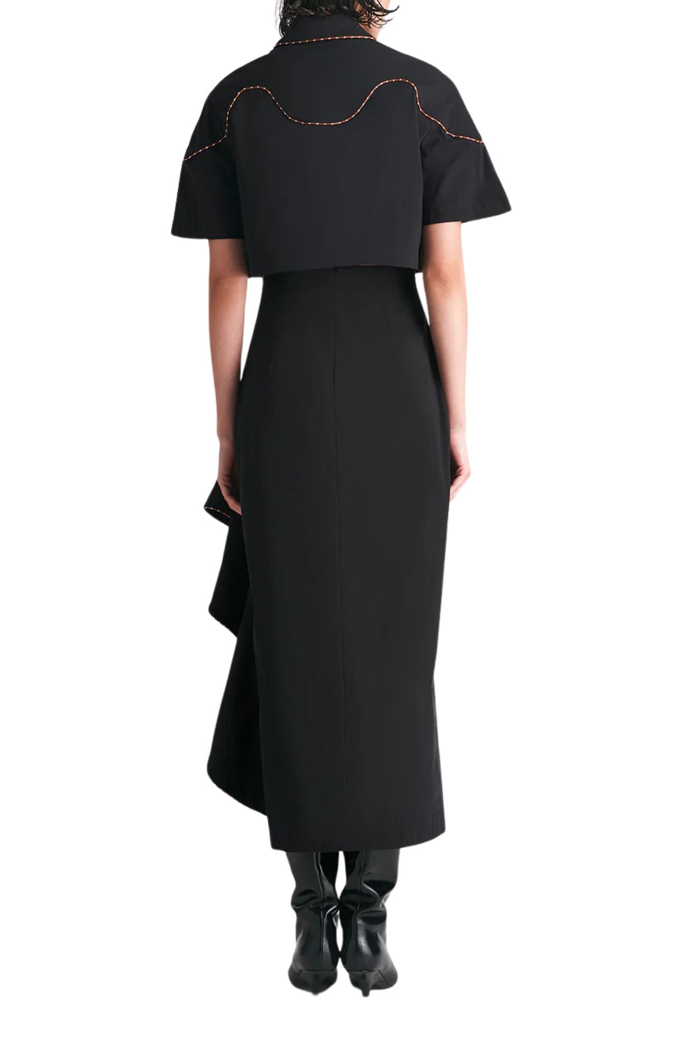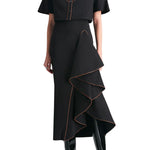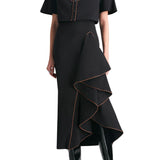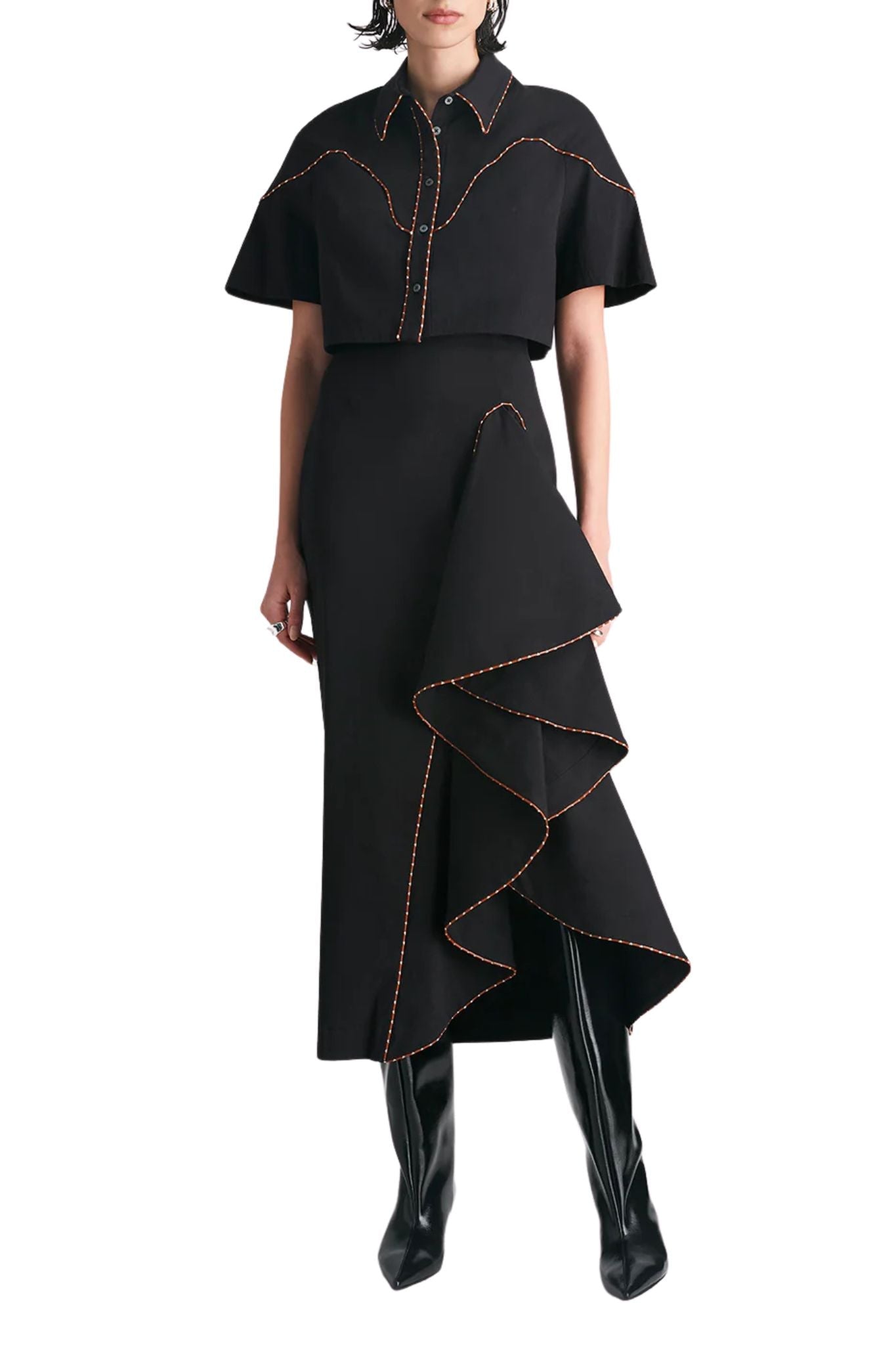 Crafted in fine cotton, the ruffle detail skirt from Lela Rose has a tailored straight-fit column shape, a gather at the hip and a cascading side ruffle detail concealing a subtle slit. The skirt is finished with corded leatherette trim in an elevated buckstitch motif, giving a polished western flair.