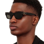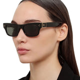 These rectangular framed sunglasses from the LINDA FARROW collection are effortlessly chic. Sculpted from black acetate the highly polished rectangular frames have a slight angle giving them an intriguing edge. Fitted with solid grey ZEISS technology lenses which offer 100% UV protection and unrivalled clarity.