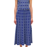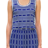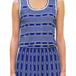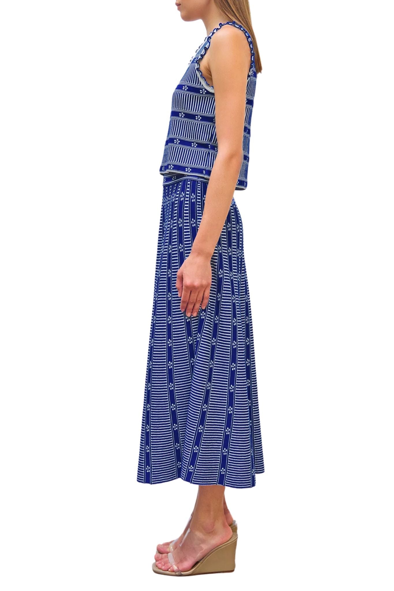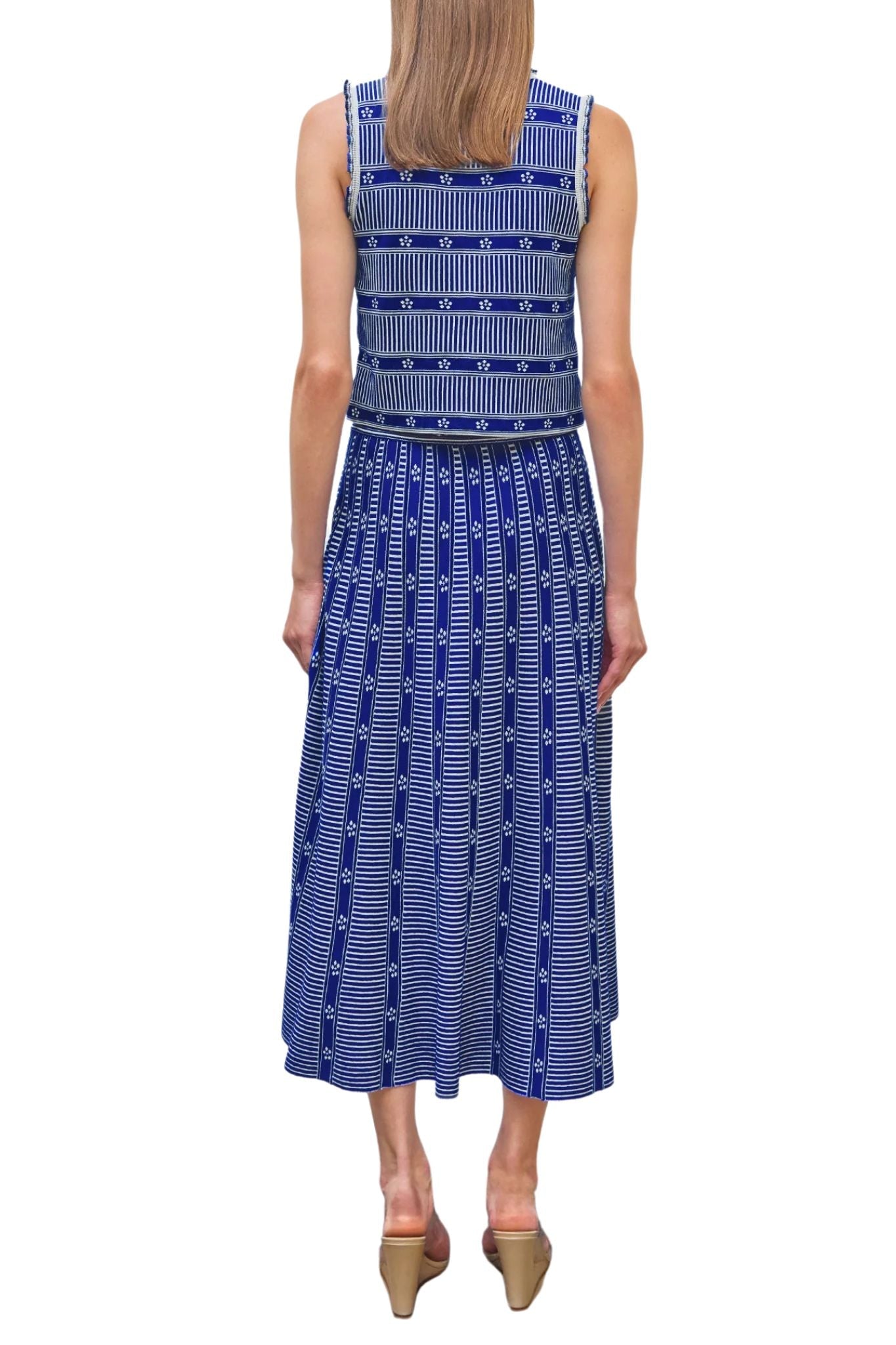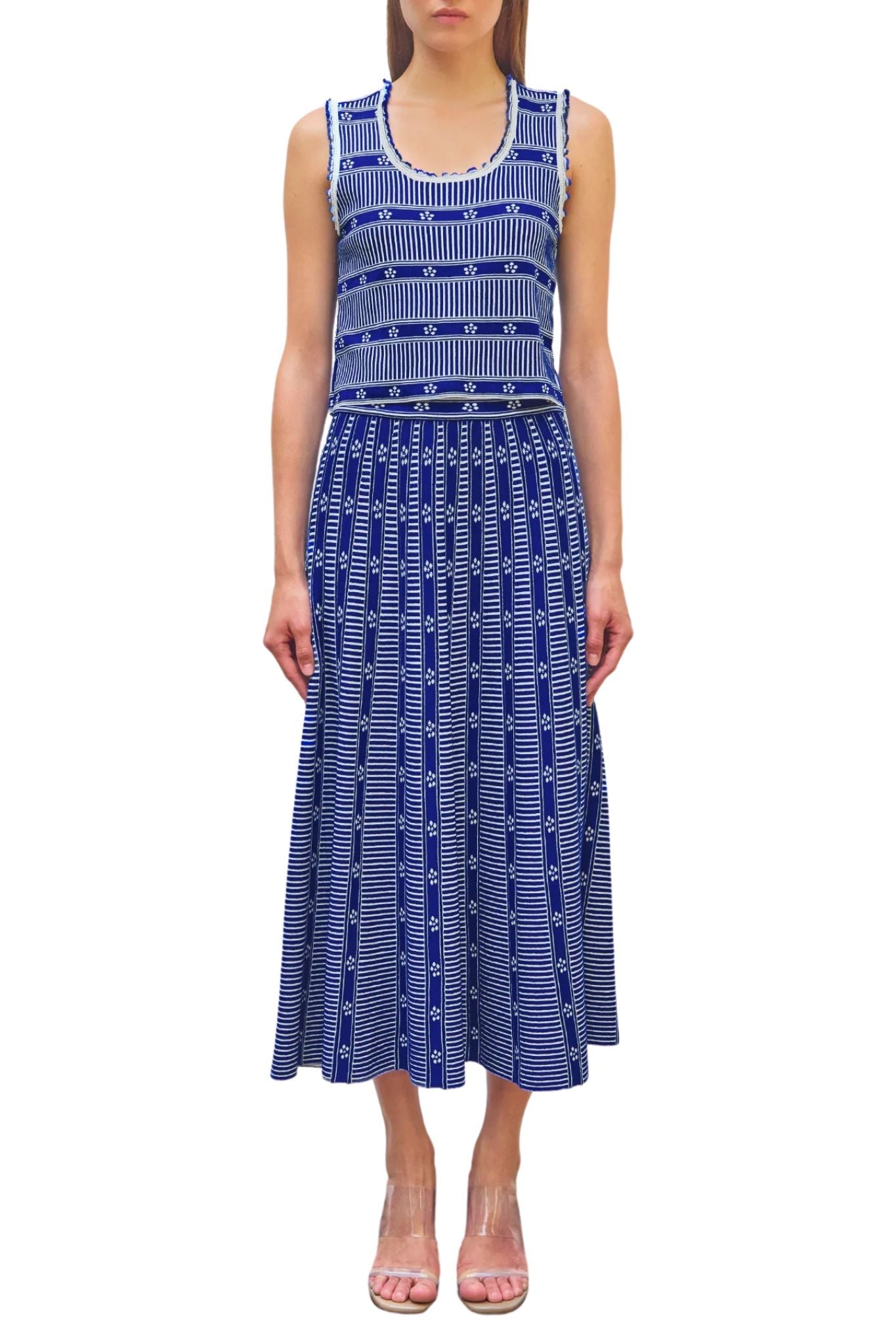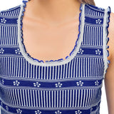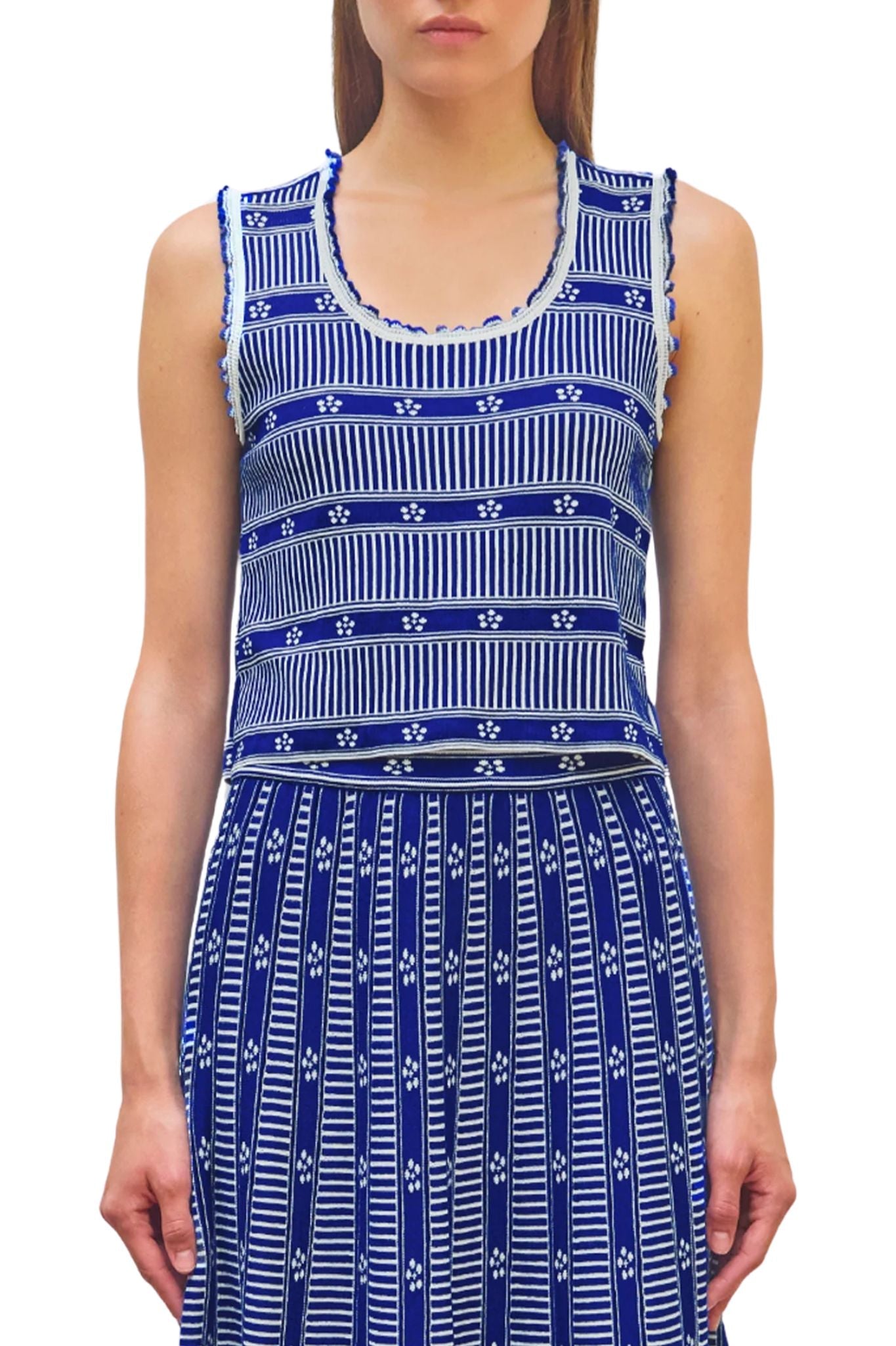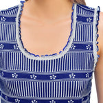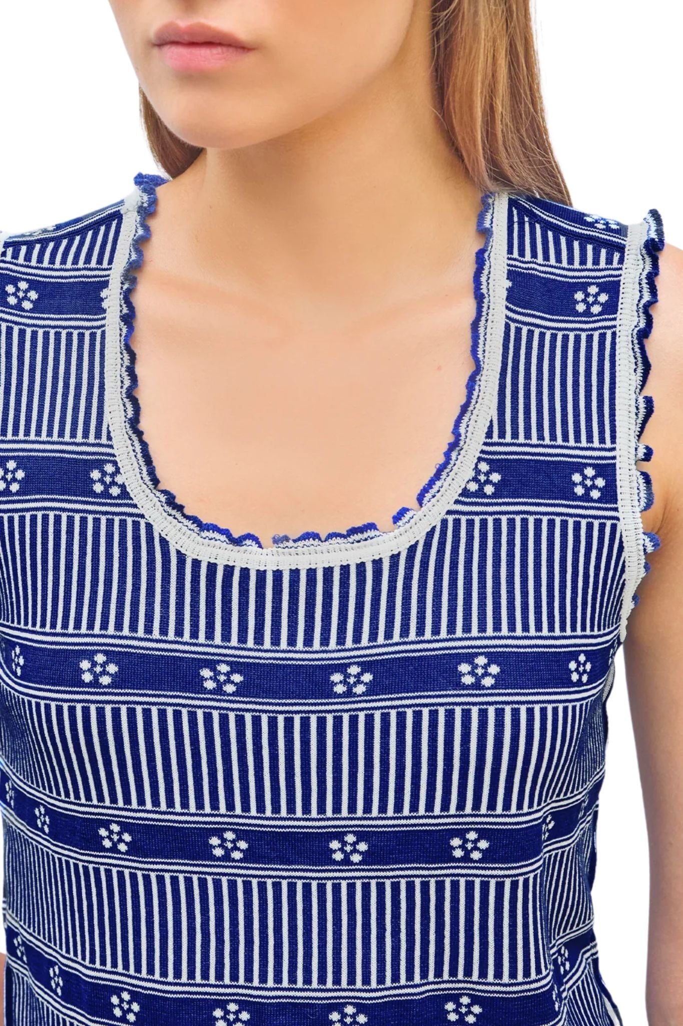 Made in Italy, this sleeveless knit top is in a lightweight jacquard that mixes stripes and small flowers. Made from a blend of ultra-soft cotton and rayon yarns, it has a straight cut and deep, round neckline with a “tank top” feel. The striped ruffles at the armholes and neckline add a touch of femininity.
