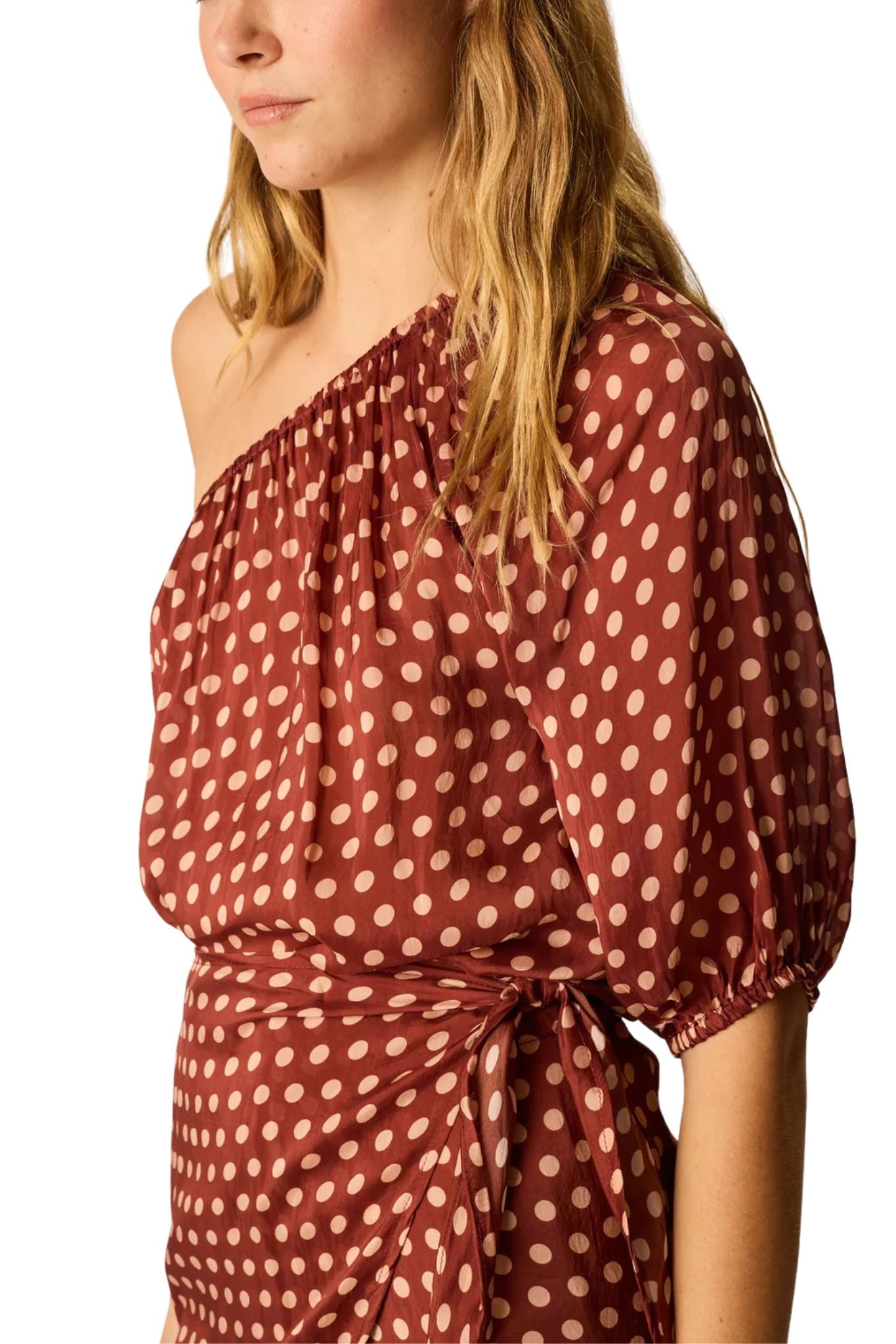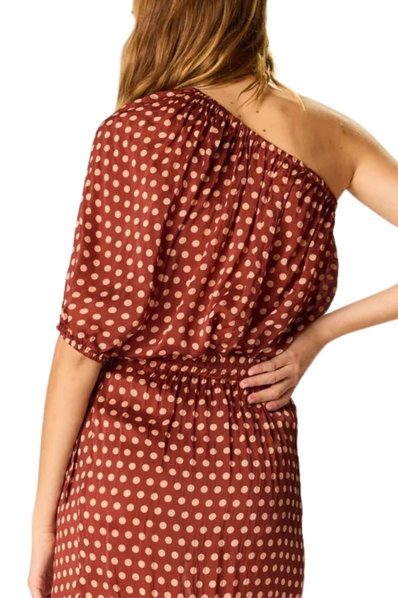 Our Erin top is a one shoulder style with an elastic neck detailing.