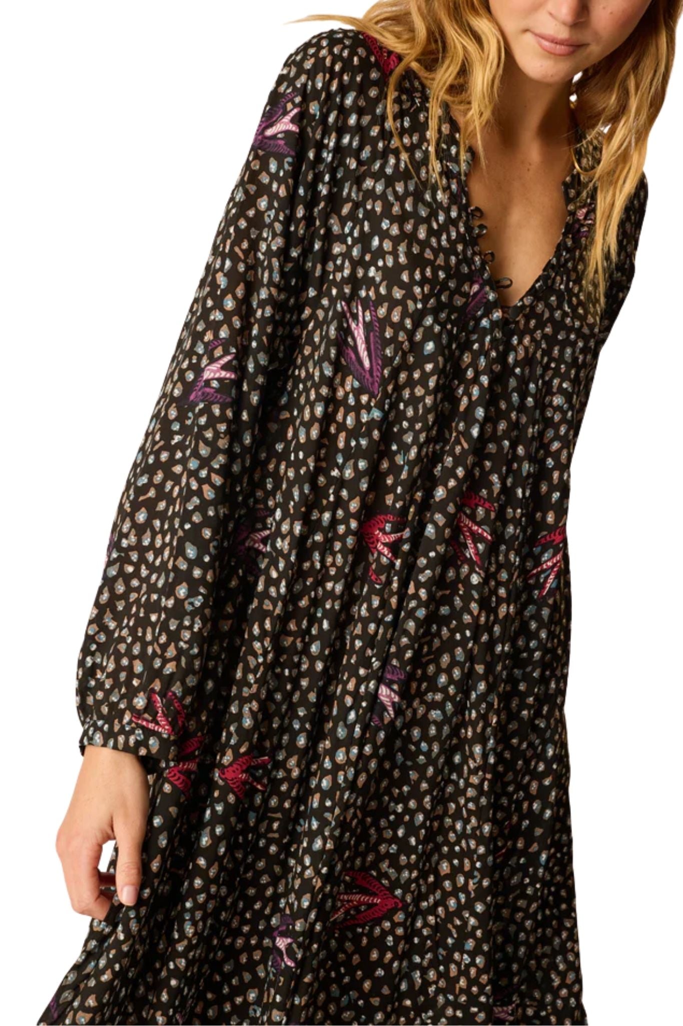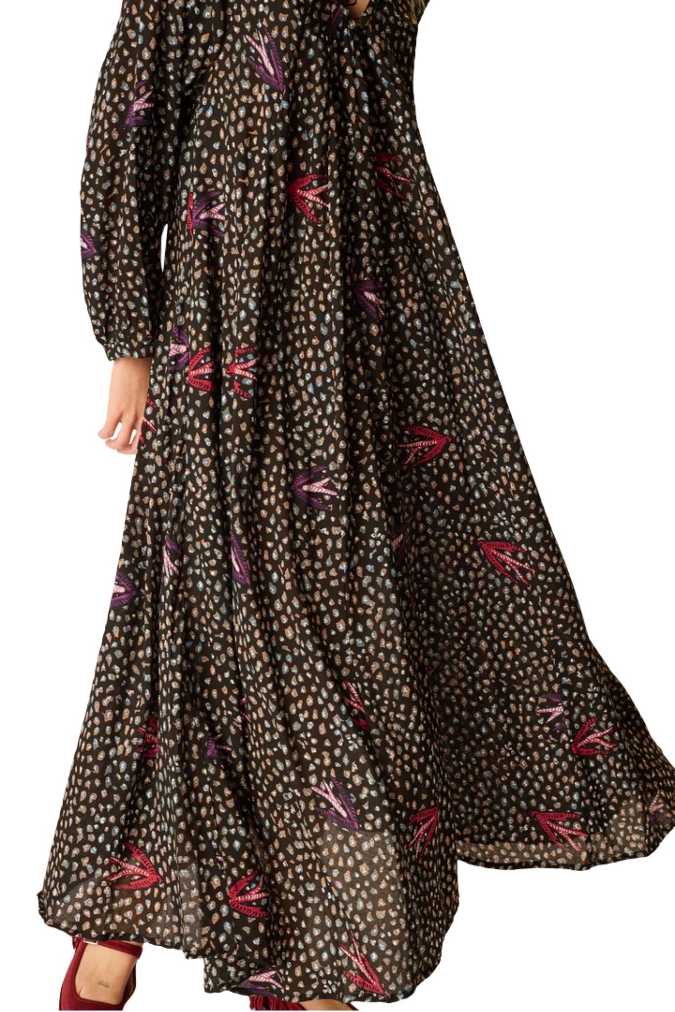 The Natalie Martin Fiore Maxi features an effortless A-line silhouette and voluminous long sleeves for a romantic, free-flowing look. A deep V-neckline with covered buttons adds refined detail, while the length hits at or just above the ankle for timeless elegance.