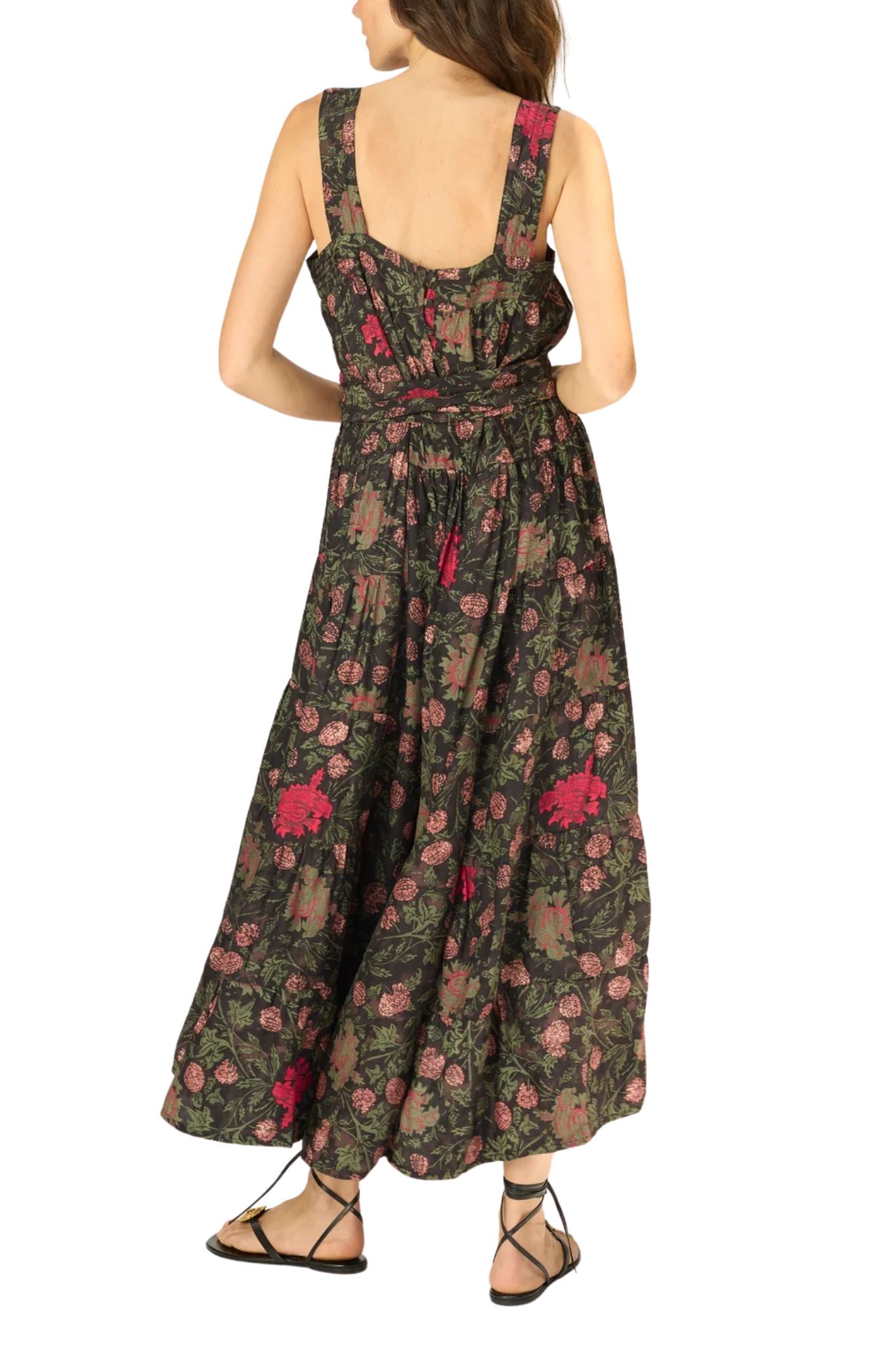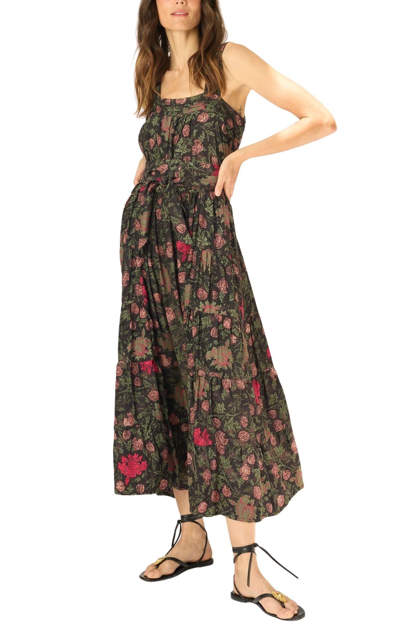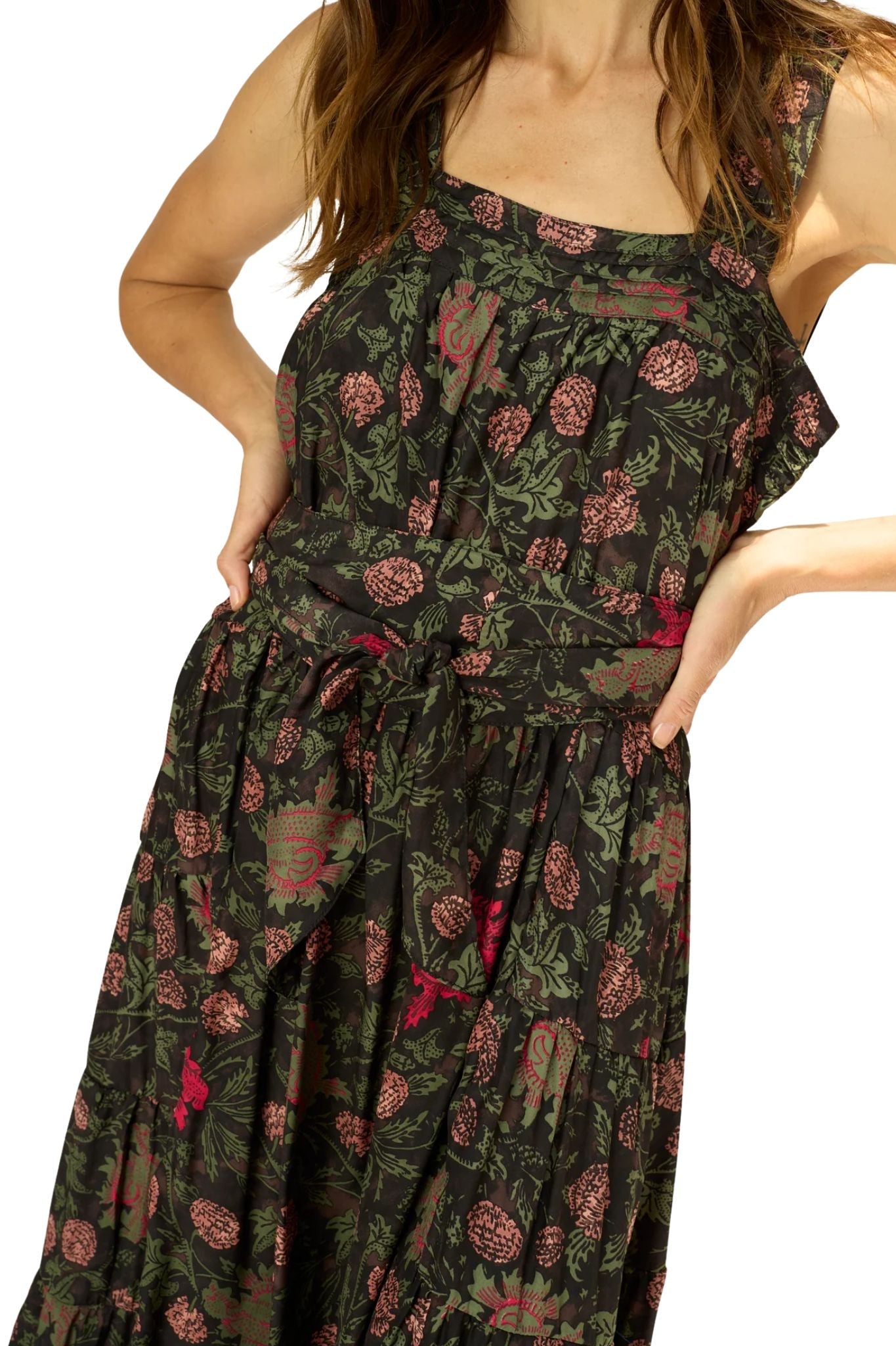 Sleeveless maxi dress with thick straps. Tiered dress that's full of body. Hits right above the ankle. Comes with removable sash belt.