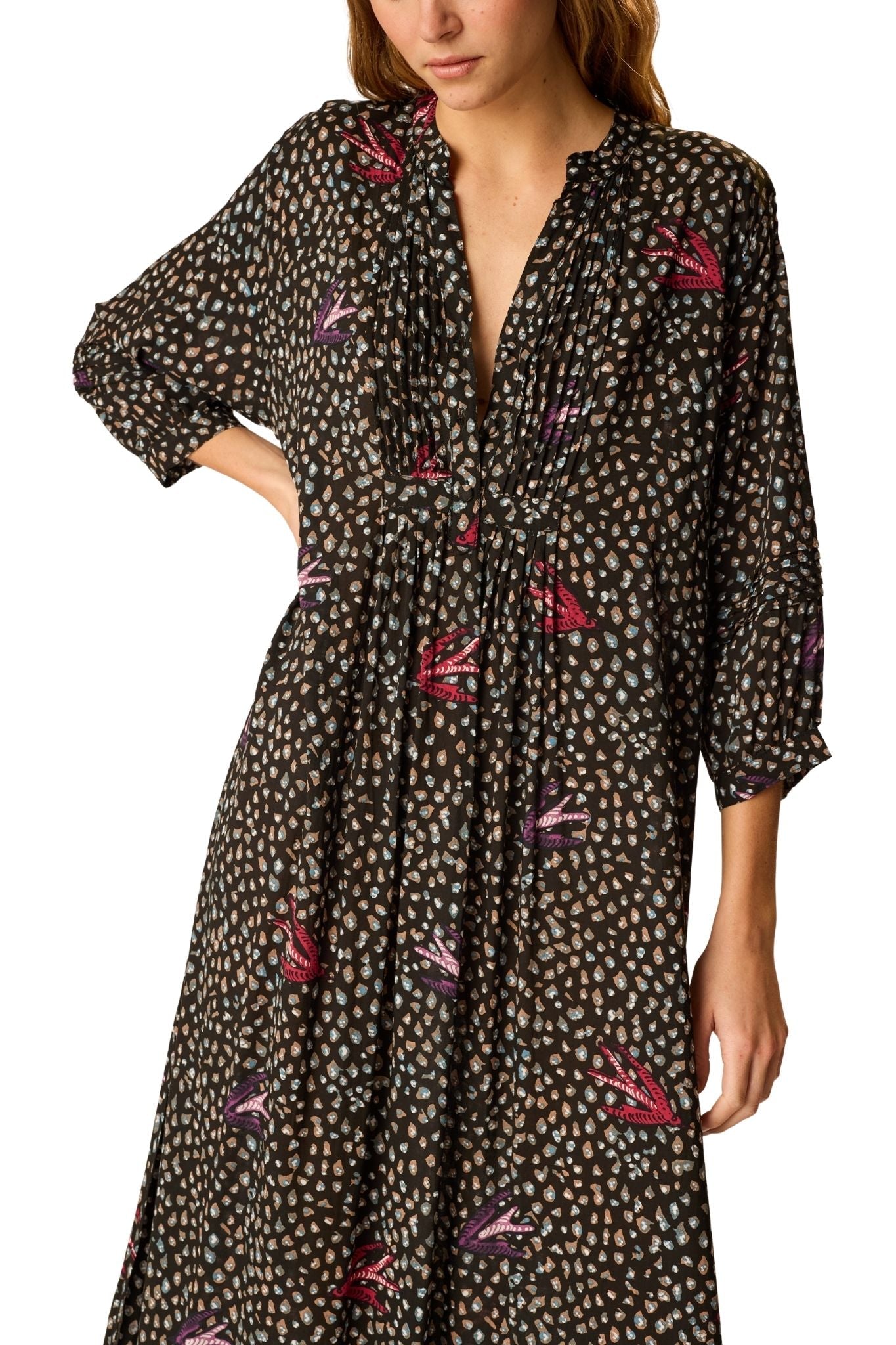Maxi-length dress with v-neckline and pleated bib. Three-quarter length sleeves.