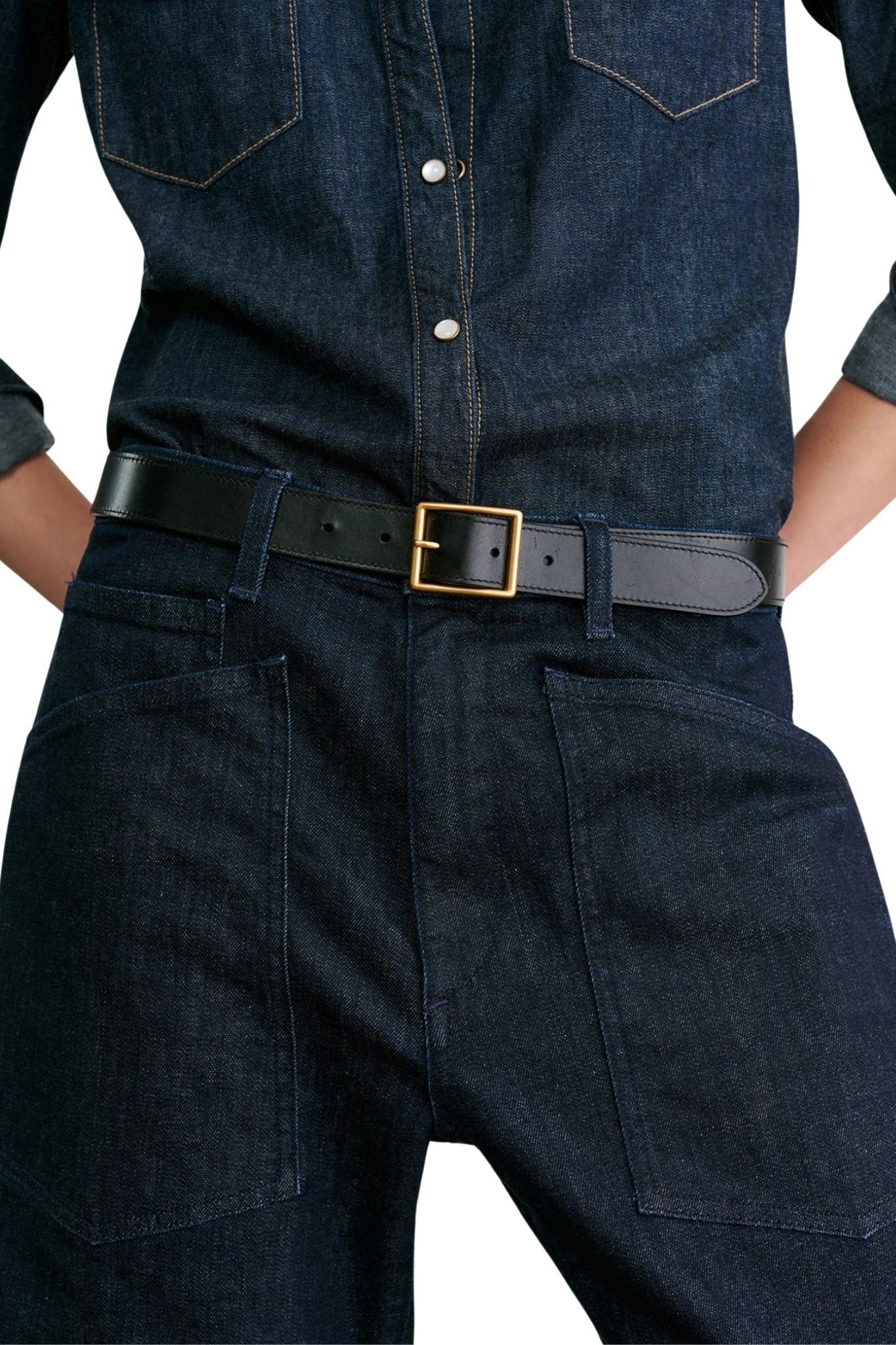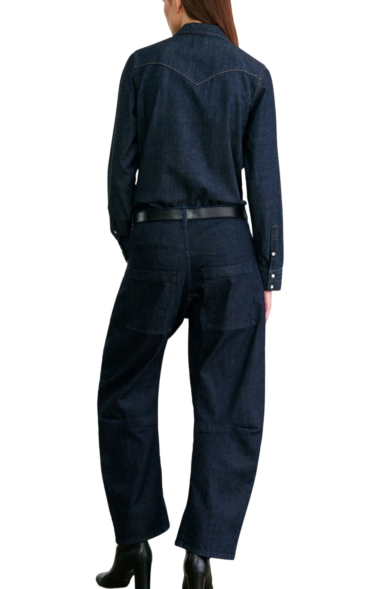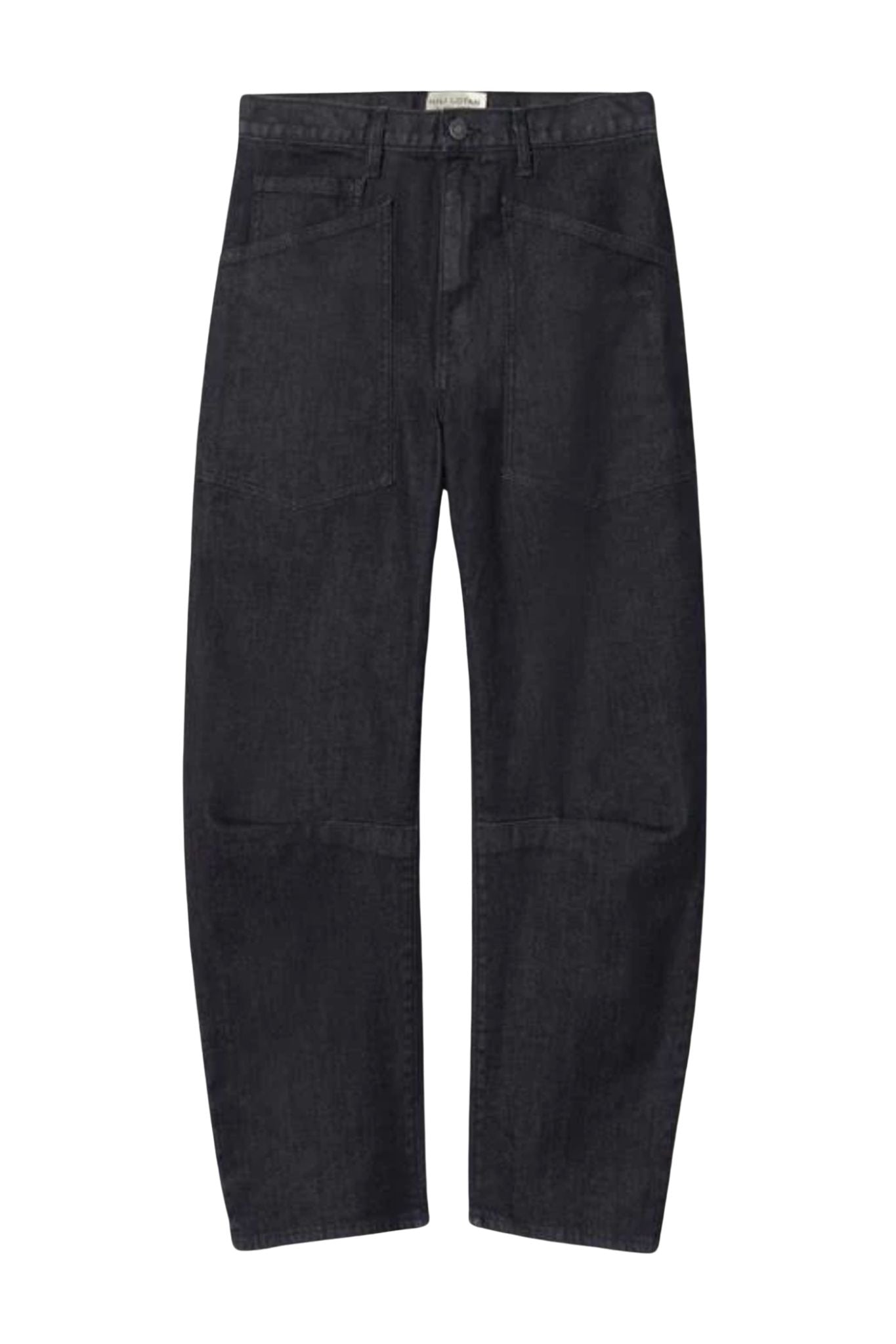 Mid-rise, relaxed fit barrel leg jean in Japanese stretch denim. Uniquely curved silhouette. Seam detail at knees. Gusset at inseam. Zip fly. Shank closure. Top-stitched front and back patch pockets. Belt loops.