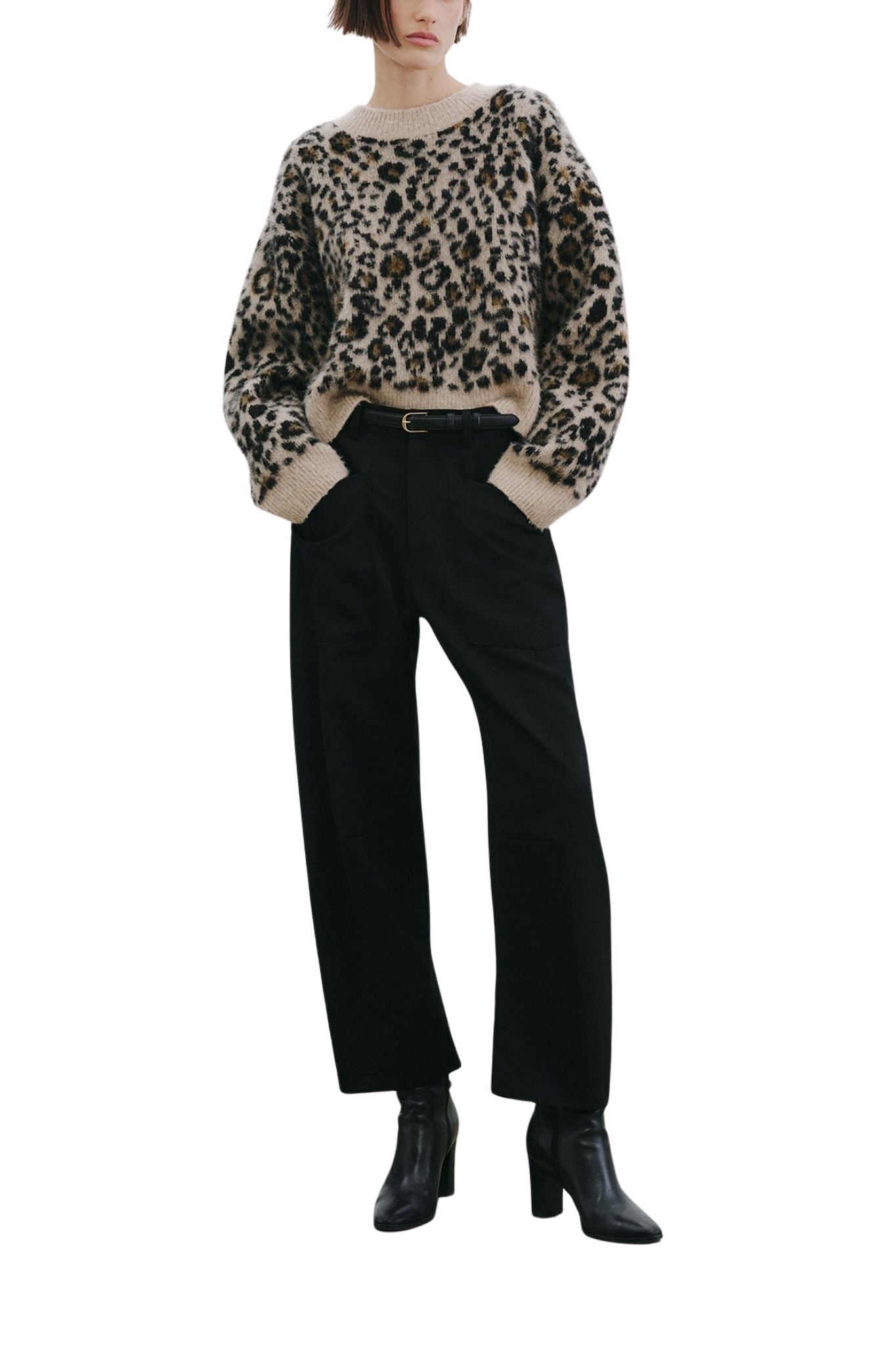 Long sleeve crewneck pullover sweater in a brushed cashmere silk blend. Medium weight in a jacquard leopard stitch. Relaxed boxy fit. Regular length. Regular sleeve length. Hem cuff and neck trim in contrast 1x1 rib.