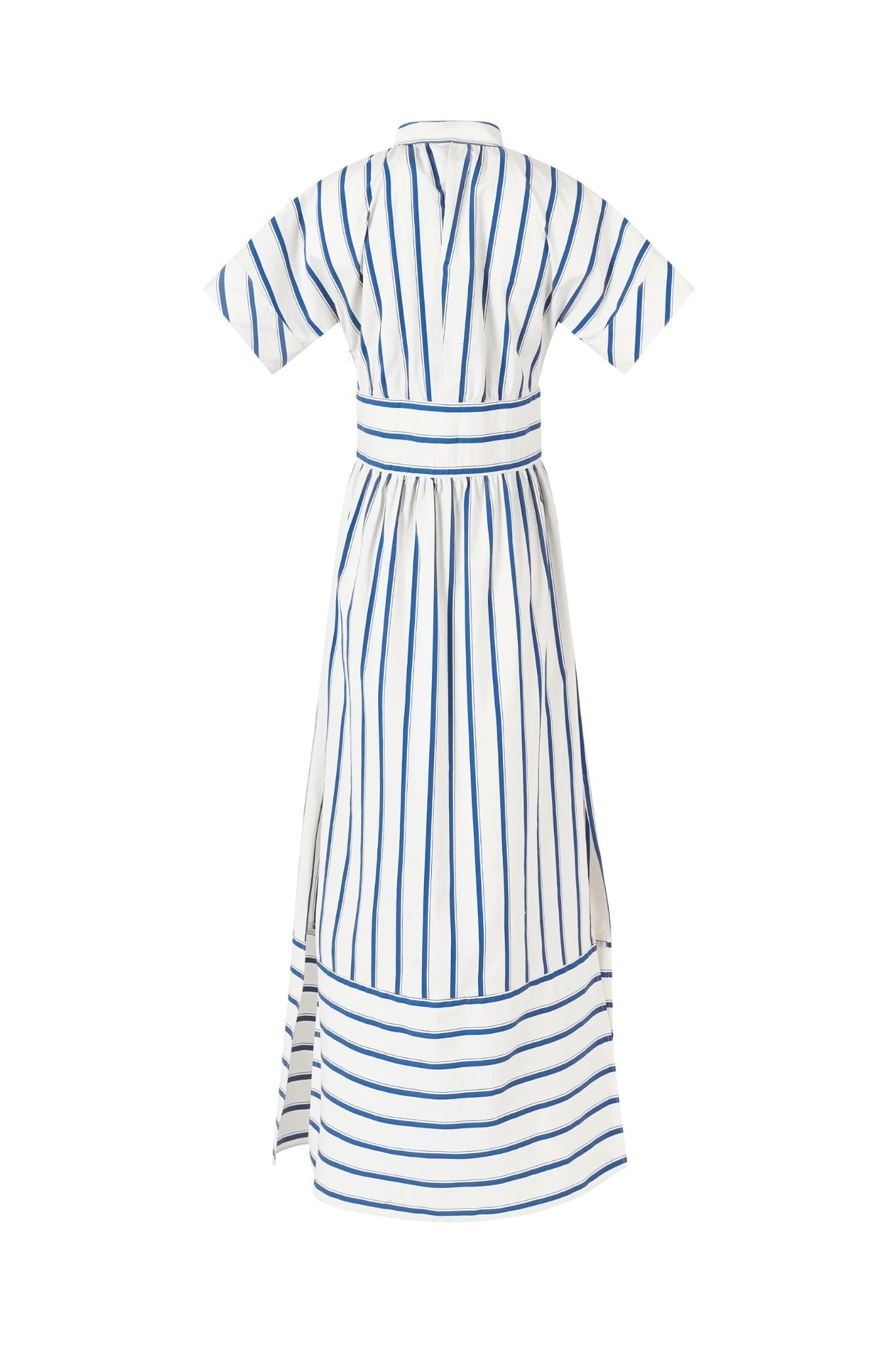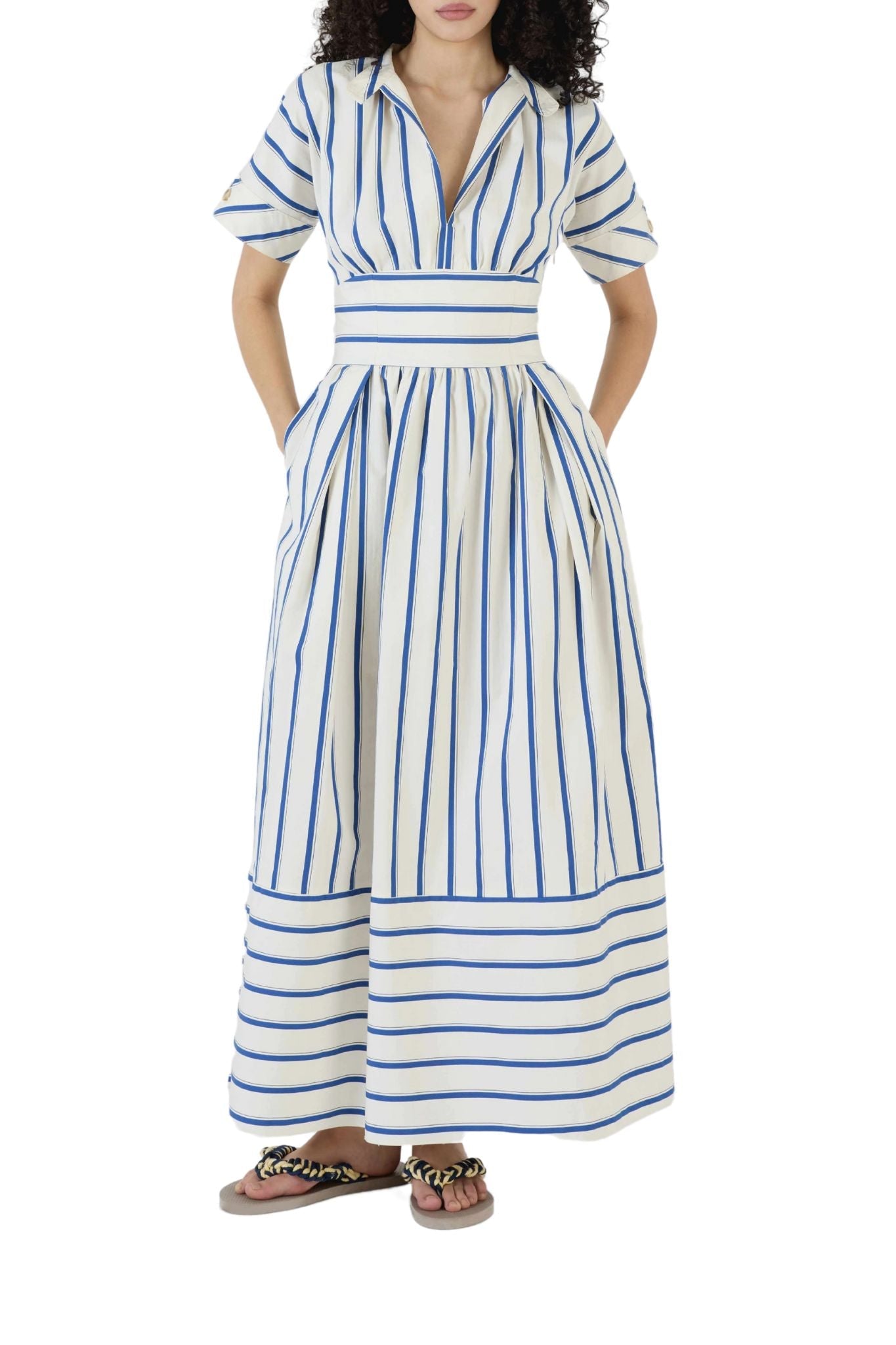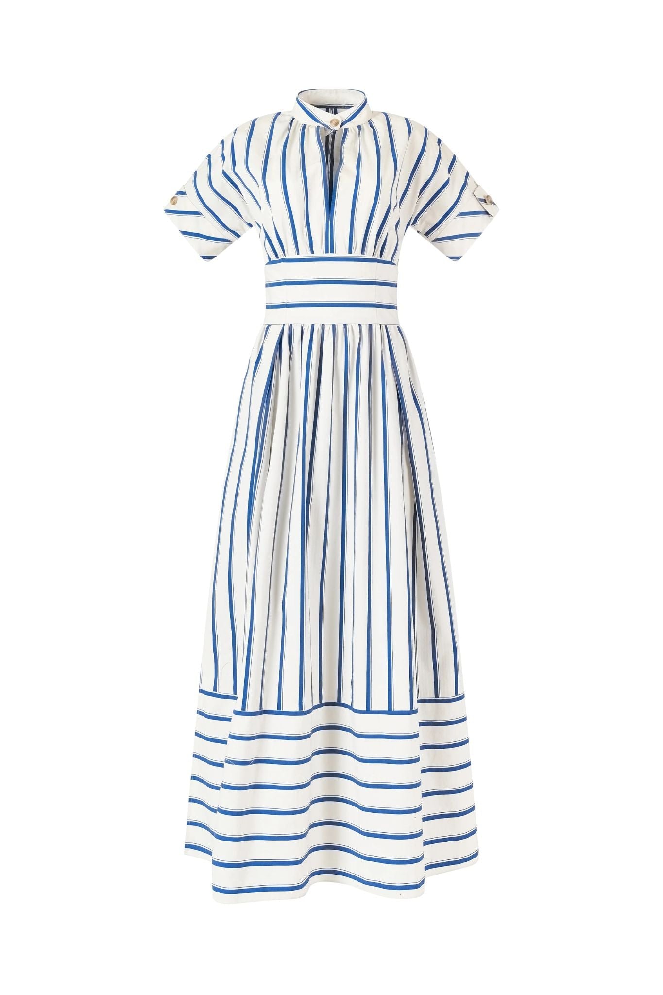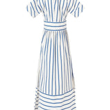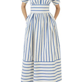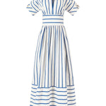 Featuring a Blue Stripe pattern, this dress from Rosie Assoulin is designed with a structured bodice, a cinched waist, and a flowing skirt that creates a flattering silhouette. The deep V-neckline and puffed sleeves add a touch of femininity, while the pleated detailing enhances its refined charm.