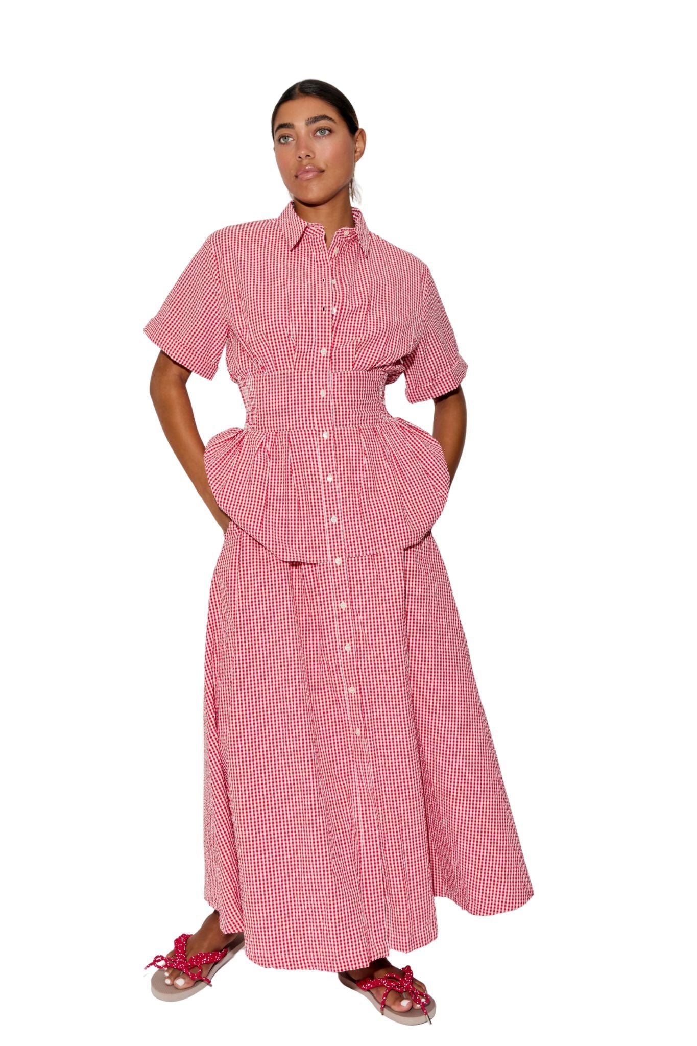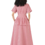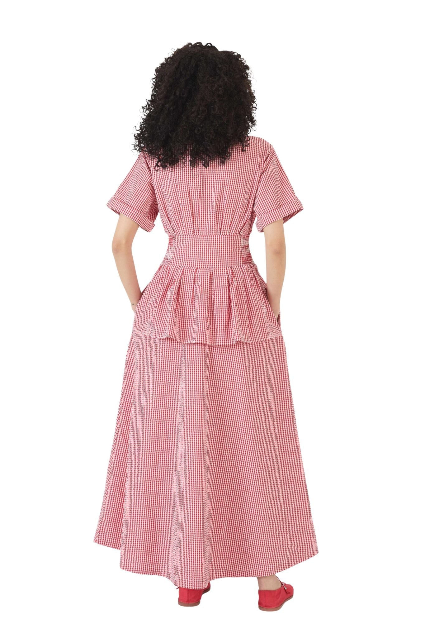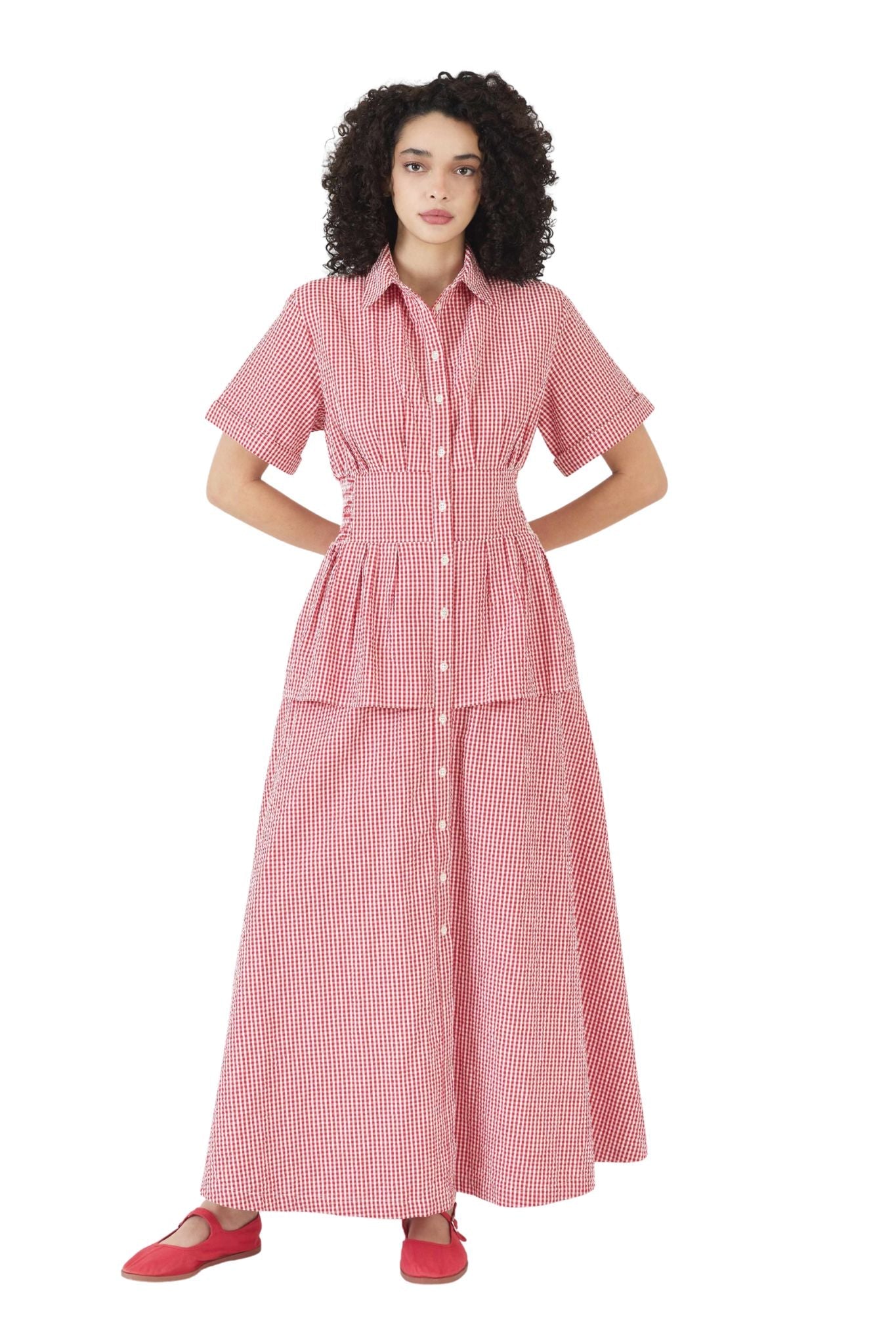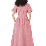 The Boogie Woogie Bugle Boy Dress in Seersucker Red Gingham brings a playful yet structured silhouette with its cinched waist and voluminous skirt. The button-down front and short sleeves give it a retro charm, perfect for warm-weather outings.