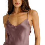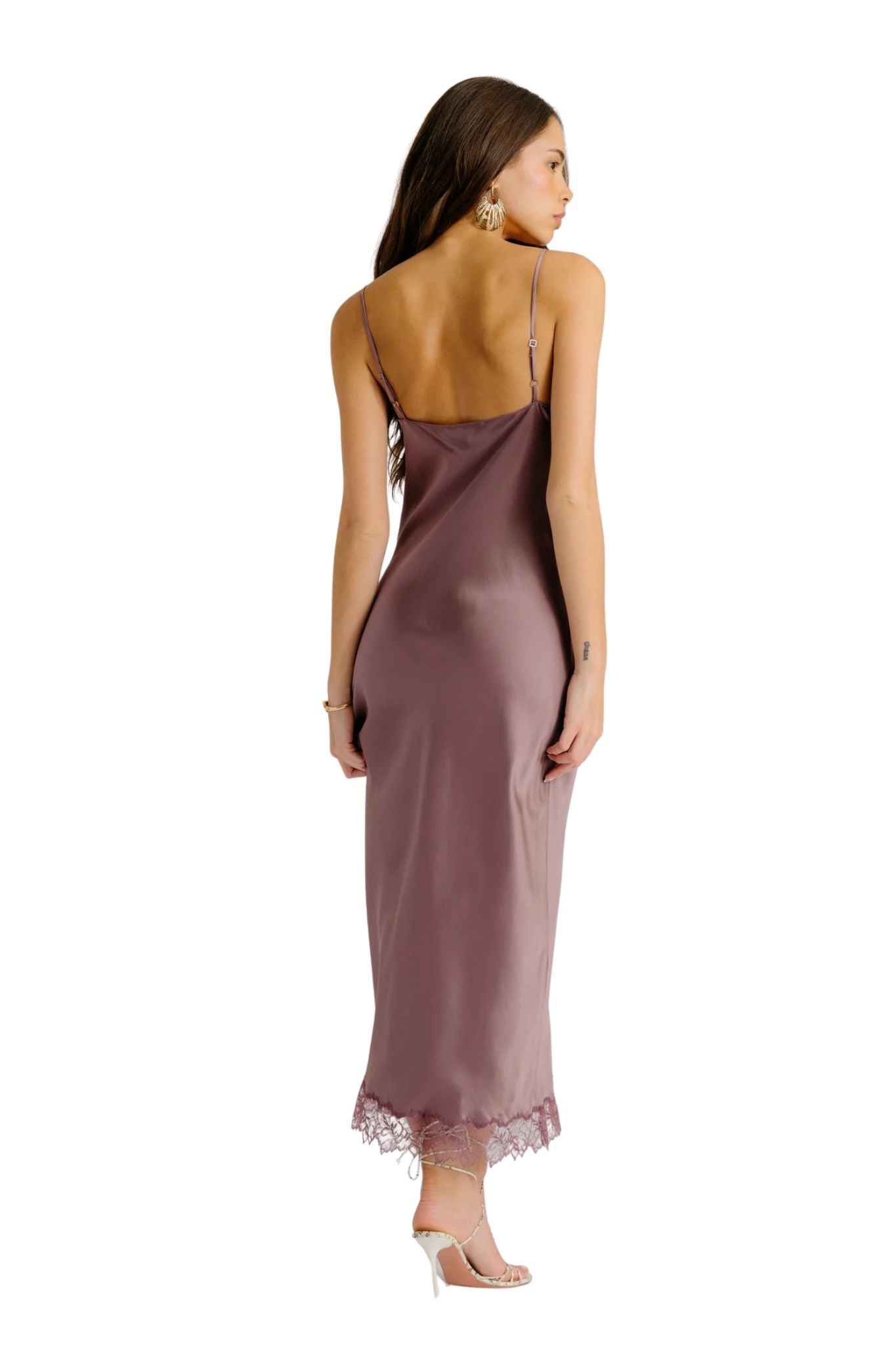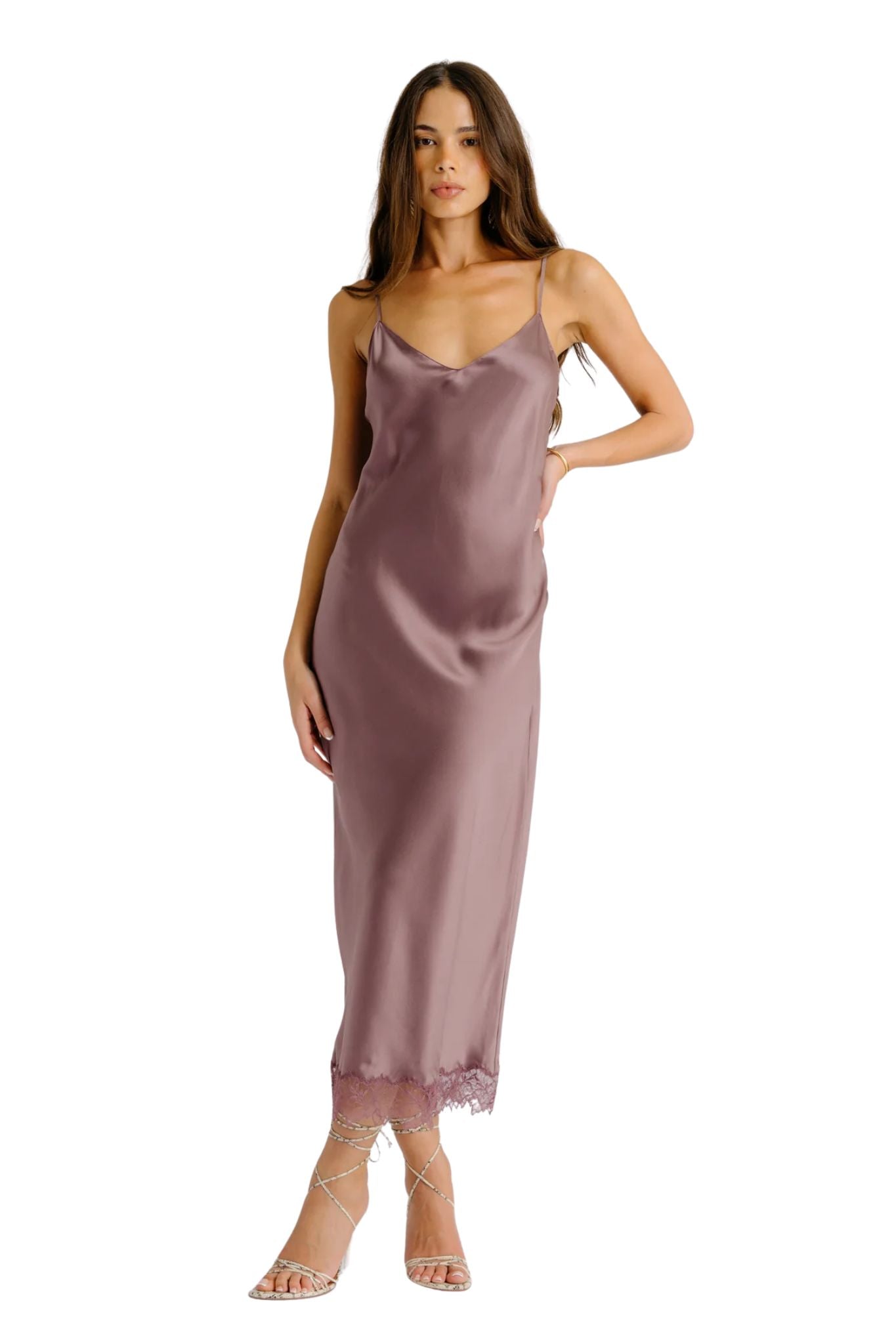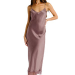 Bias cut silk dress with a deep V-neckline and lace trim.