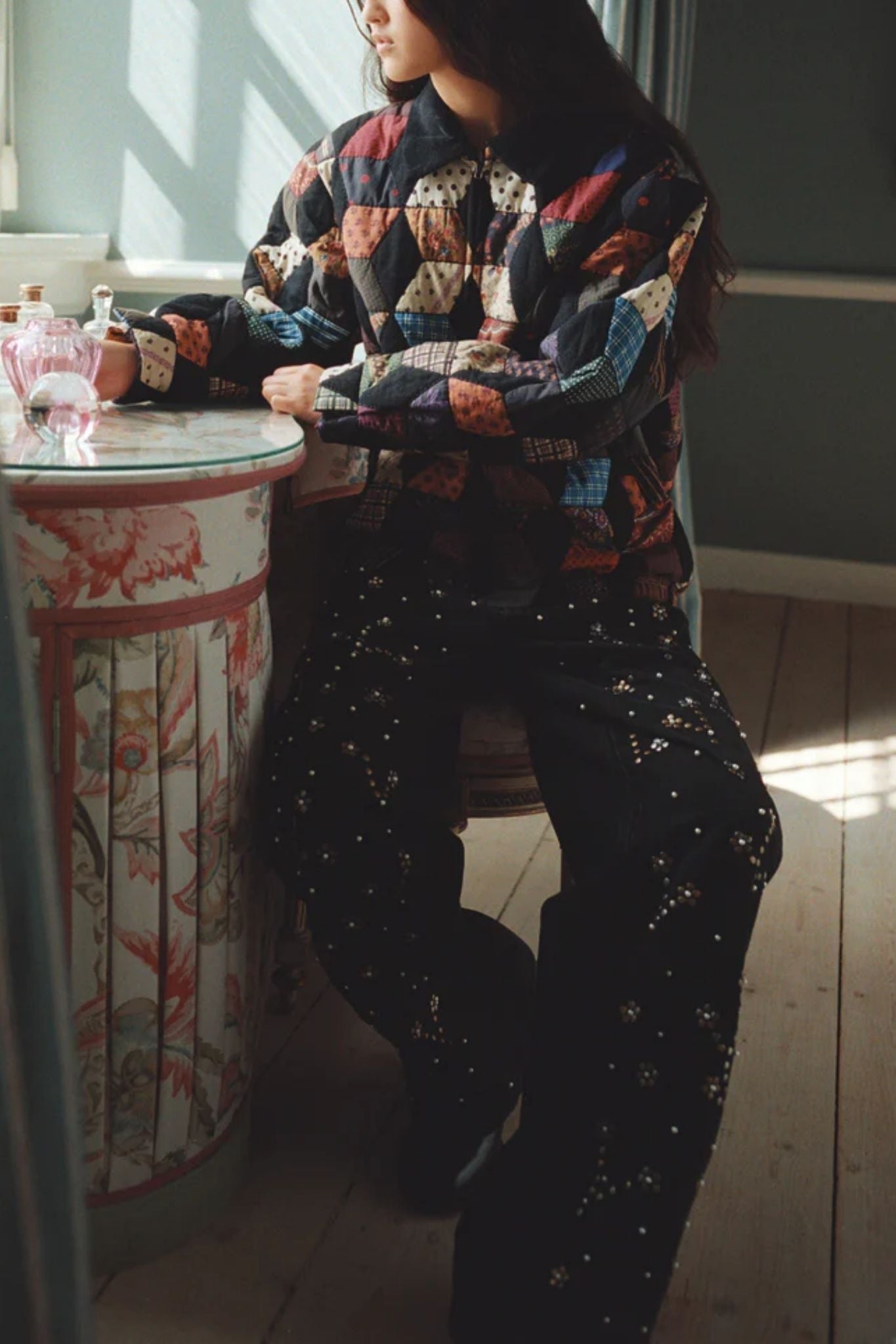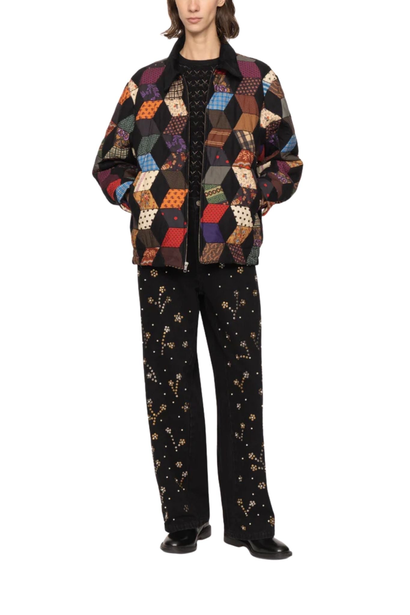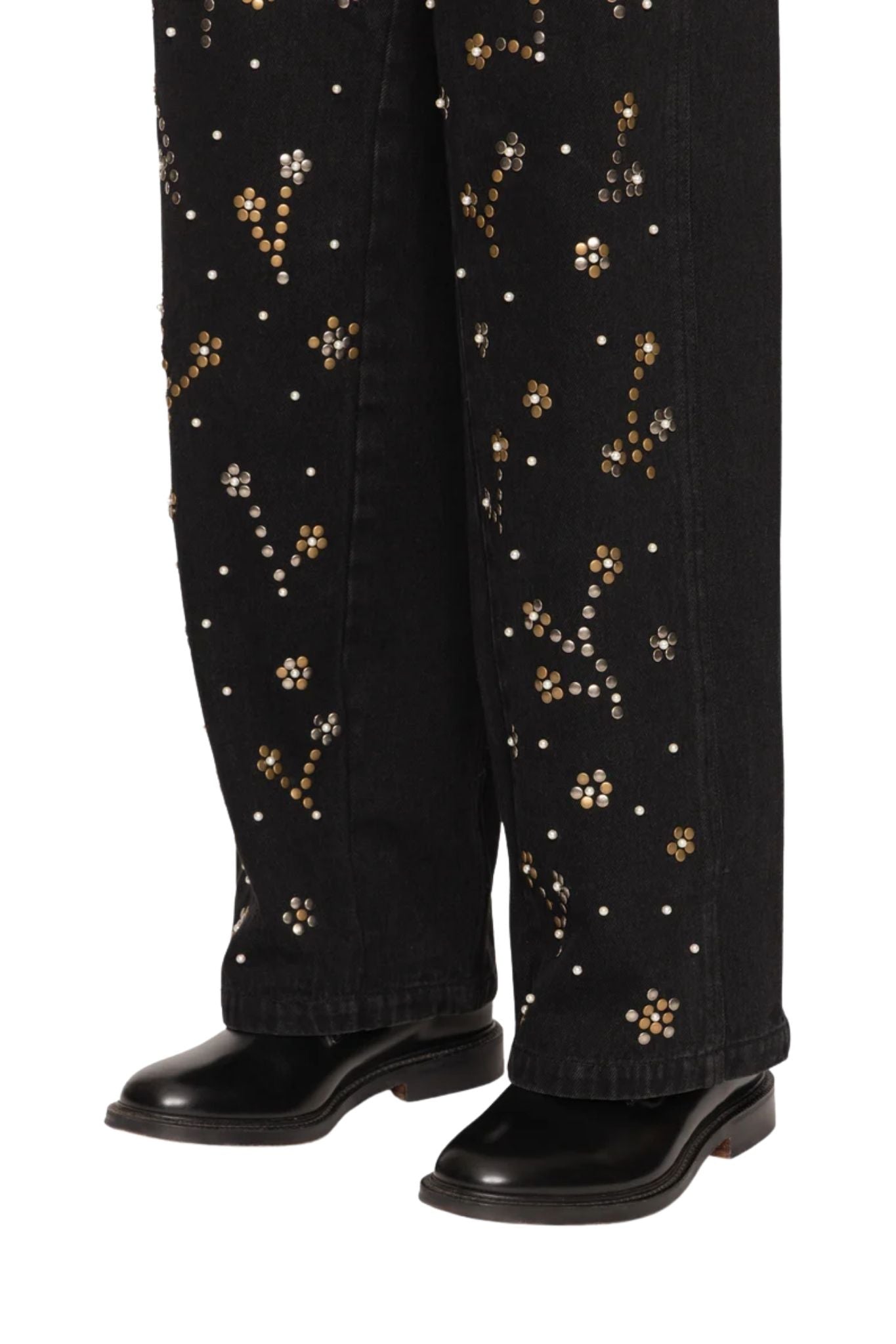 The Etta studded denim jeans are adorned with intricate pearl beading and metallic studs arranged in a bold floral pattern. This thoughtful embellishment brings texture and artistry to a classic silhouette.
