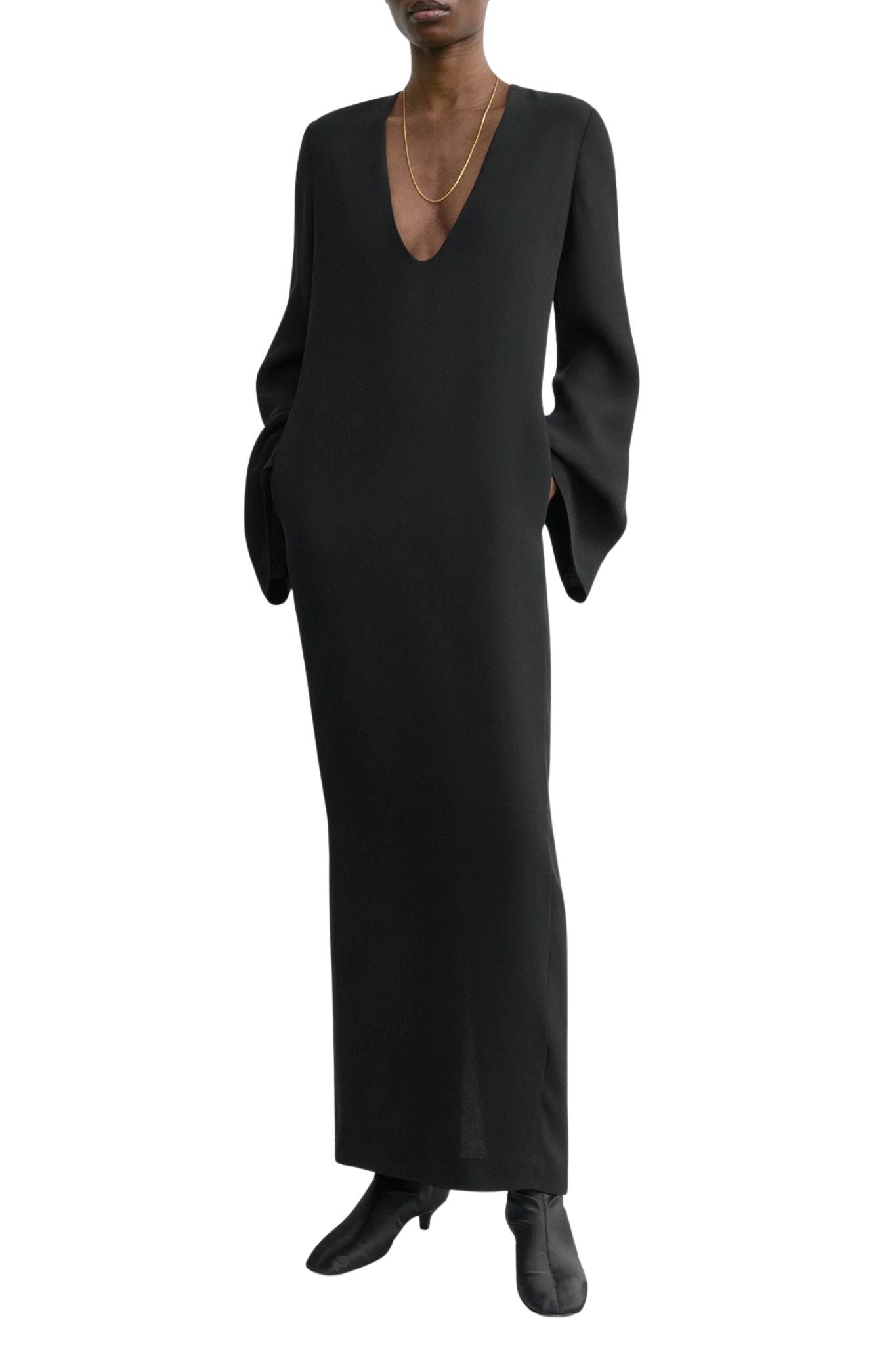 This sculptural occasion dress was featured on the Fall Winter 25 runway paired with a coat outlined with the same bell-sleeve silhouette. It is crafted from soft and fluid cady with a deep U-neckline and front pockets, and fastens with a concealed back zipper.