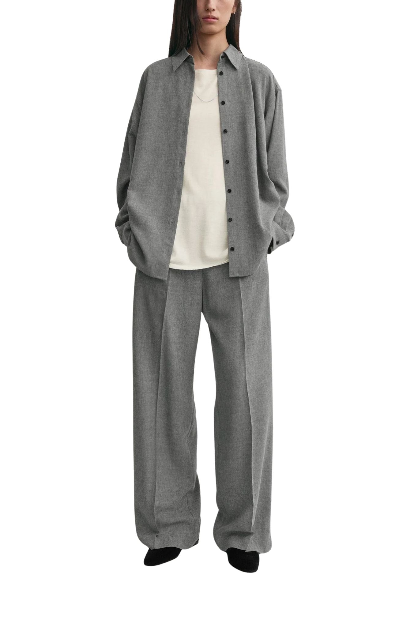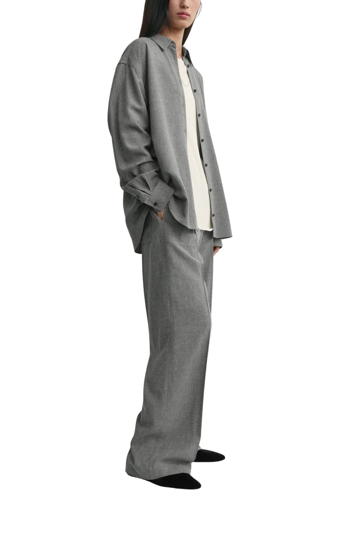 Classic shirt reworked in a fluid viscose-wool blend for a polished everyday look. It has a longline, oversized silhouette with dropped shoulders and a buttoned placket and cuffs. Wear it in trans-seasonal weather over a simple tee.