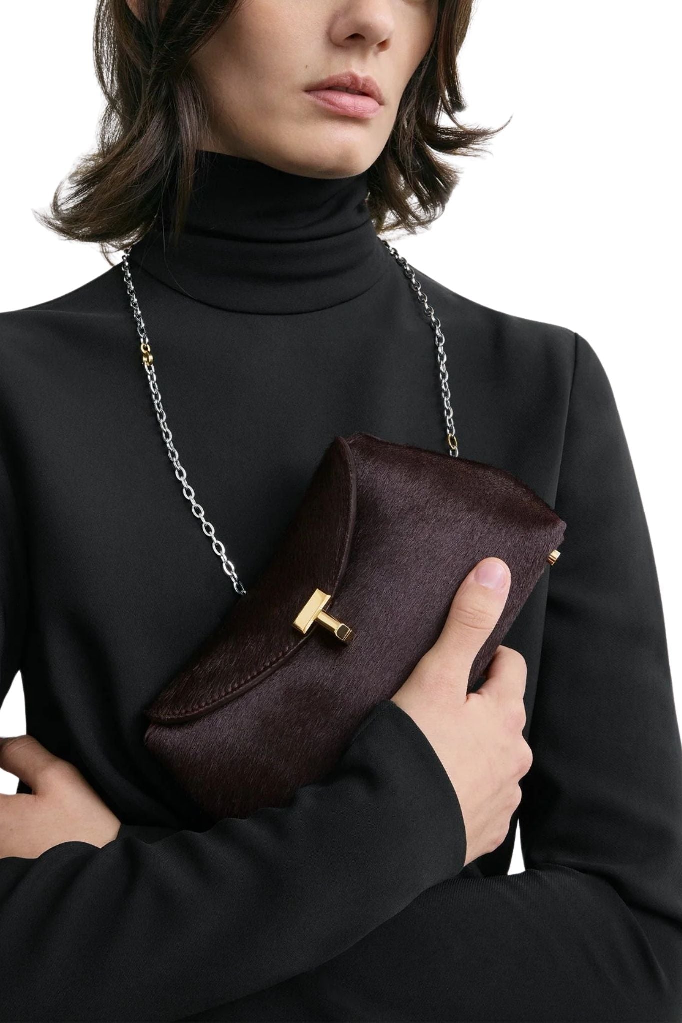 The T-lock bag revisited as a mini clutch to nestle in the hand alongside evening looks. It is crafted in Italy from pony hair-effect leather with a gold-tone T-lock clasp and an internal card slot. Keep it in focus by teaming it with black separates.