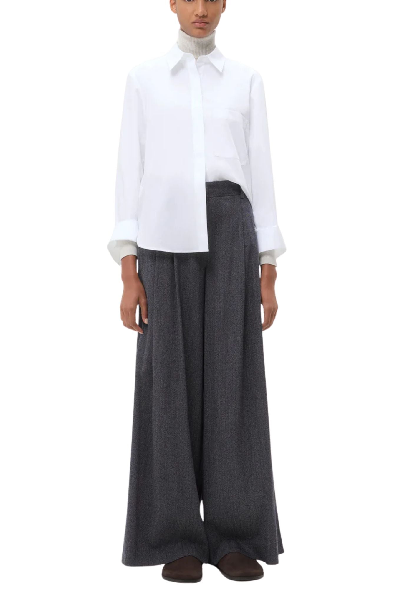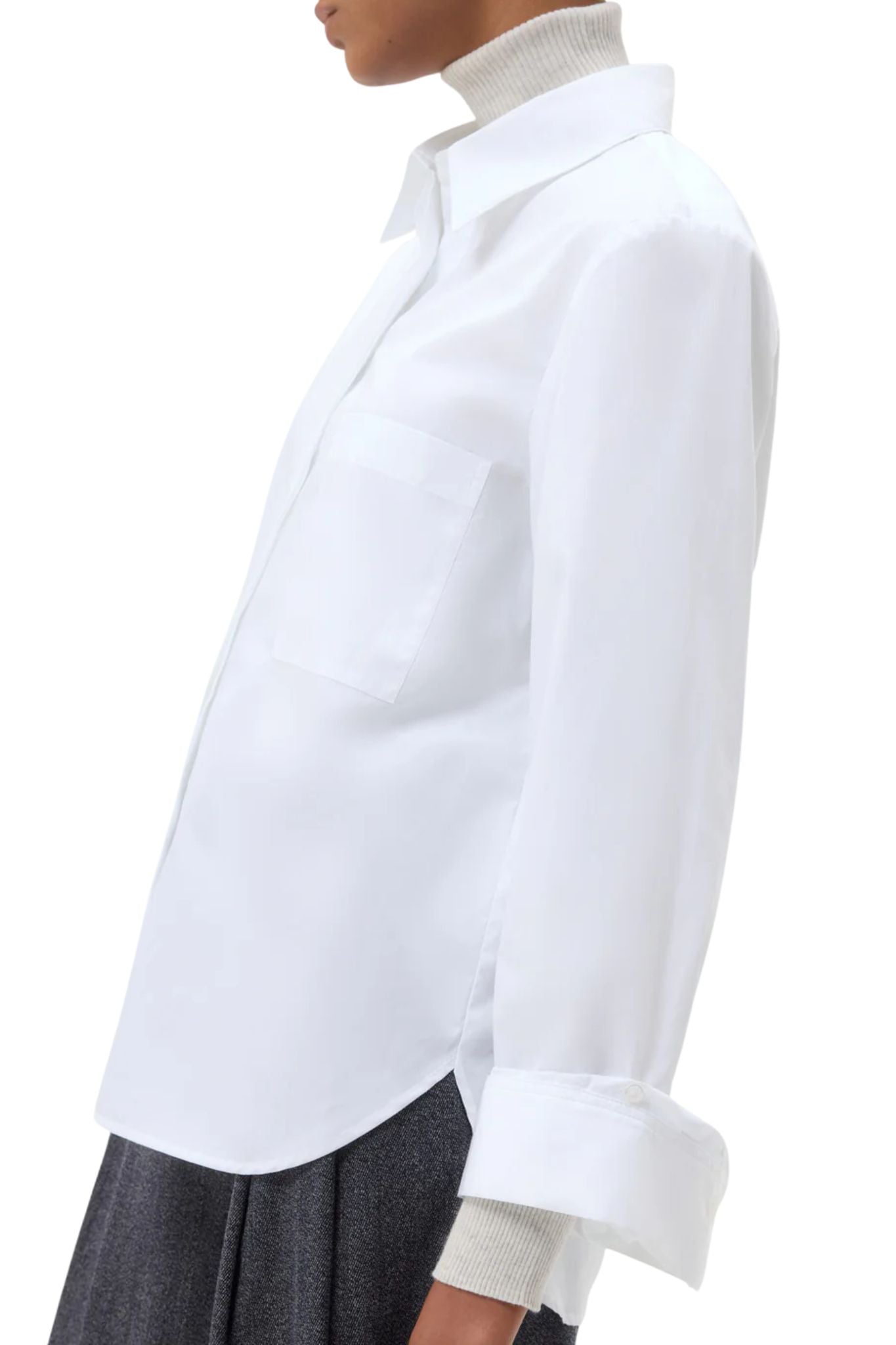 TWP’s signature button down crafted in superfine Italian cotton shirting. The Boyfriend is a relaxed fit complete with a chest patch pocket, concealed placket, curved hem, and staple single roll button cuffs.