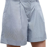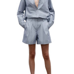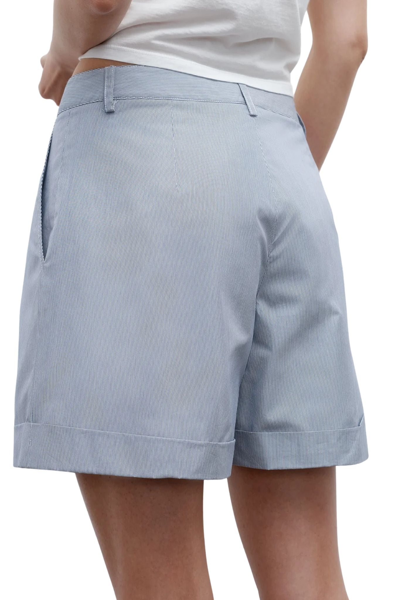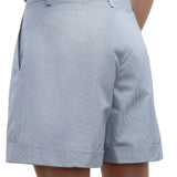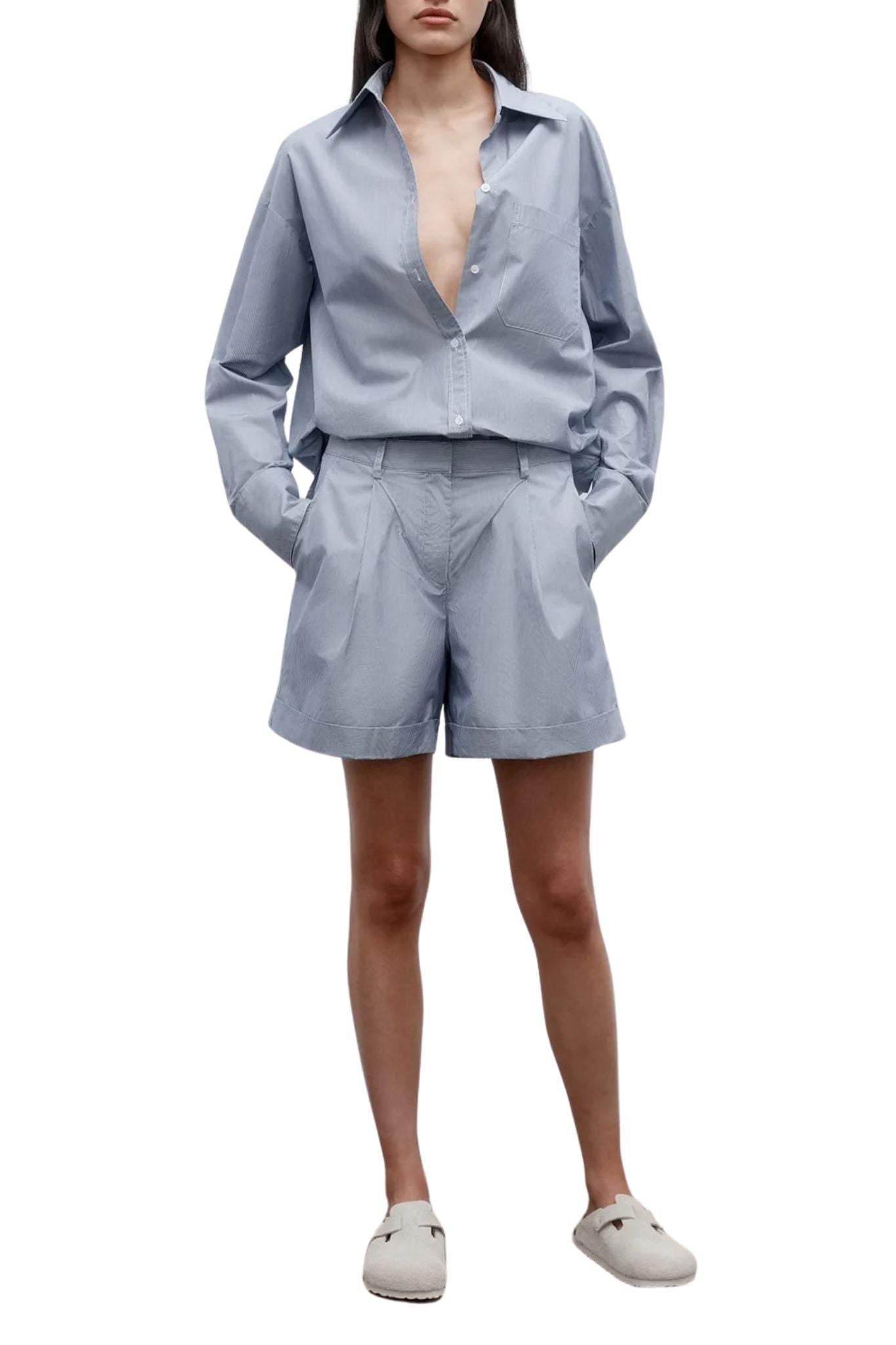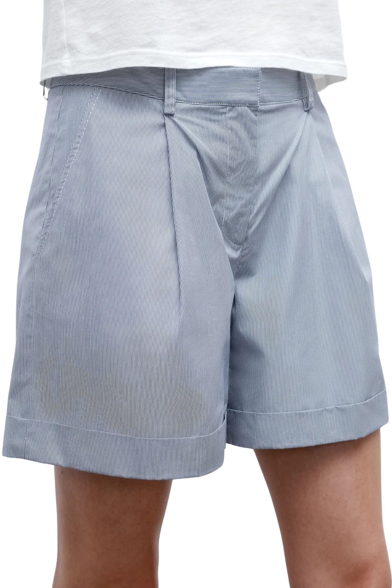 Mid-rise pleated shorts in finely striped Italian cotton. The Cisco Short has a box pleat down the front and turned up hems. Complete with side pockets, concealed zip-fly and hook and eye closure.