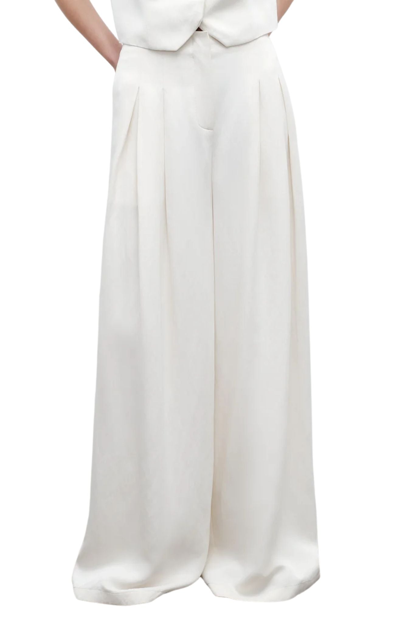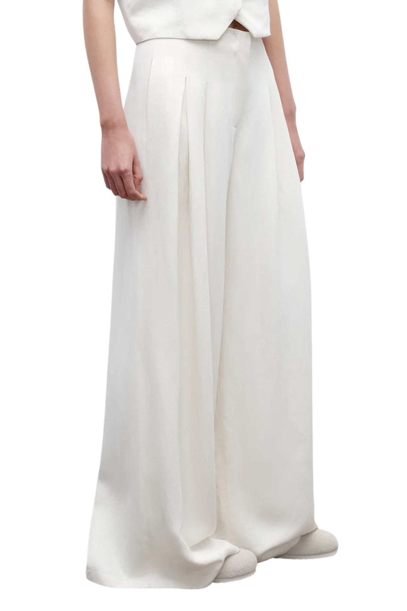 High-rise, wide leg pants in coated viscose linen. We combined a european flax linen, and viscose coating, creating a fabric with a deep color saturation, elegant drape and satiny sheen. The Drew has floor length pleats through the leg. Complete with side pockets, a concealed zip fly and hook and bar fastening at the waist. Runs small, we recommend sizing up.