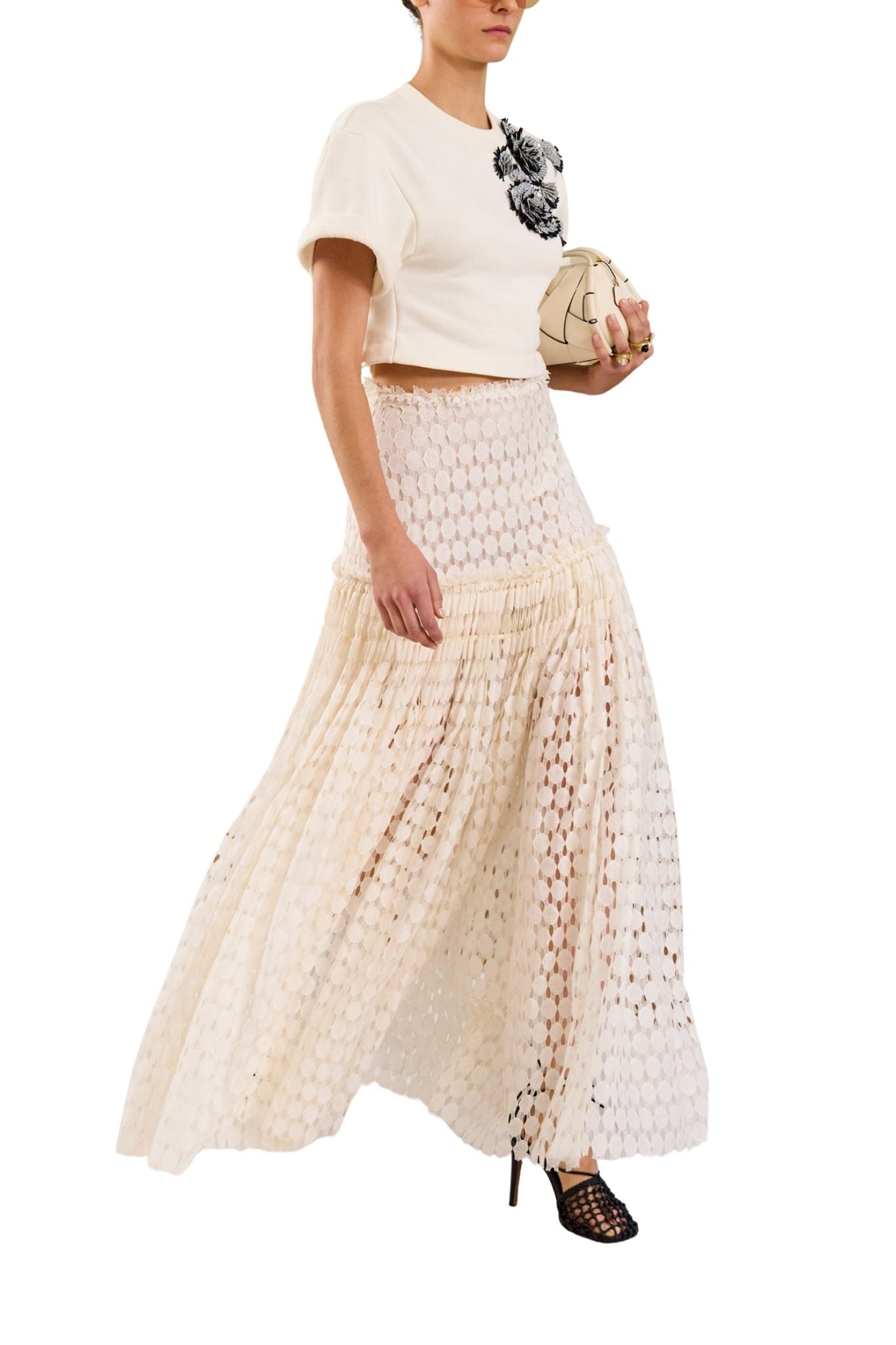 The Aris Lace Maxi Skirt by Ulla Johnson is a romantic, statement-making silhouette crafted with intricate lace detailing and a fluid, floor-skimming length. Designed to move beautifully with every step, the delicate lace pattern adds texture and artistry while the airy construction keeps the piece lightweight and effortless to wear. Finished with a fitted waist that flatters the figure before flowing into a graceful maxi shape, this skirt offers a perfect balance of feminine elegance and modern ease.