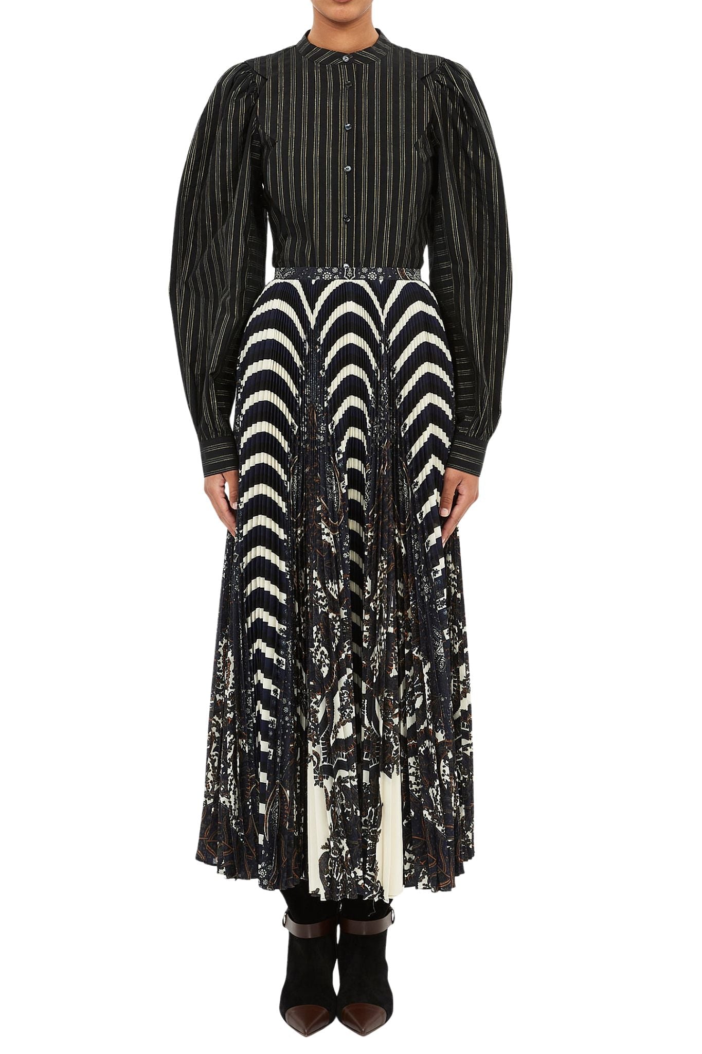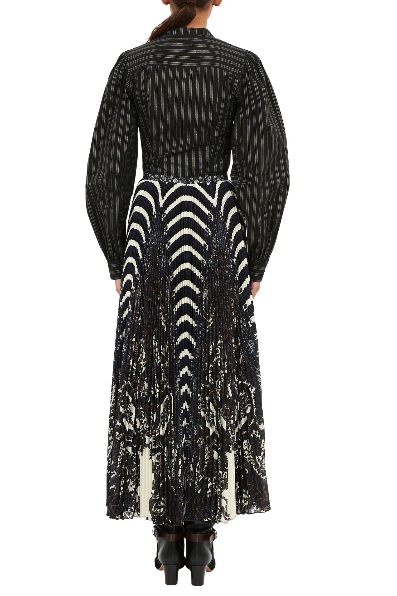Debuting in Look 41 on the AW25 runway, the Shayna Skirt comes alive with intricate paisley feather motifs patchworked with bold stripes created exclusively by our print designer. The all-over accordion pleating and flyaway hem create soft yet sharp movement with every step.