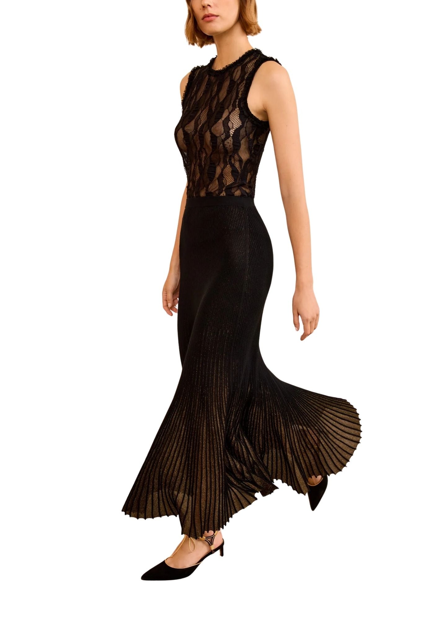 Designed with a pleated flared hem, the Vera Skirt lends poetic movement at every step. It is spun from signature sunburst knit in effortless black with lurex yarns that glimmer throughout.
