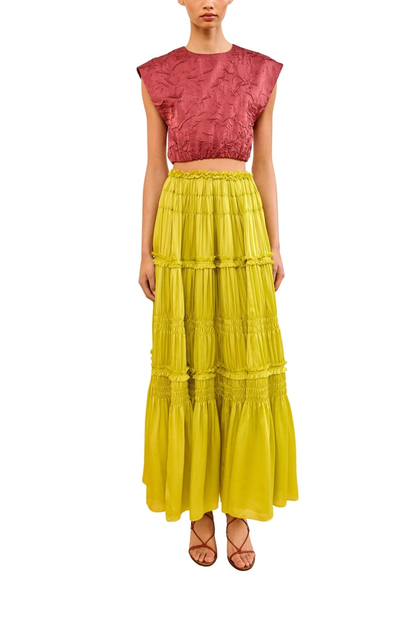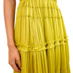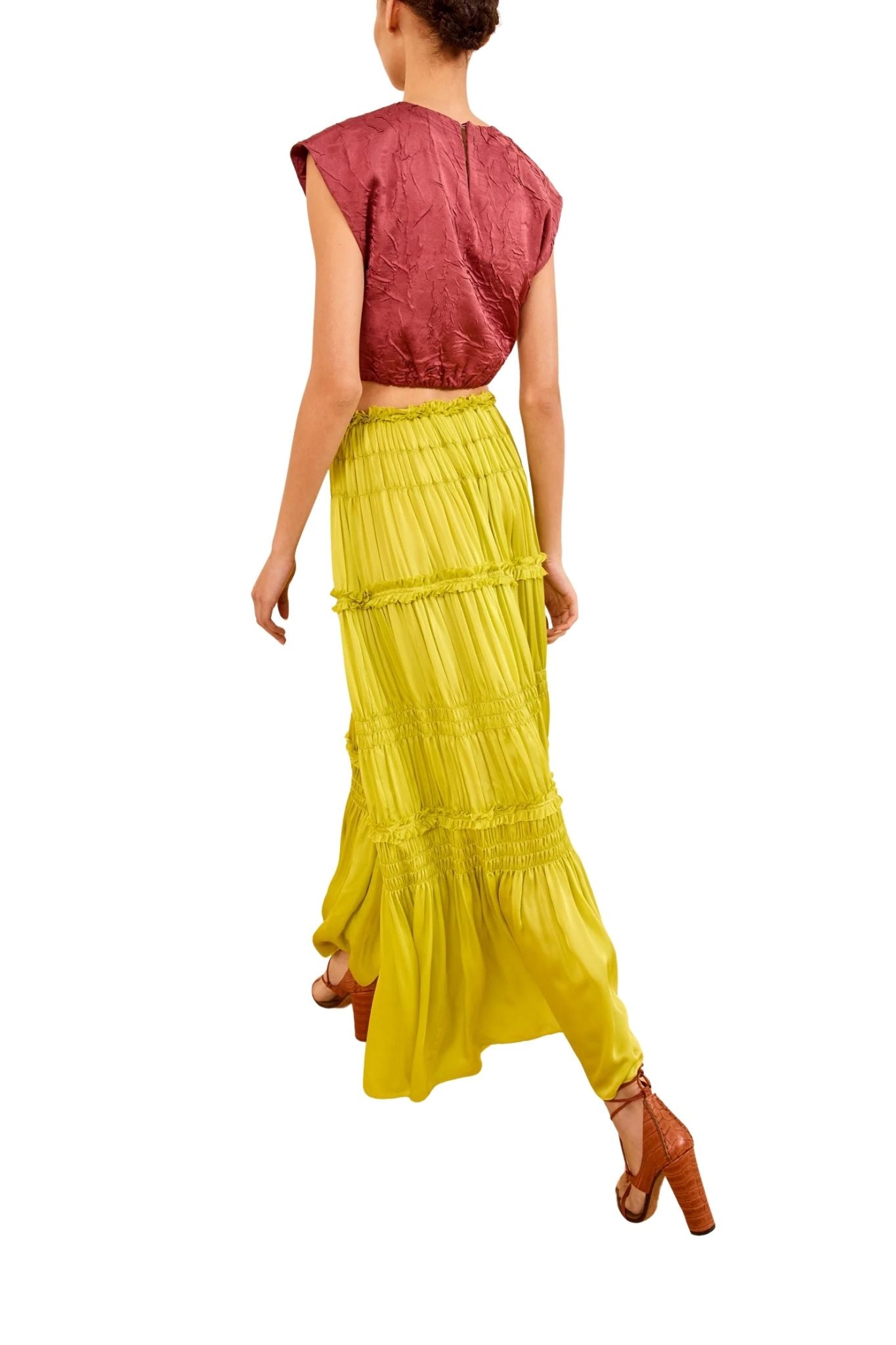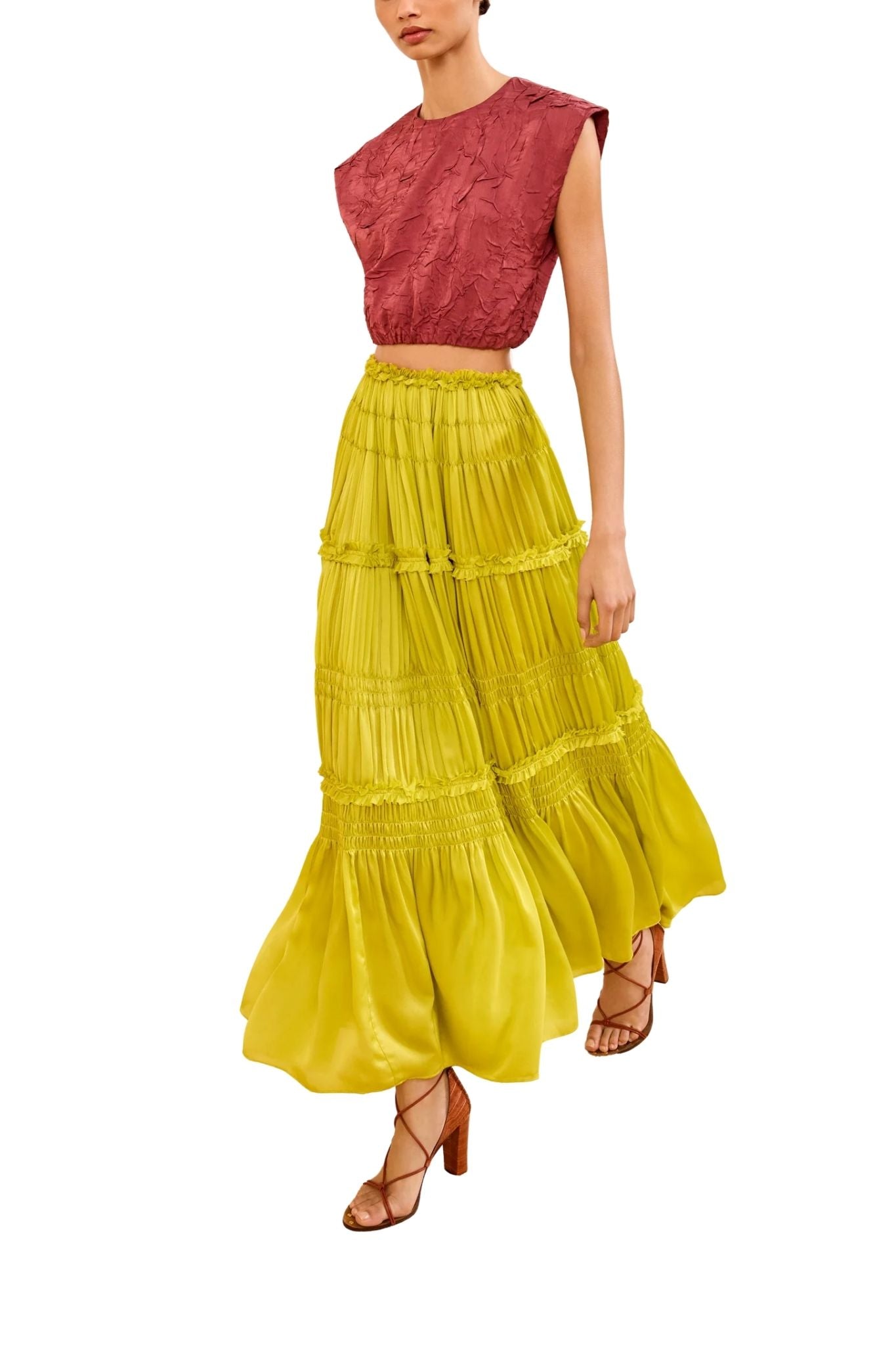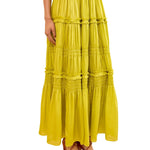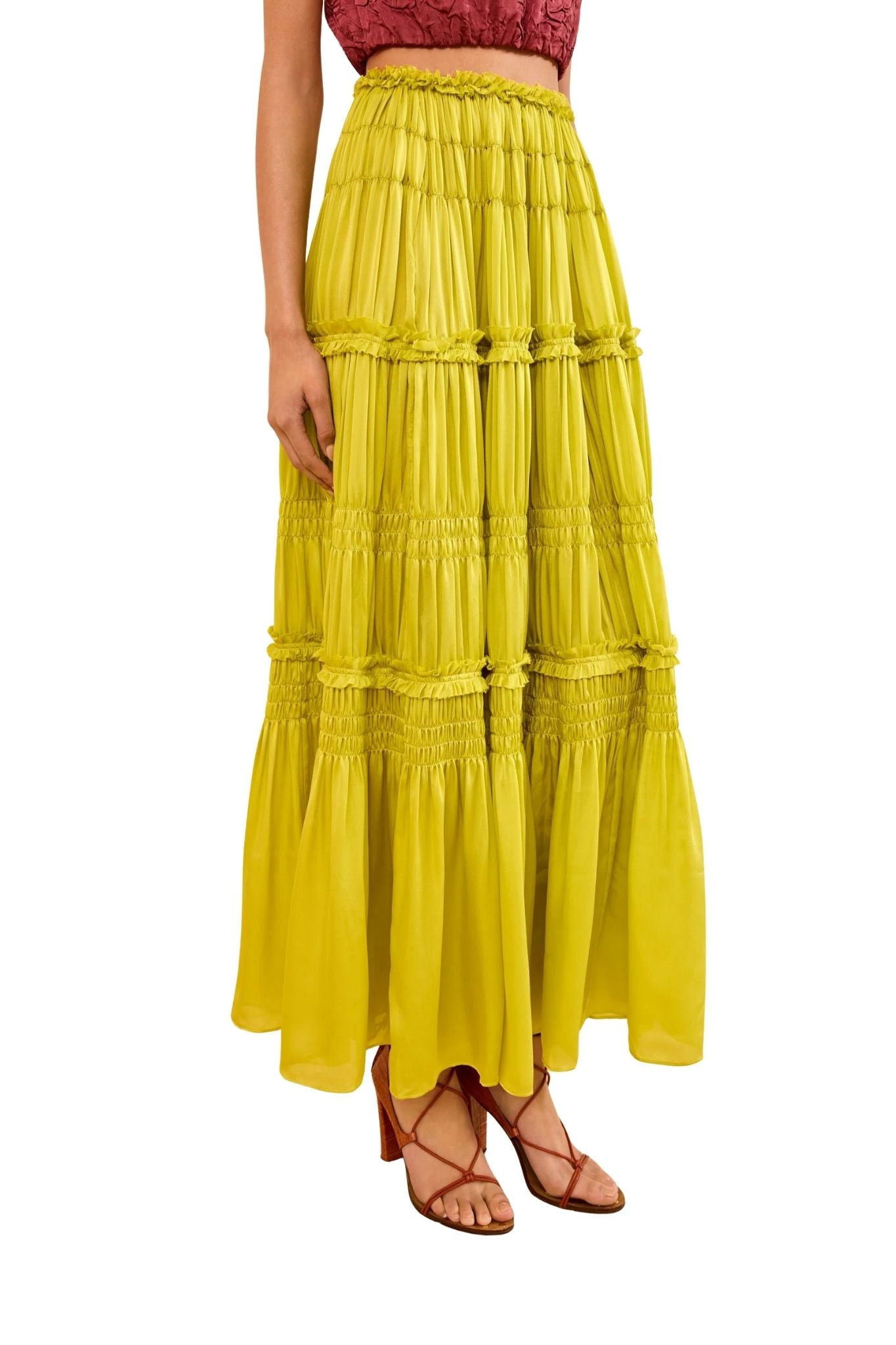 The Virginie Skirt is tailored from gossamer, crinkled chiffon in an uplifting Chartreuse green. Alive in motion, this midi skirt is designed with softly ruched tiers and petite ruffles that create a playful, flowing hemline.