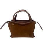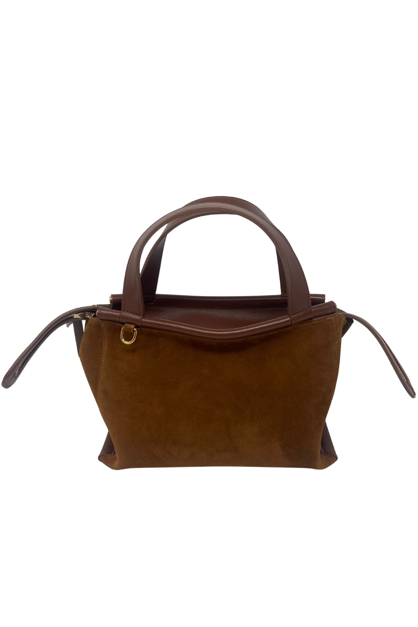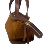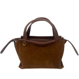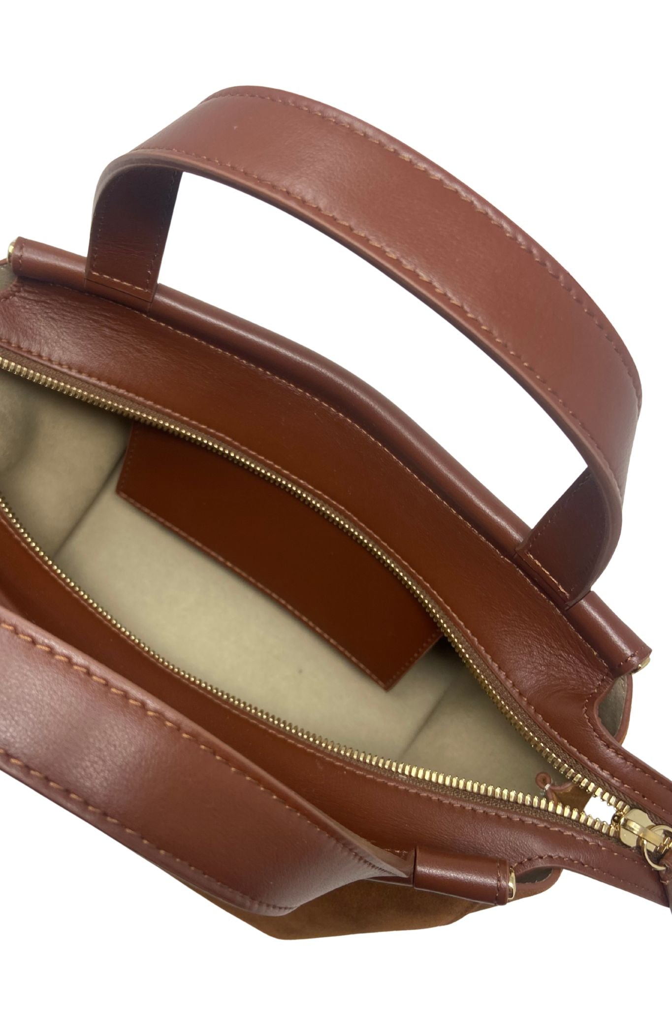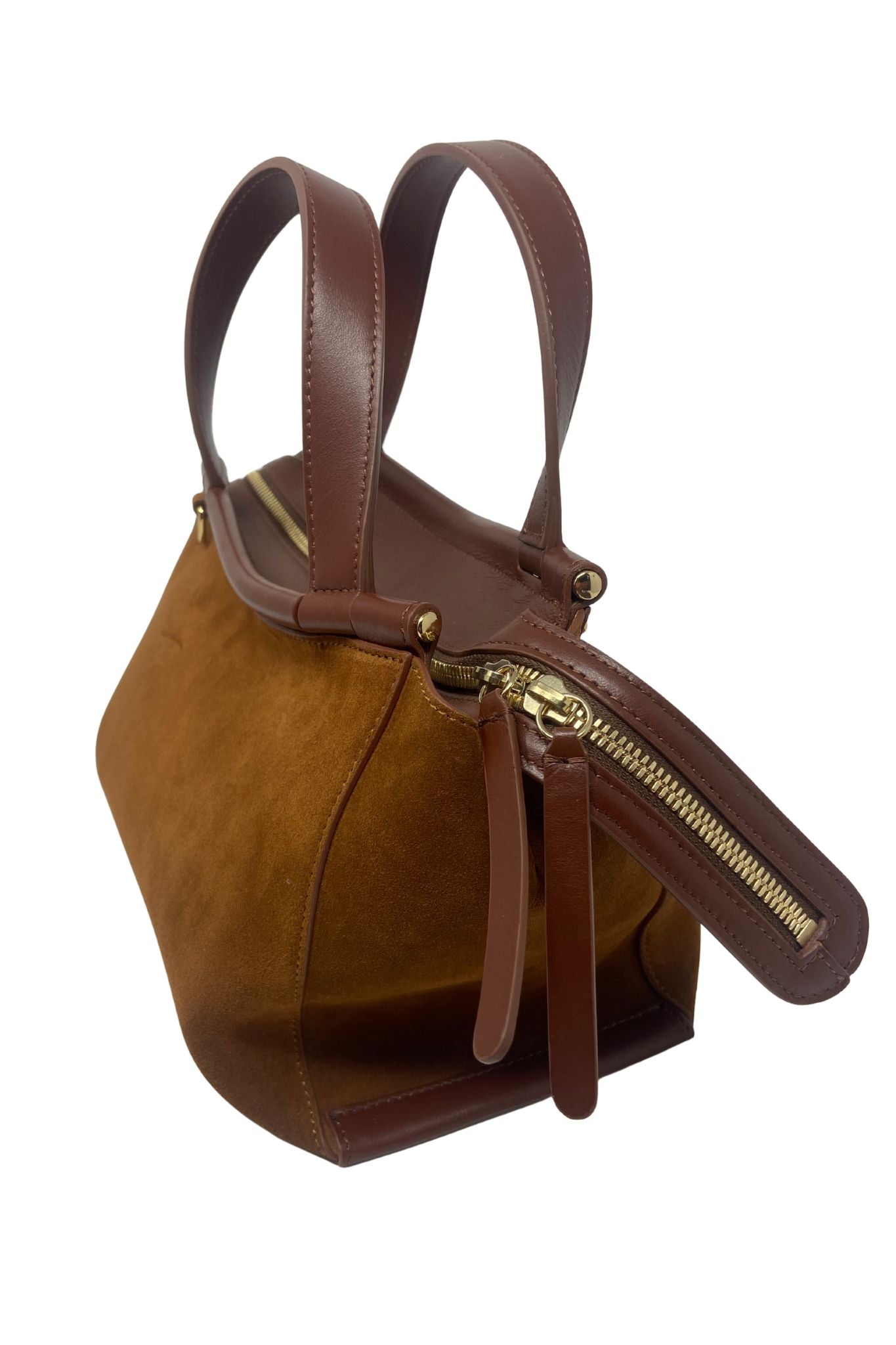 Wandler Ida Bag in tan suede. Features a detachable crossbody strap, gold hardware, main compartment.