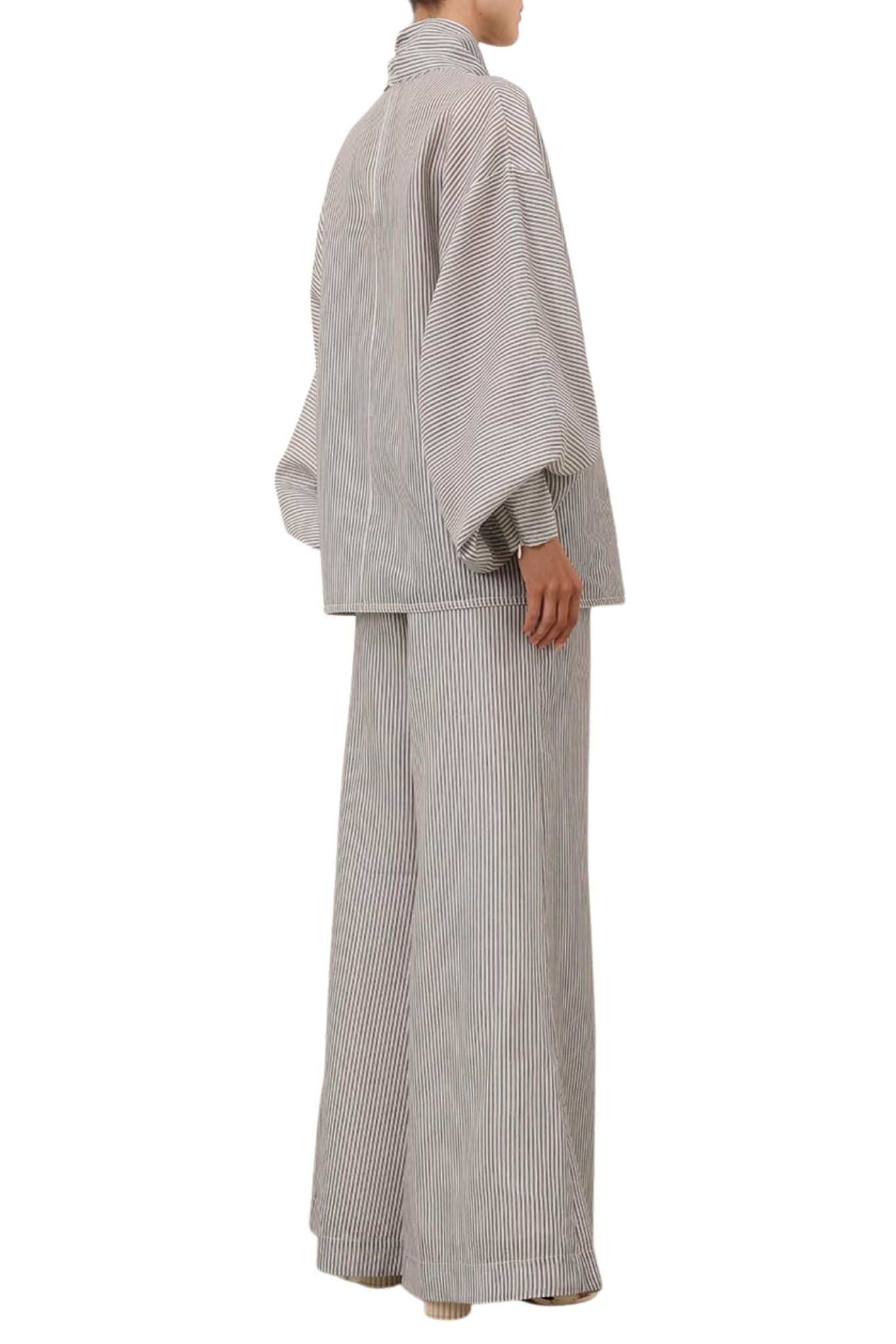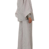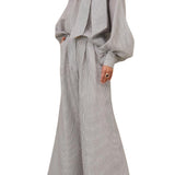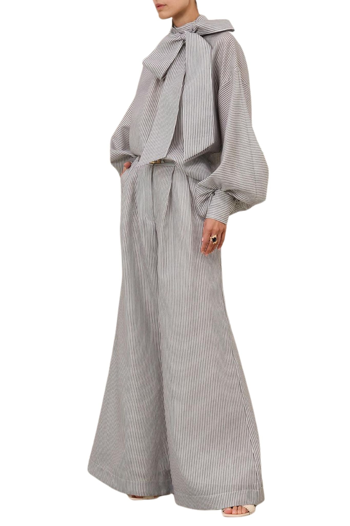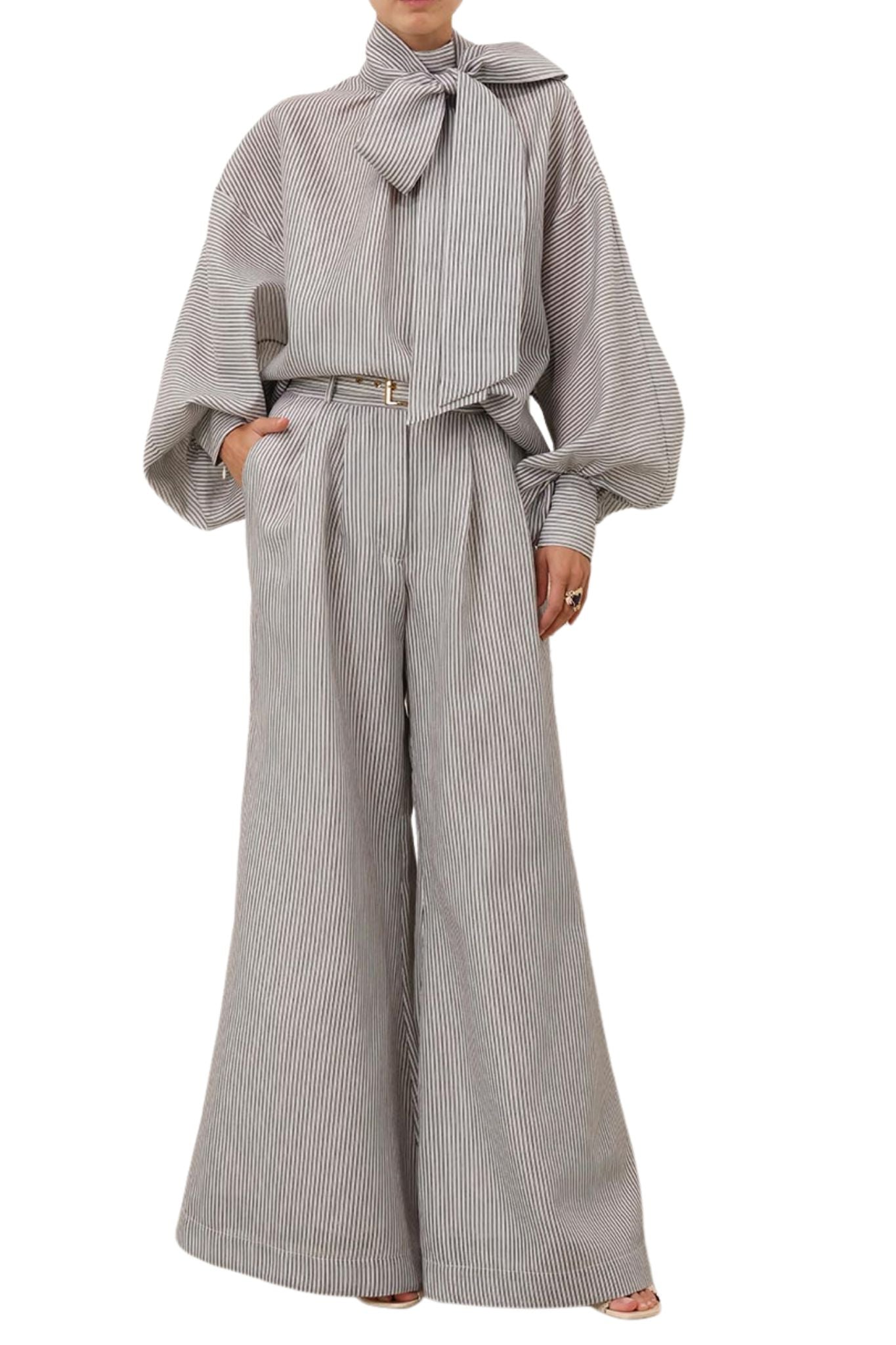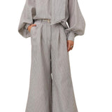 The Hypnotic Striped Blouse in Navy Stripe from our Fall 2025 Collection, Hypnotic. Style the Hypnotic Striped Blouse with the Hypnotic Wide Leg Pant , heeled sandal and a clutch handbag for a more elevated look.
