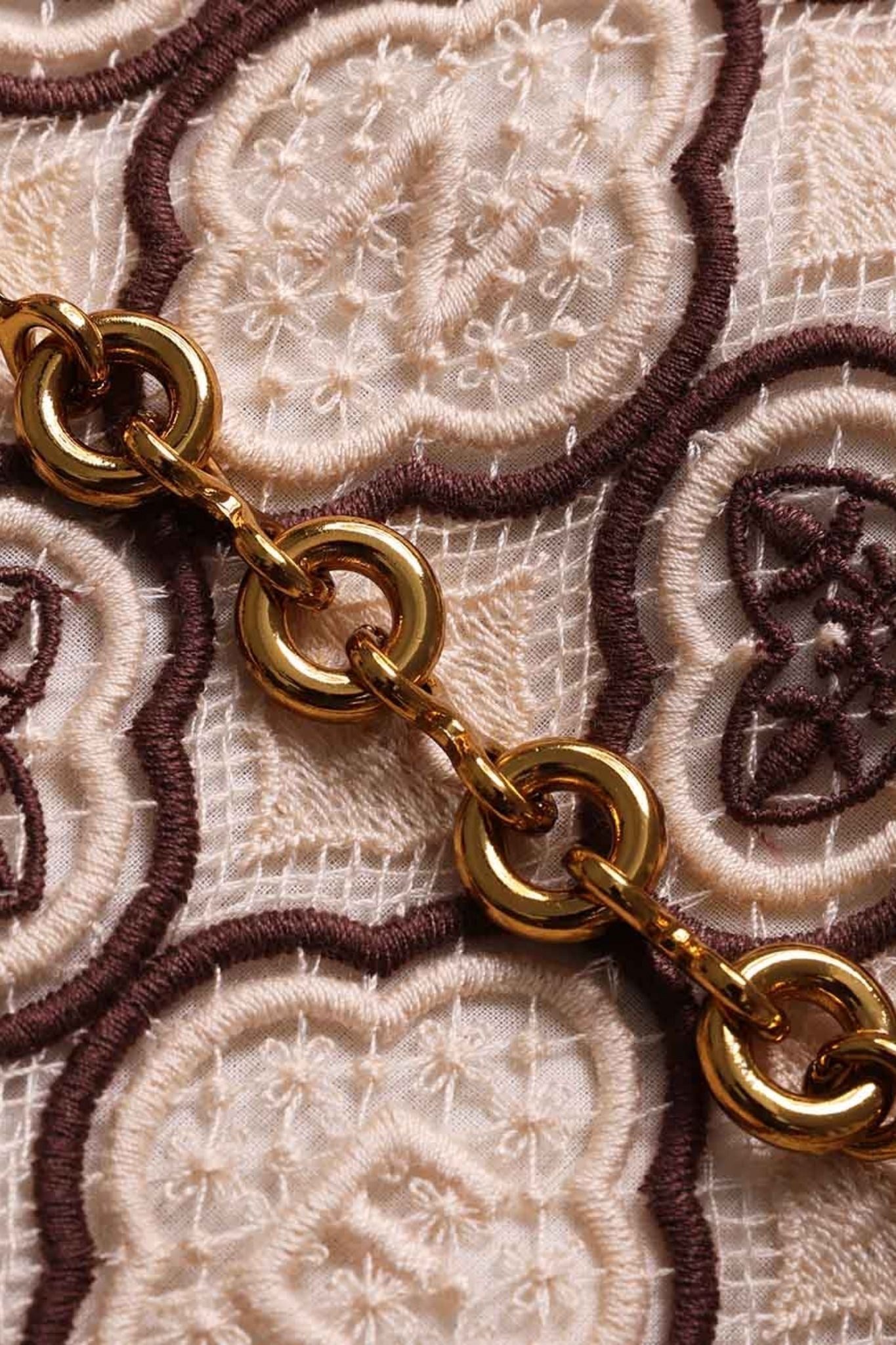 The Luna Guipure Shift Dress in Chocolate Cream from our Spring 2026 Collection, Kindred Spirit. A tunic style mini dress featuring a plunging V-neckline with gold chain detailing, centre back zip closure, finished with piped trim and embroidery throughout.