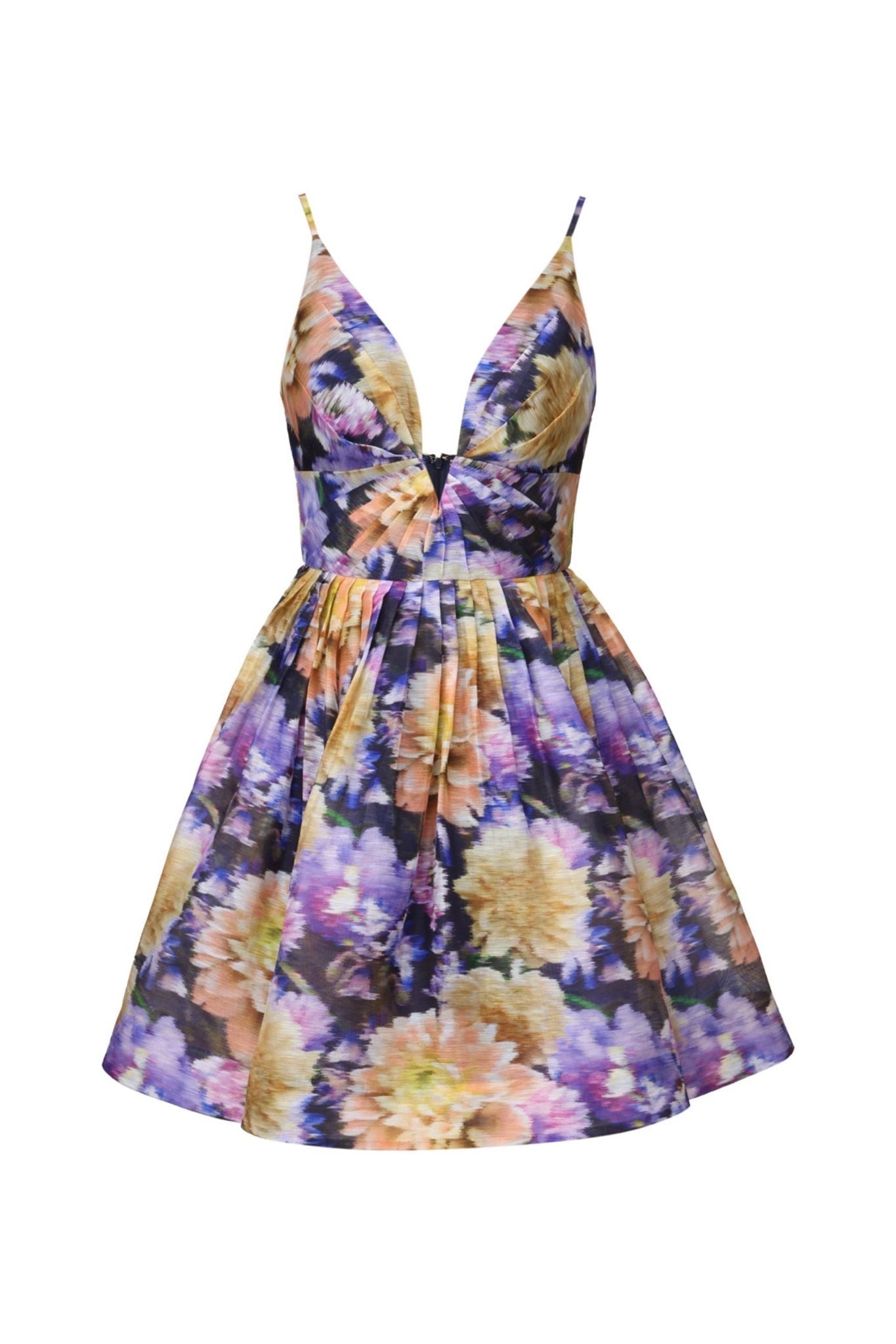 The Luna V Neck Mini Dress in Navy Dahlia from our Spring 2026 Collection, Kindred Spirit. A silk-linen organza mini dress featuring a plunging V-neckline, adjustable straps, finished with a shirred back bodice and flare style skirt.