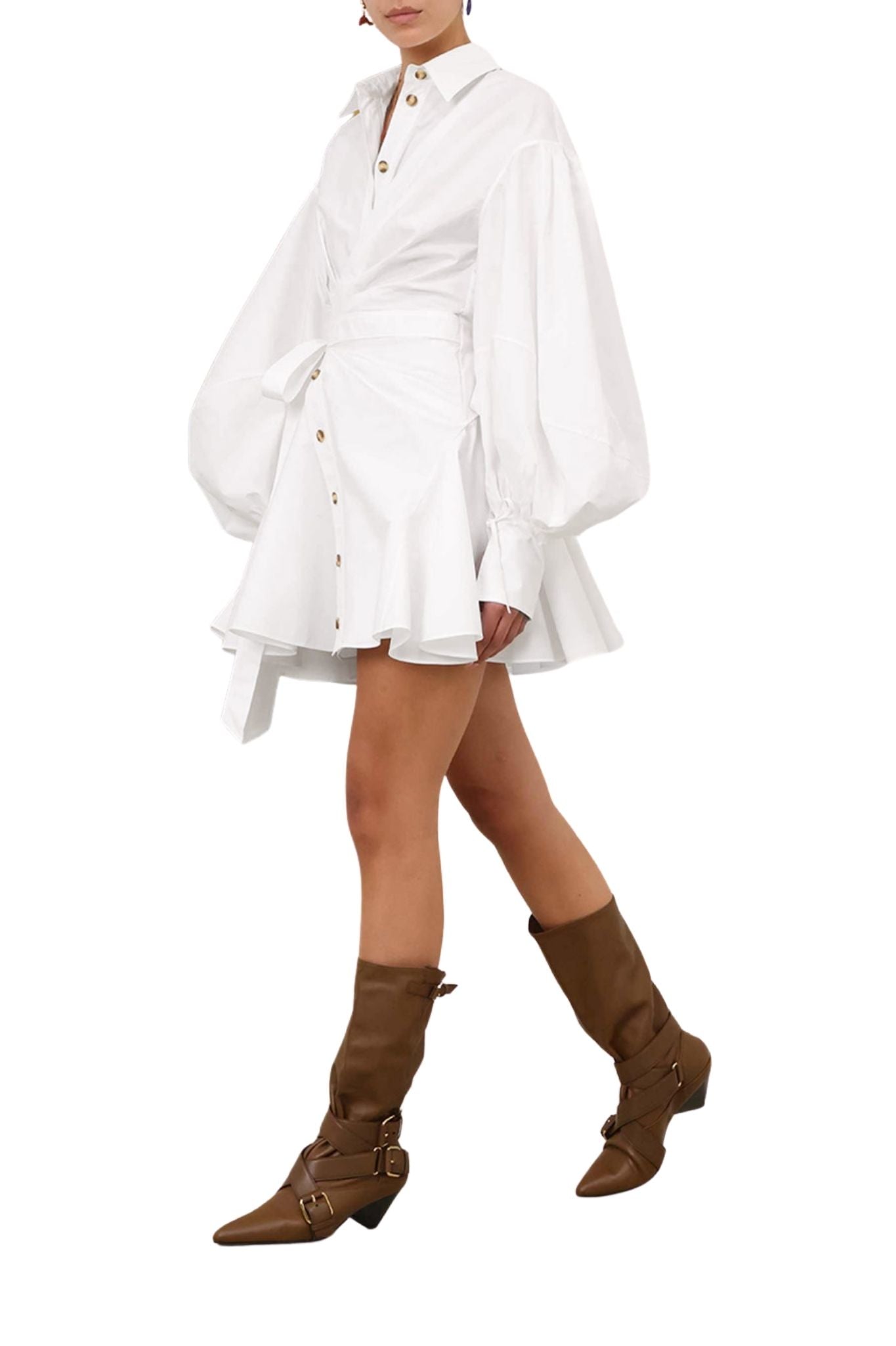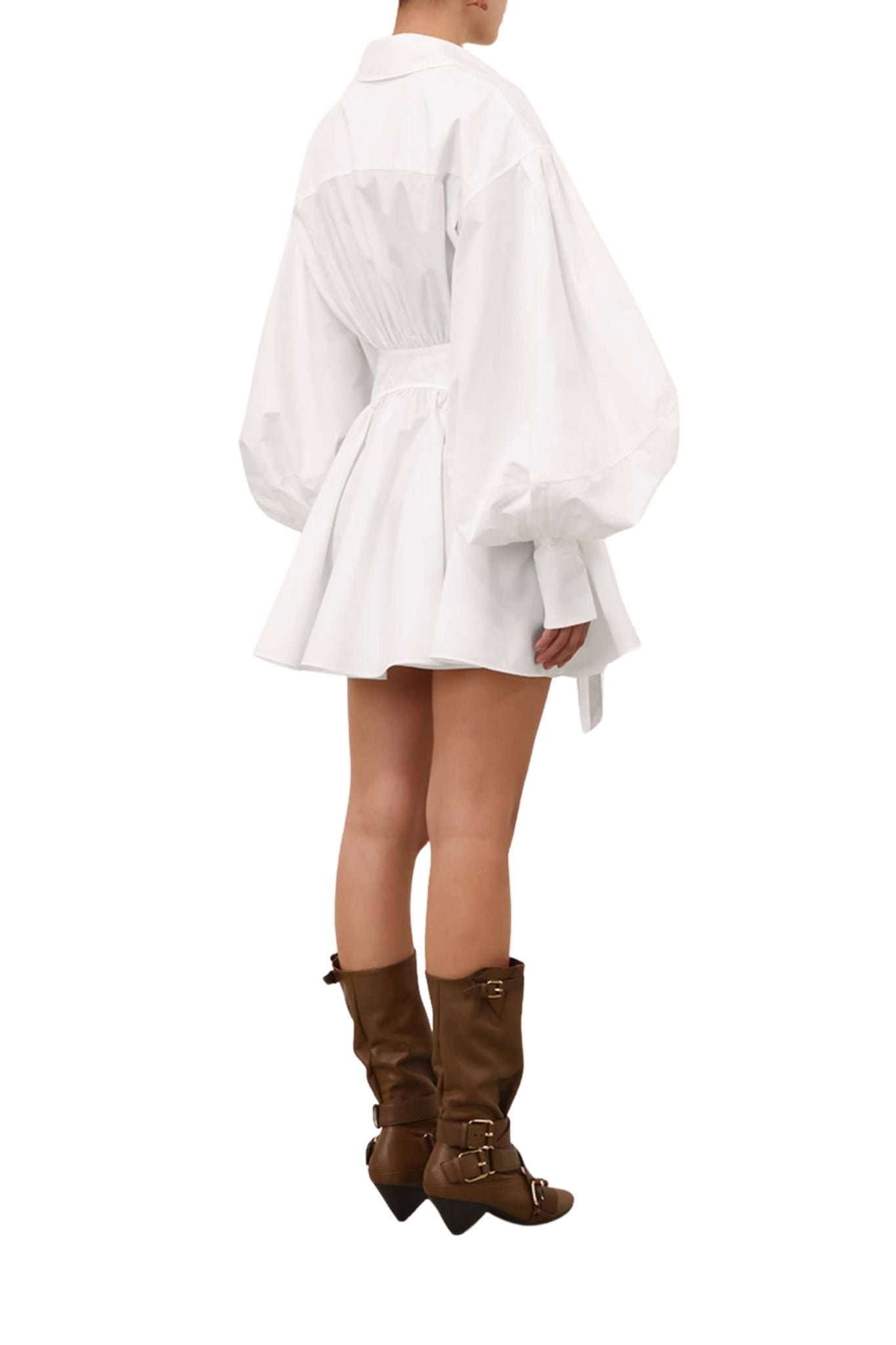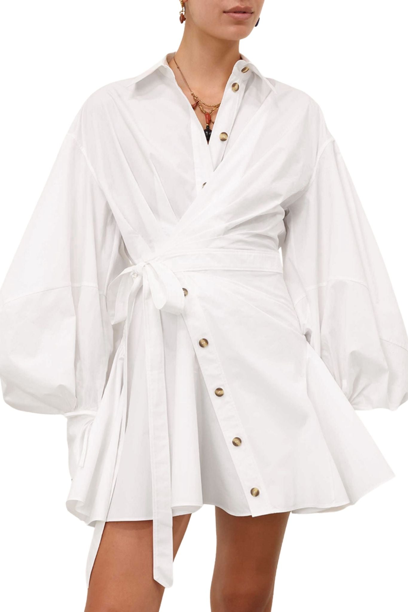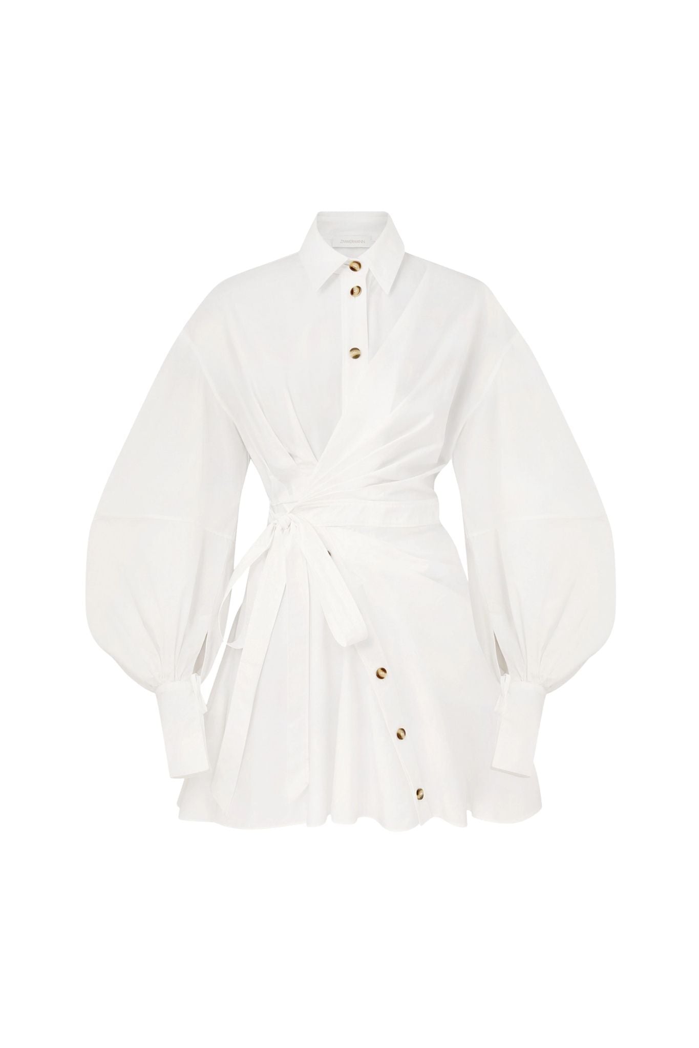 The Rebellion Poplin Mini Dress in Ivory from our Cruise 2026 Collection, Twisted Romance. A cotton mini dress featuring a wrap waist belt, long blouson sleeves, buttons down the centre front and heavy gathering throughout.